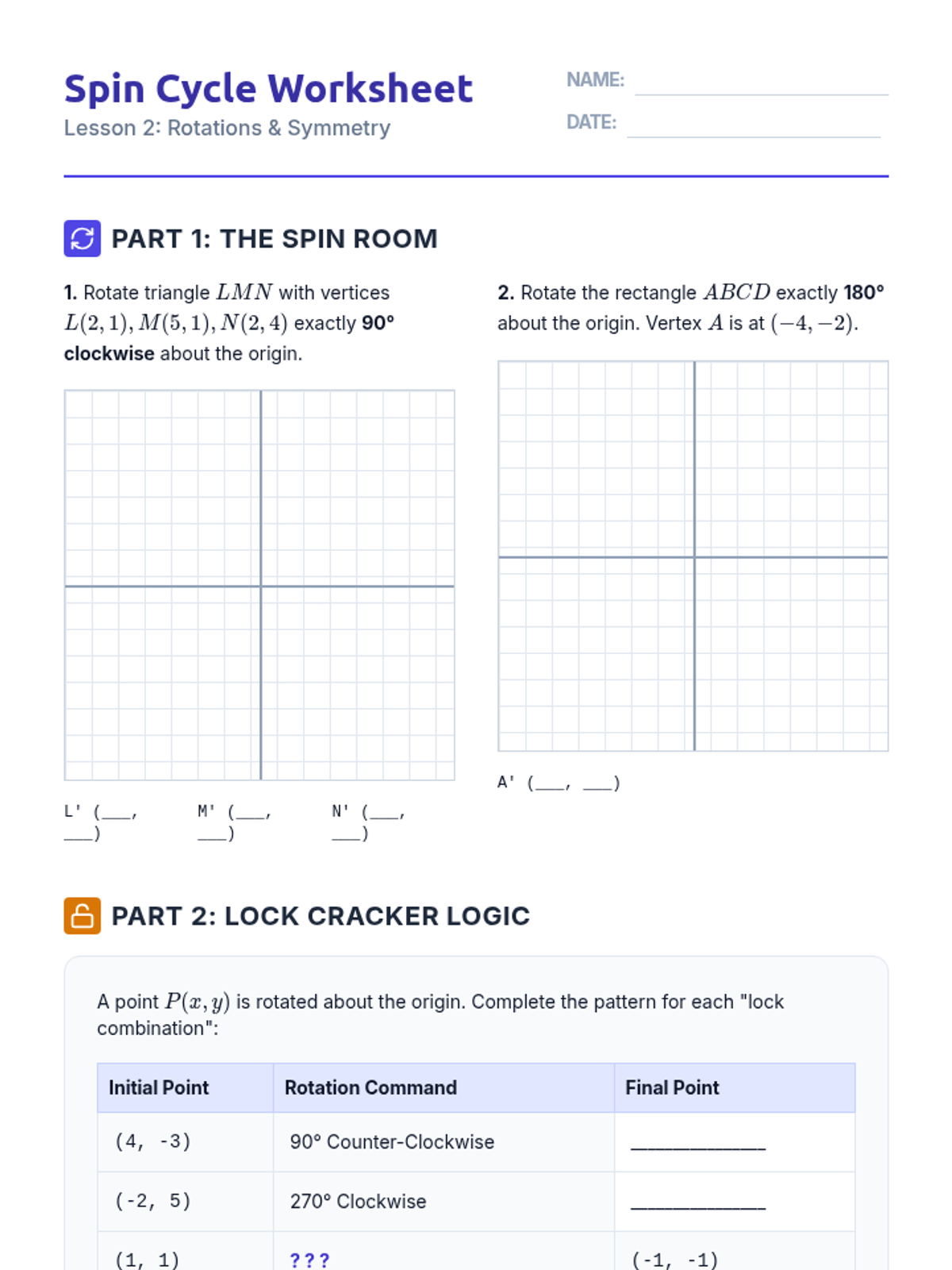 A comprehensive geometry unit focused on rigid transformations: translations, reflections, and rotations. Students explore how shapes move across the coordinate plane while maintaining their size and shape.