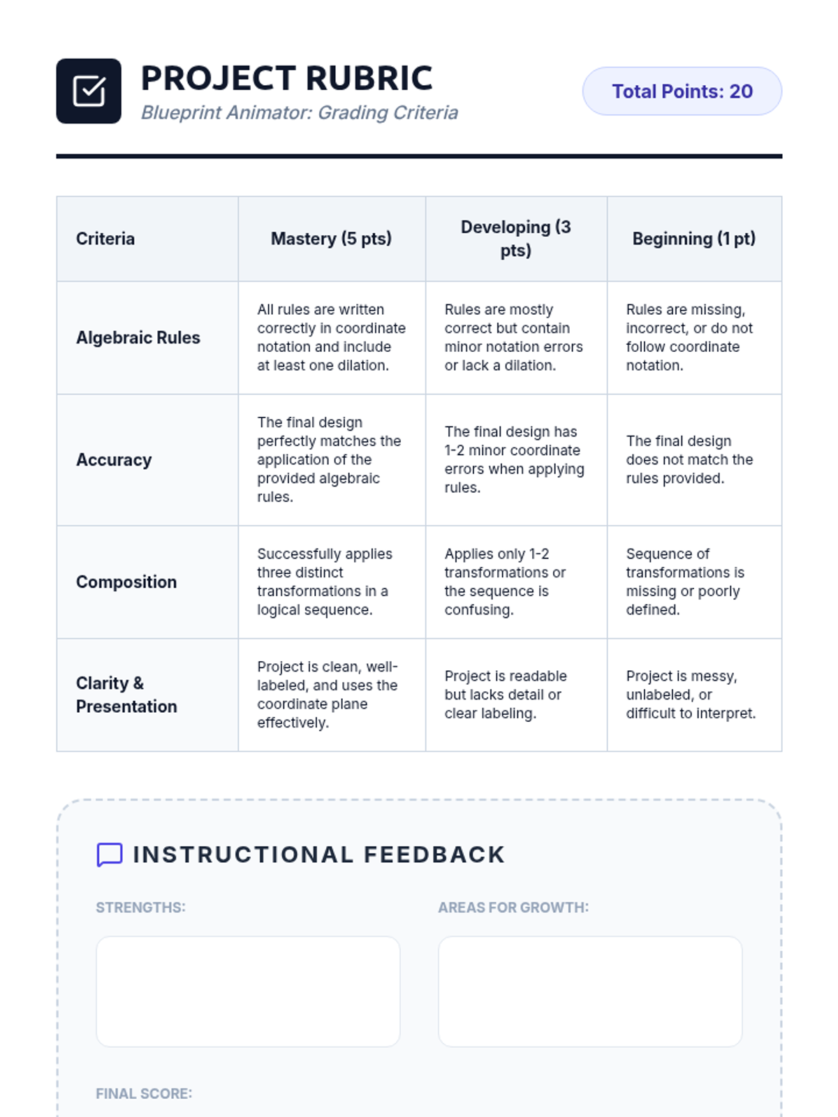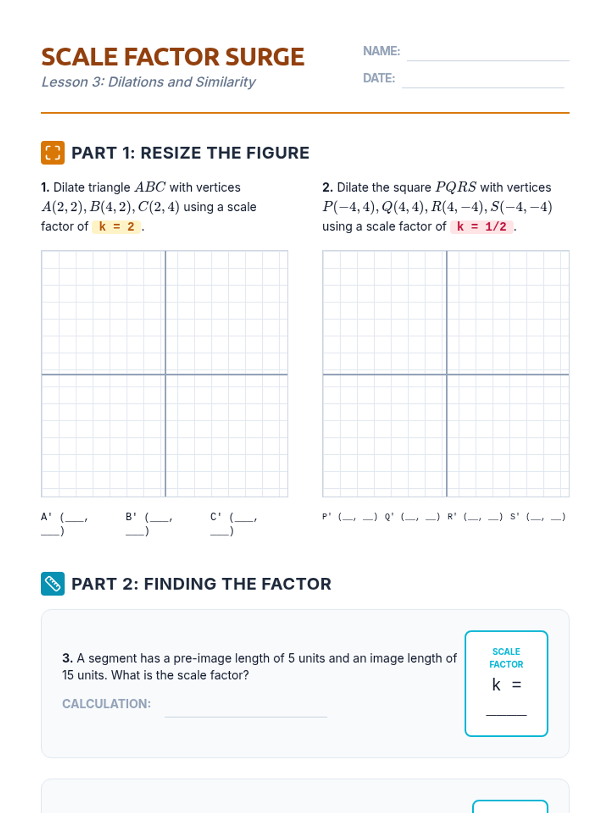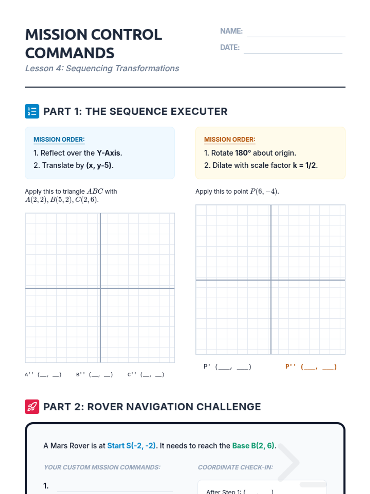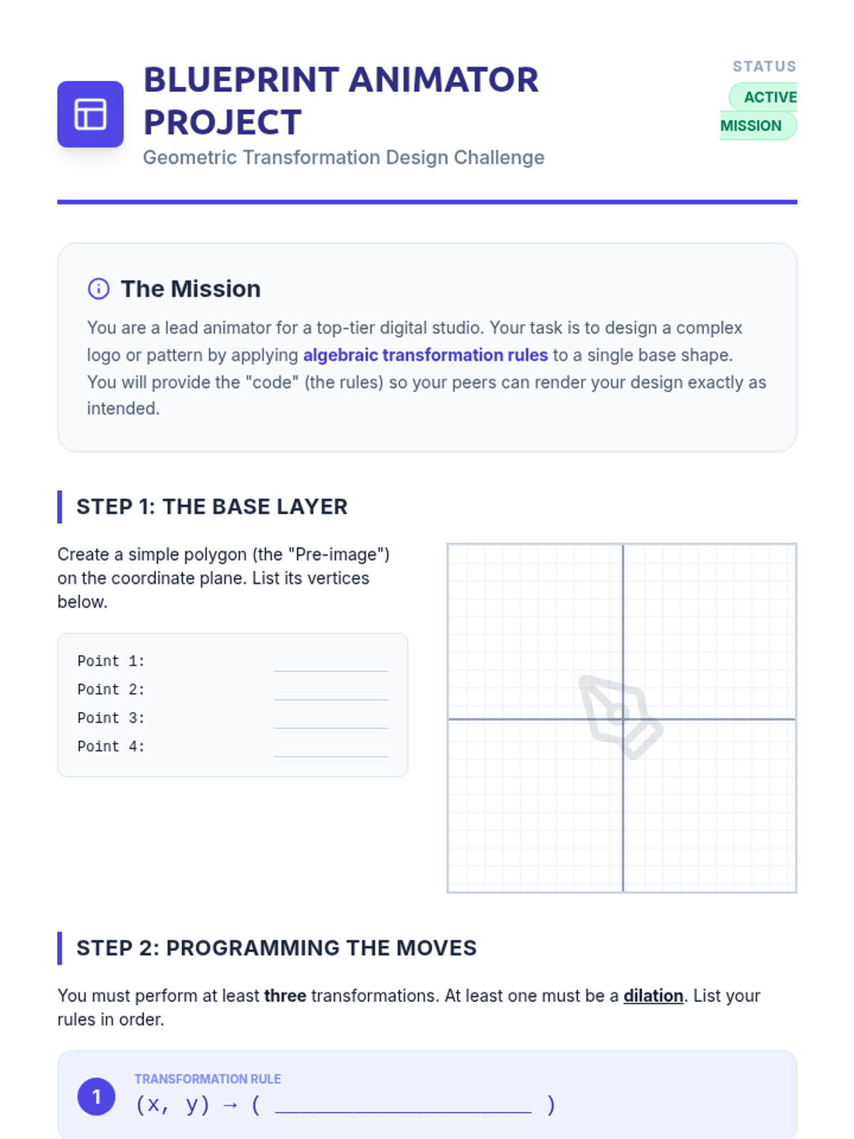 A comprehensive 8th-grade geometry sequence exploring translations, reflections, rotations, and dilations on the coordinate plane. Students move from rigid transformations to similarity through inquiry-based activities and design challenges.