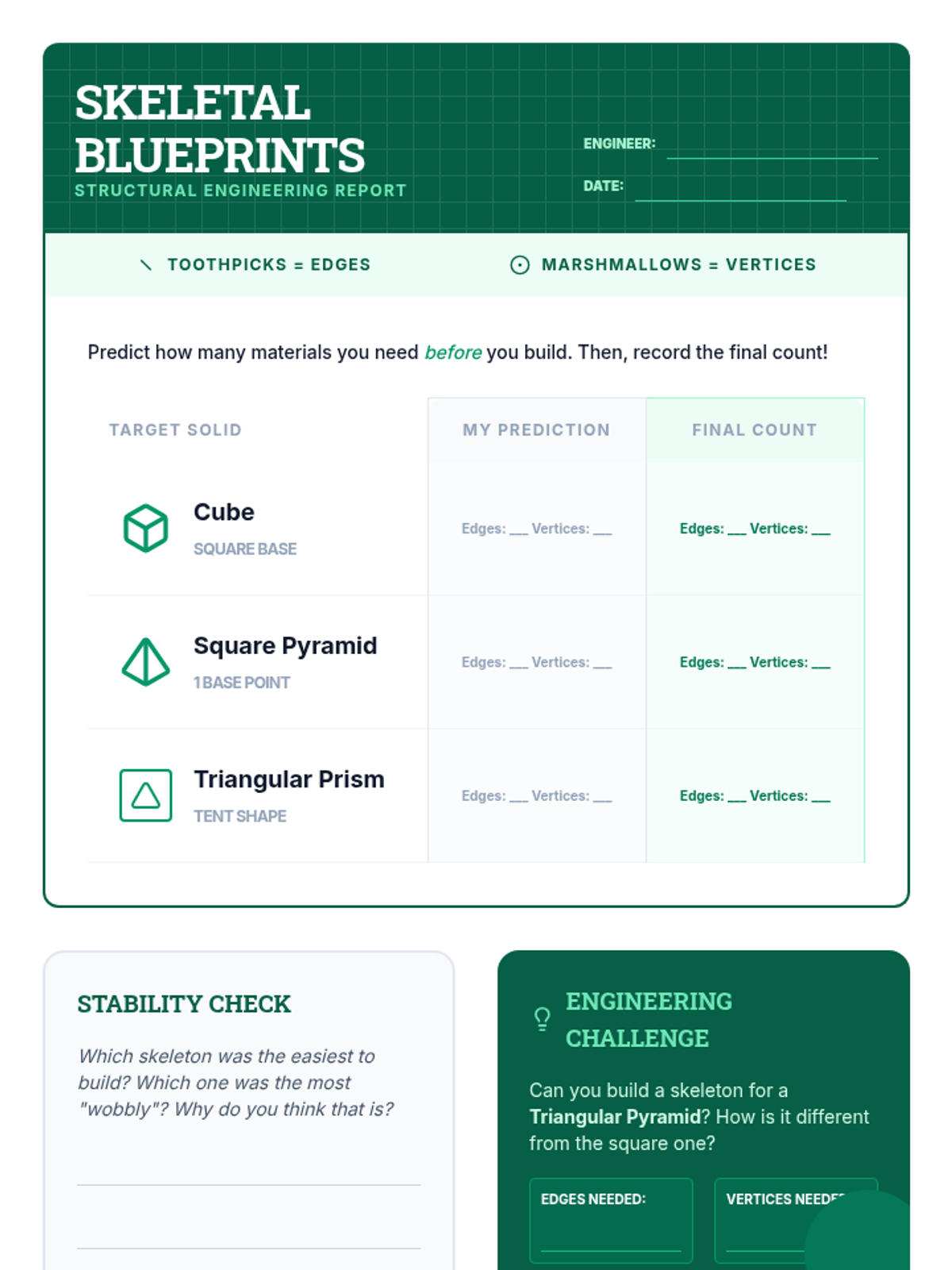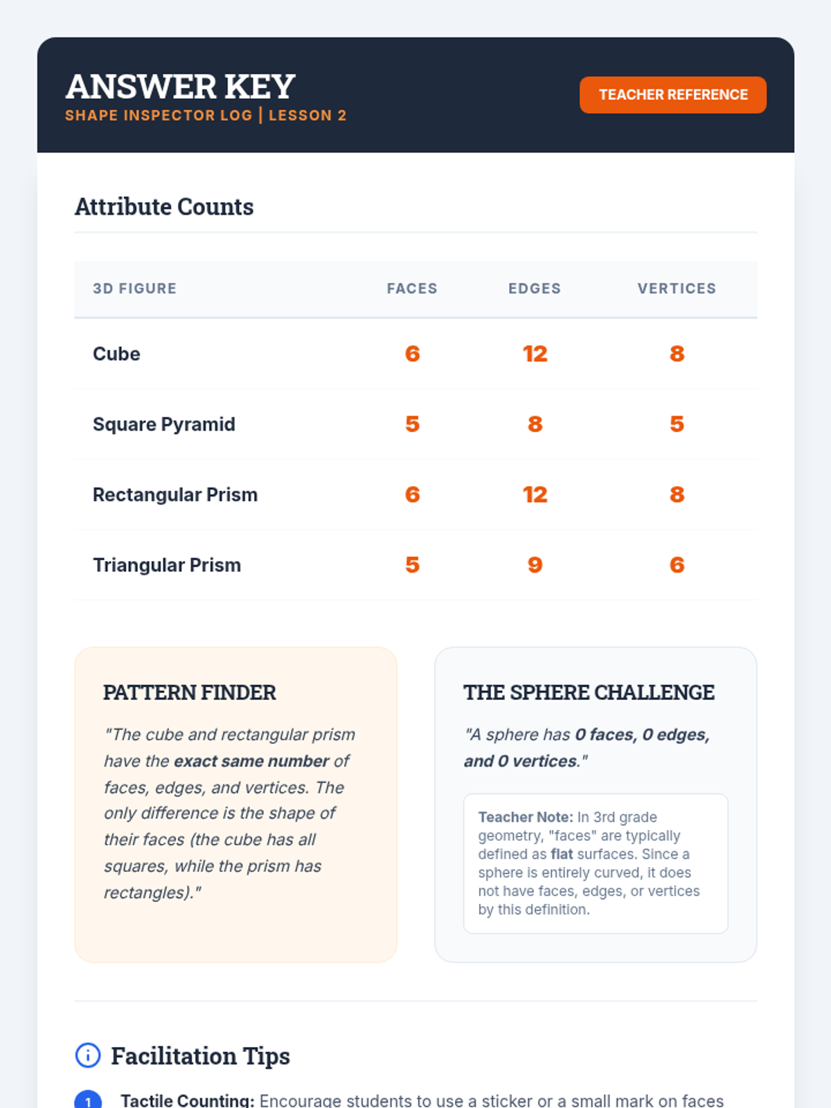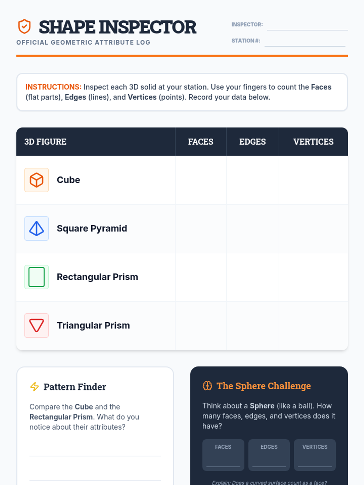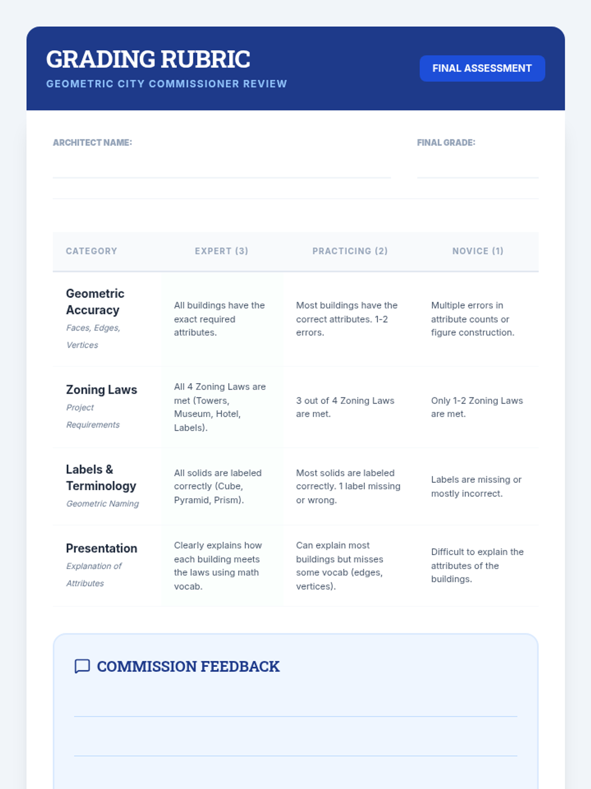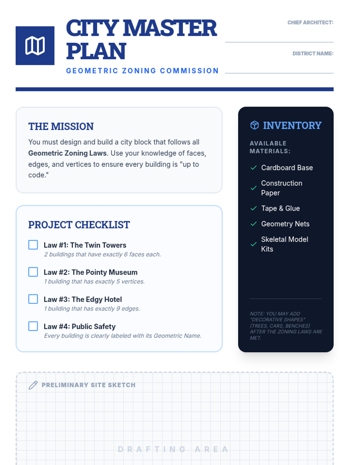 This hands-on geometry sequence guides 3rd-grade students from 2D understanding to 3D construction. Students identify attributes (faces, edges, vertices), build skeletal models, explore nets, and culminate in designing a 'Geometric City' based on specific architectural 'zoning laws.'