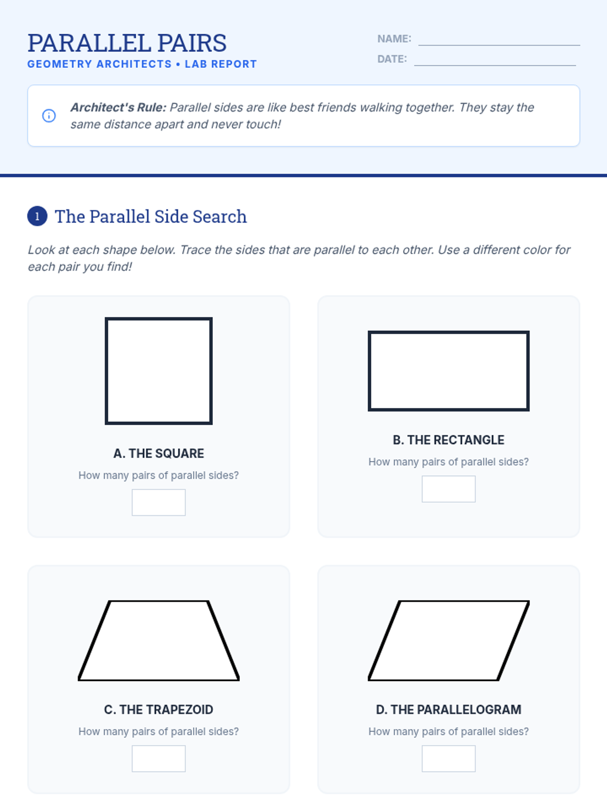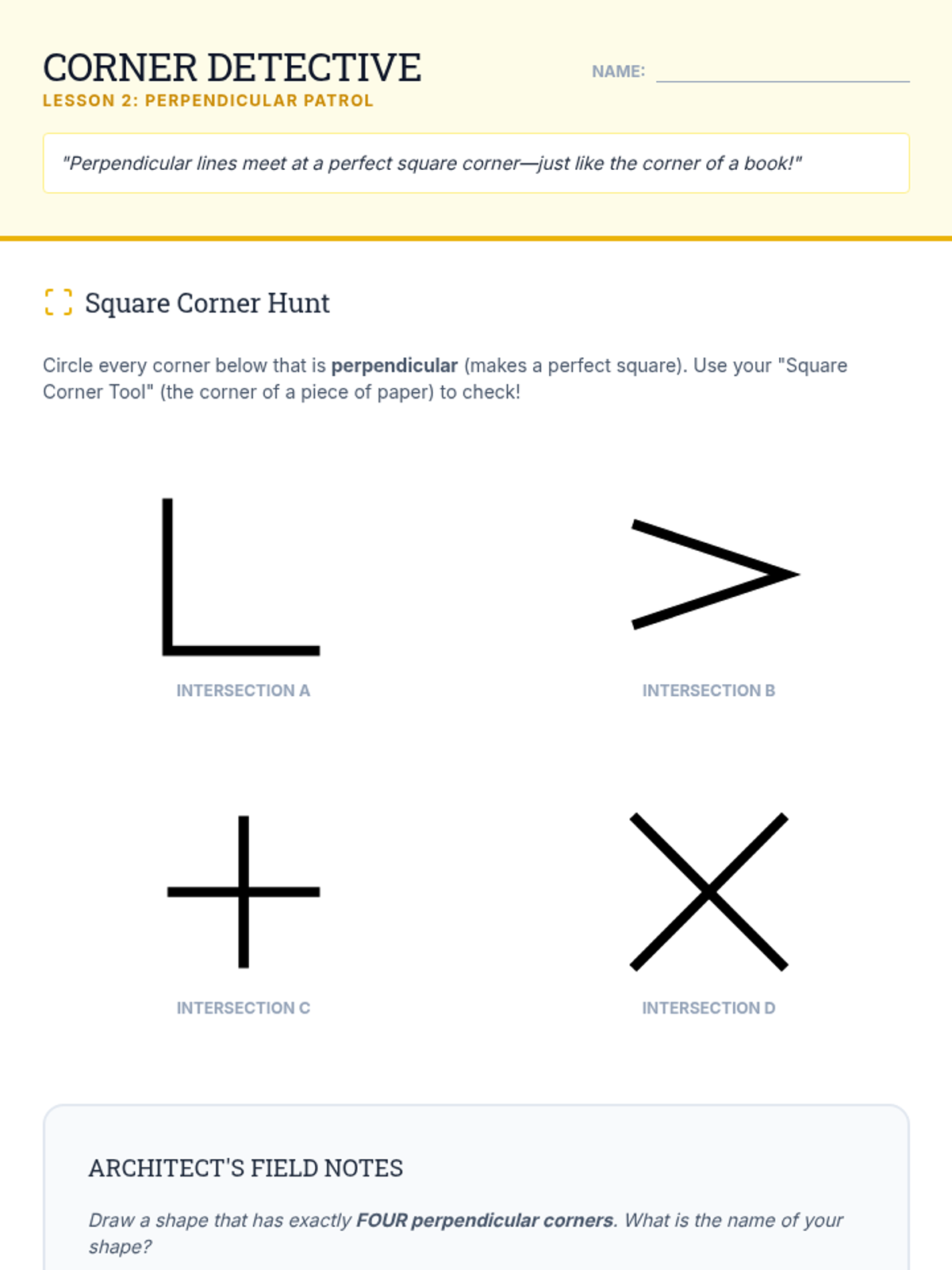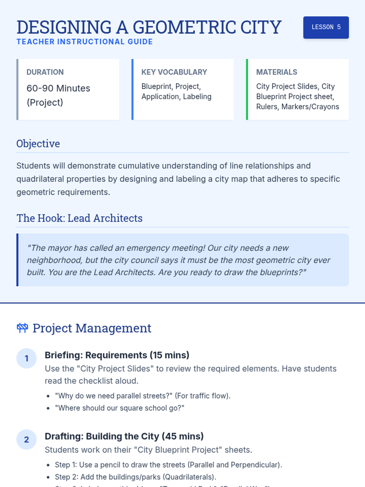 A two-week enrichment project where students act as architects to research, design, and calculate the geometry of a modern structure. The project covers points, lines, angles, and 2D shape classification through real-world application and creative design.