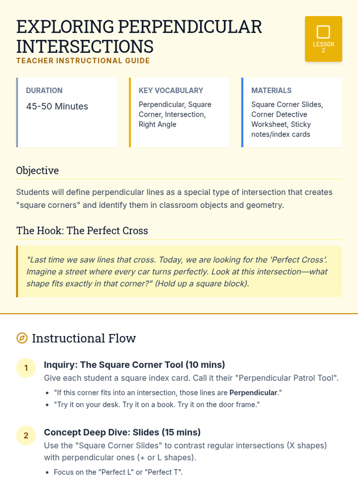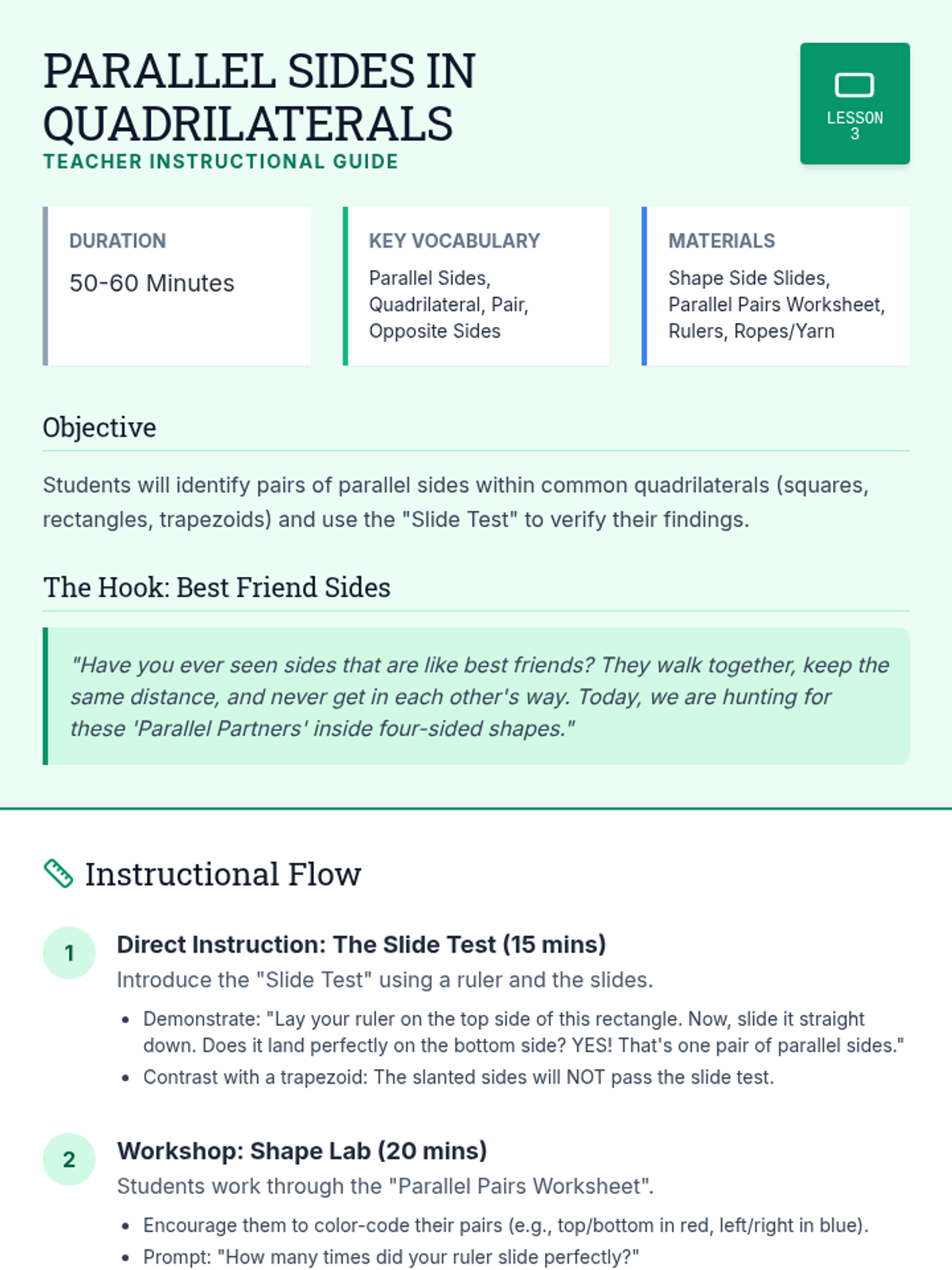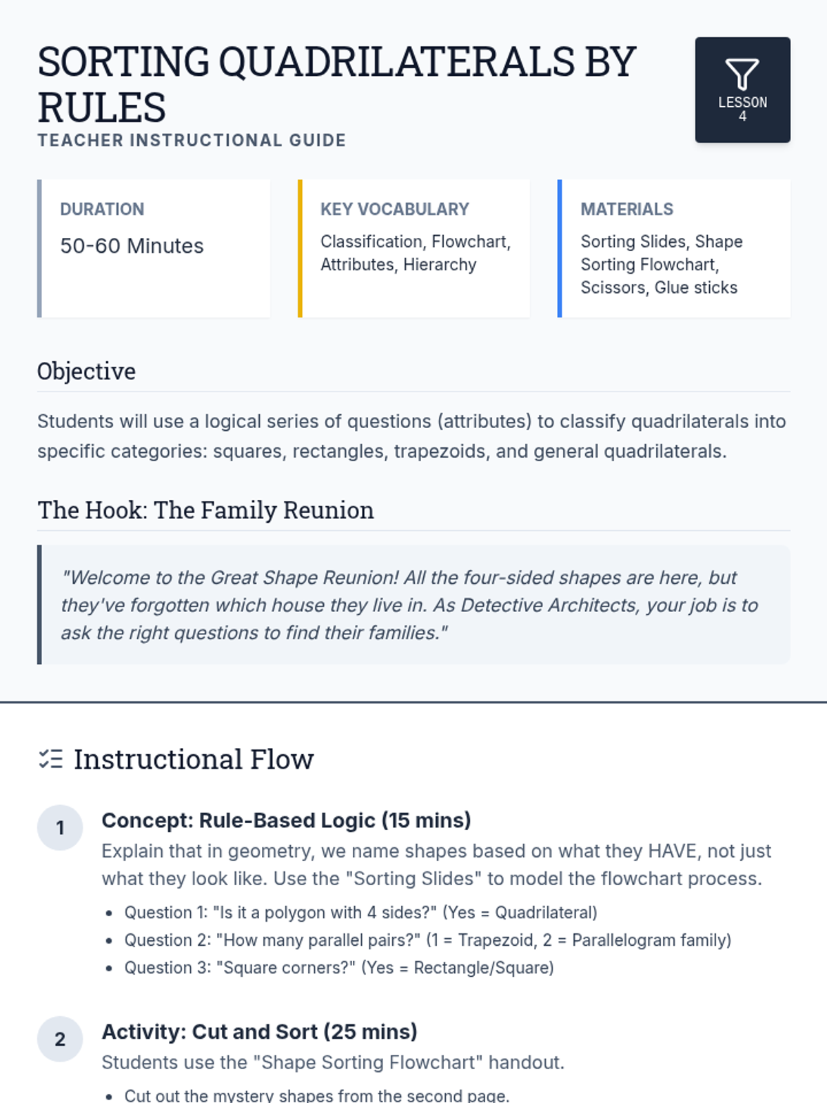 This sequence connects parallel and perpendicular lines to the properties of quadrilaterals through a 'City Map' theme, scaffolding vocabulary from basic line relationships to complex shape classification.