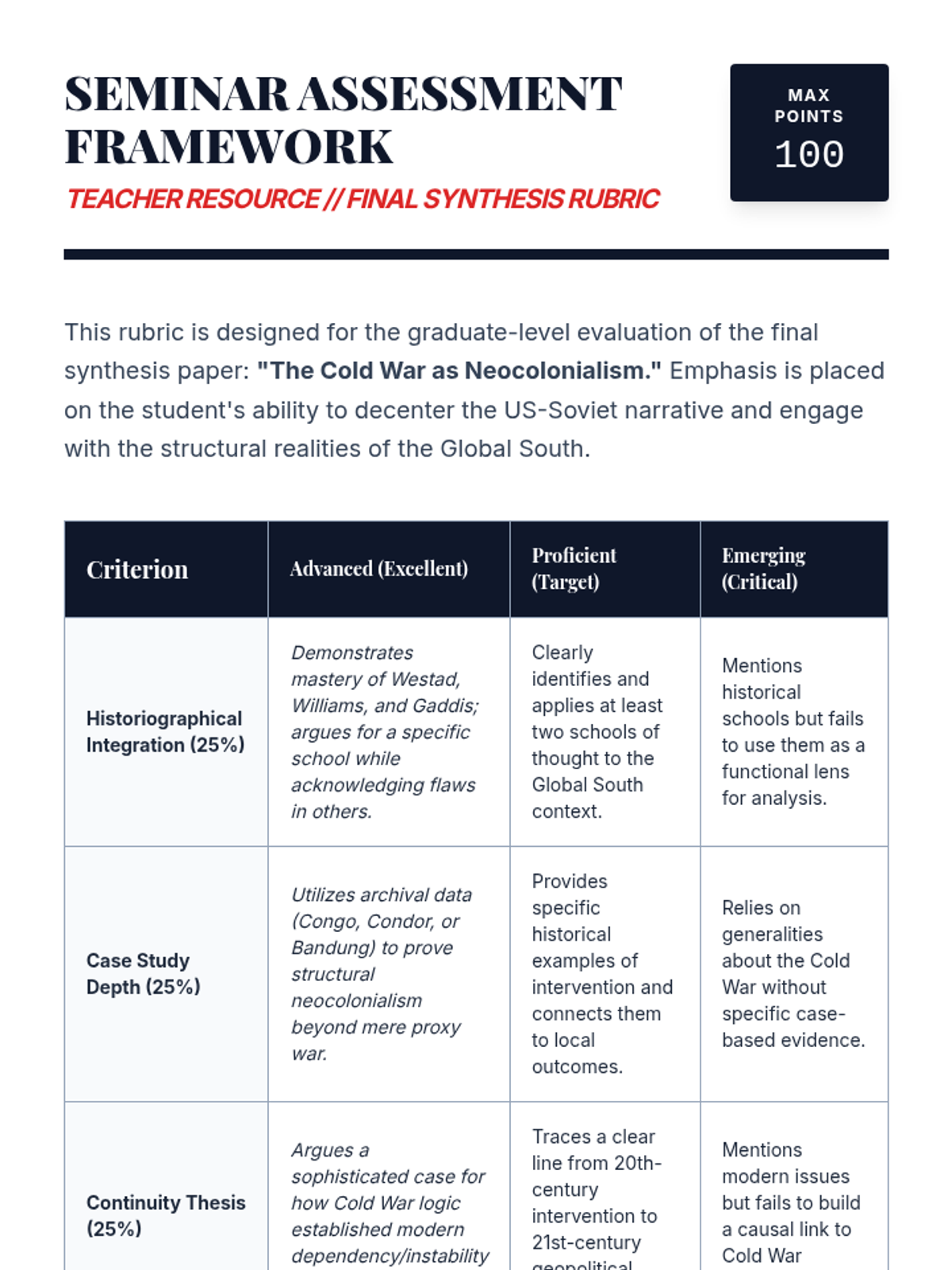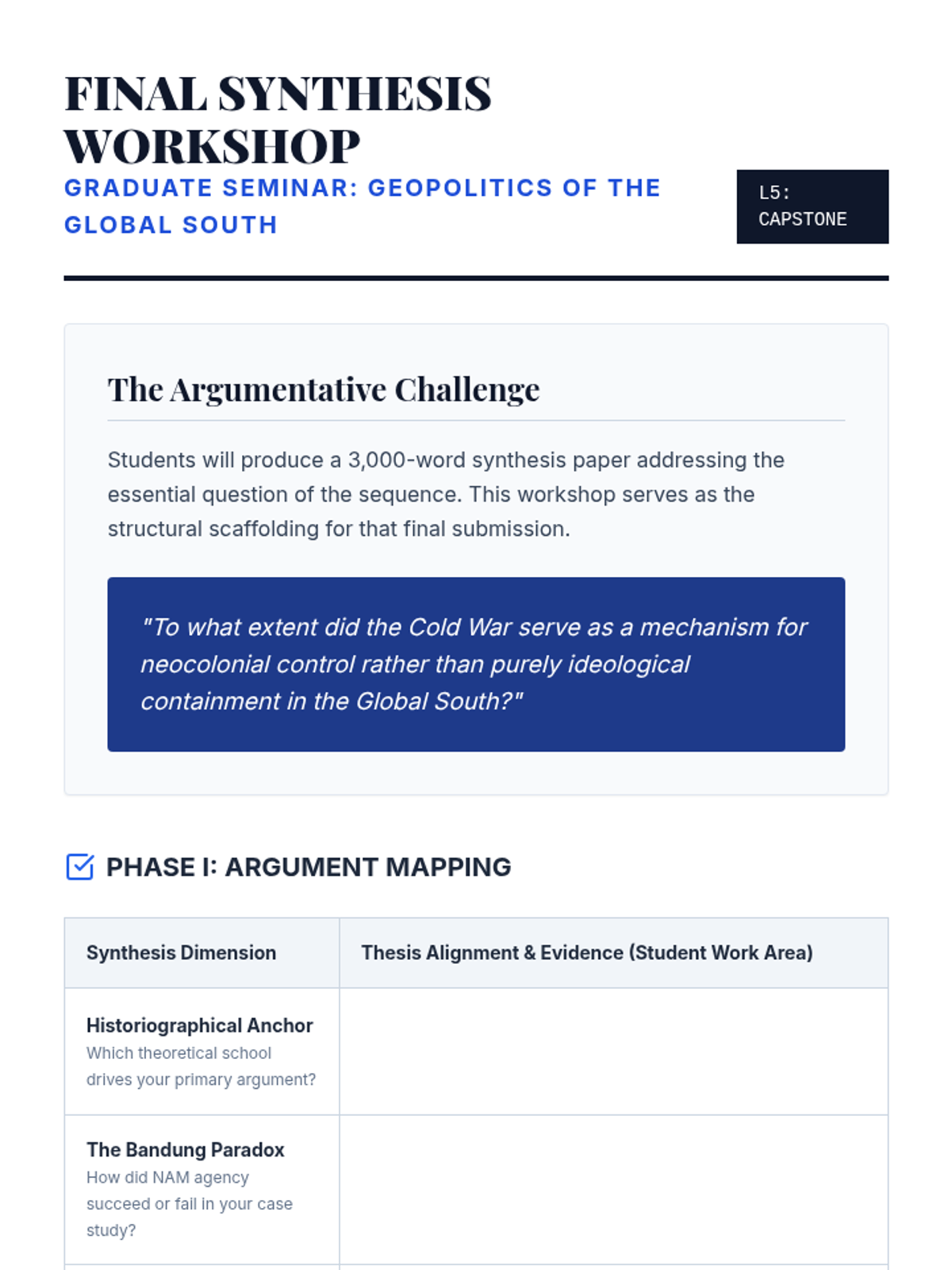 An advanced graduate seminar sequence analyzing the Cold War through the lens of the Global South, focusing on historiography, non-alignment, and the legacies of superpower interventions.