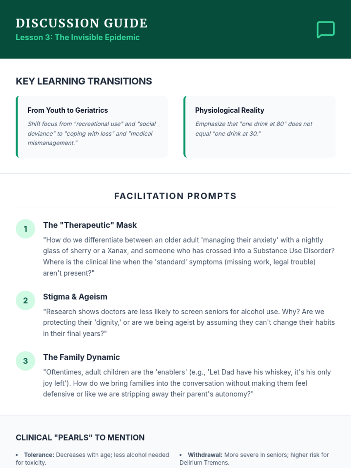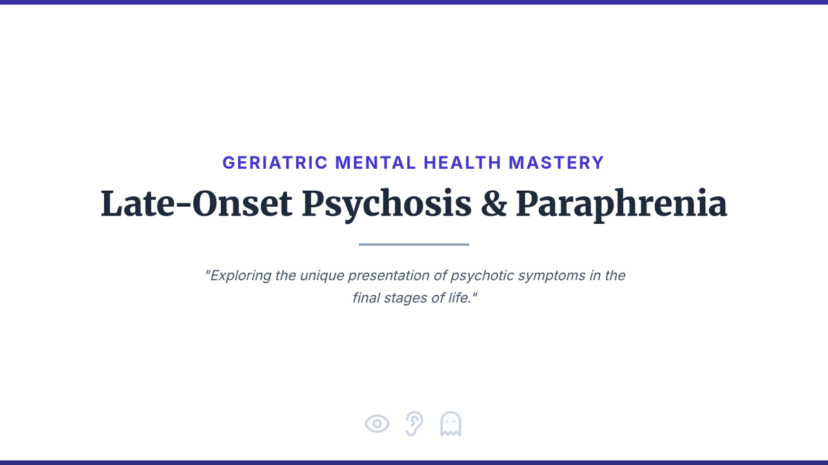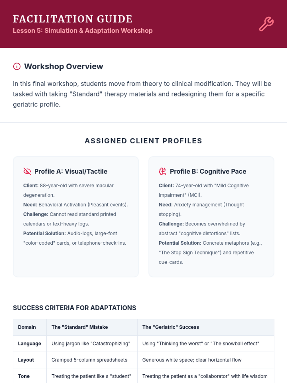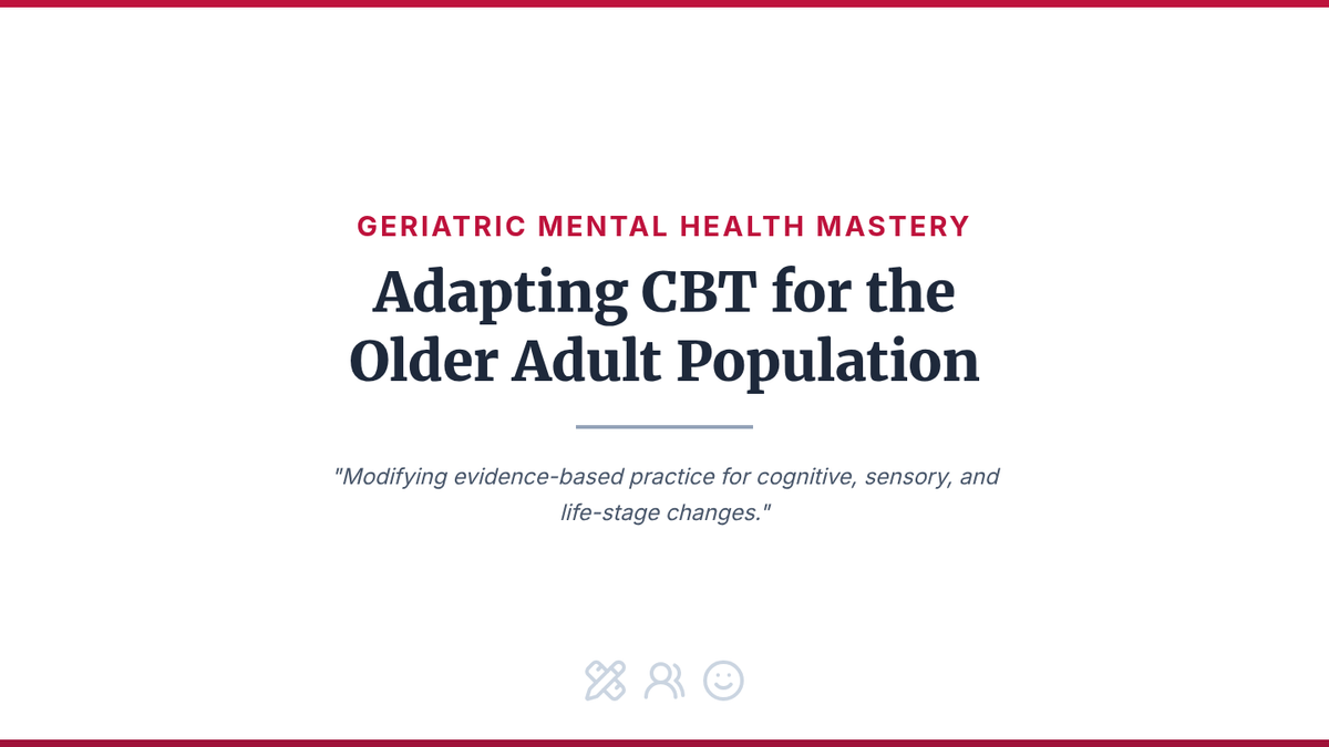 This clinical sequence for graduate students focuses on the unique presentation, assessment, and treatment of mental health disorders in older adults. It emphasizes differential diagnosis, pharmacological considerations, and the adaptation of evidence-based interventions like CBT for the geriatric population.