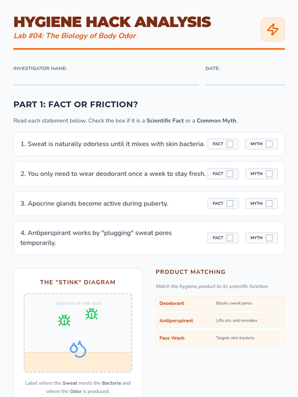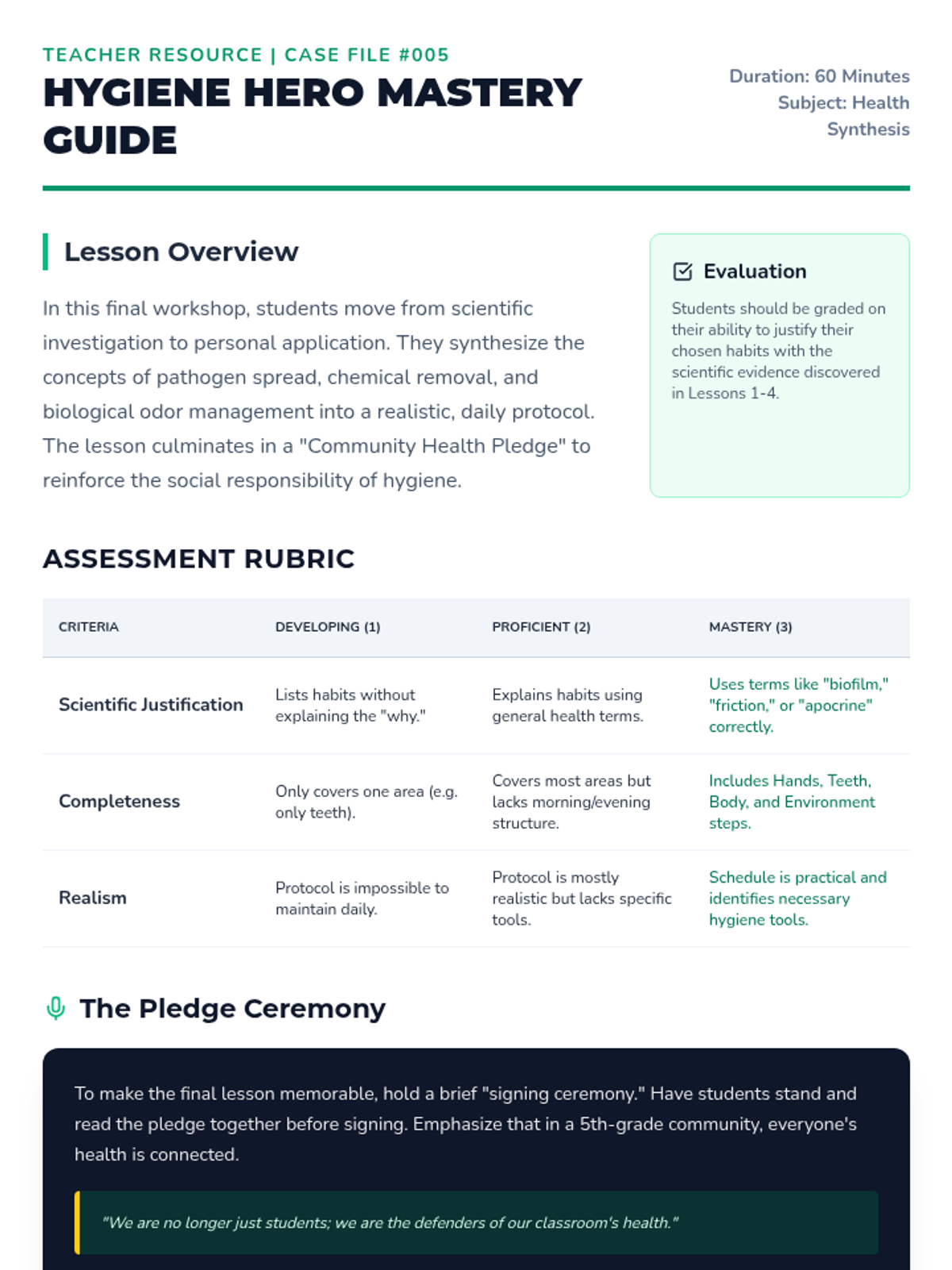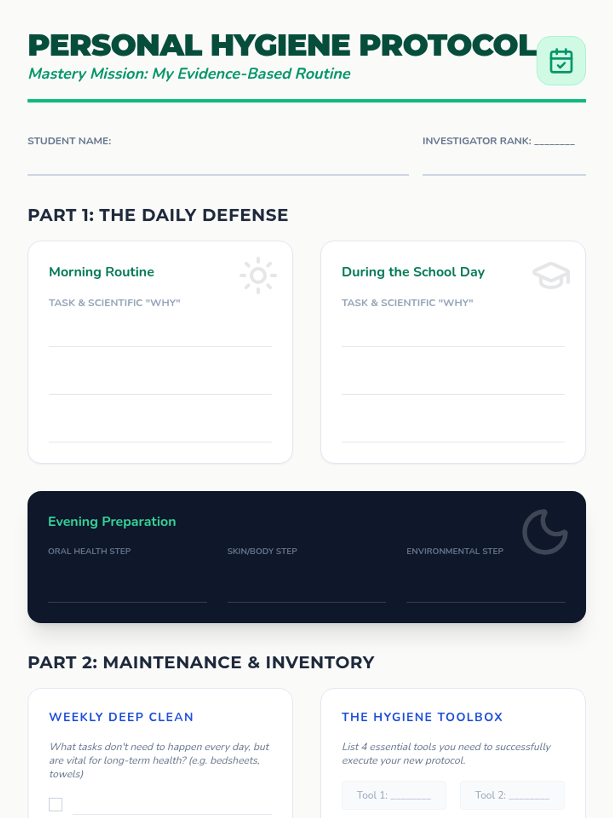 An inquiry-driven sequence guiding 5th-grade students through the scientific principles of hygiene. Students investigate germ transmission, experiment with cleaning agents, and design evidence-based personal health routines to protect themselves and their community.