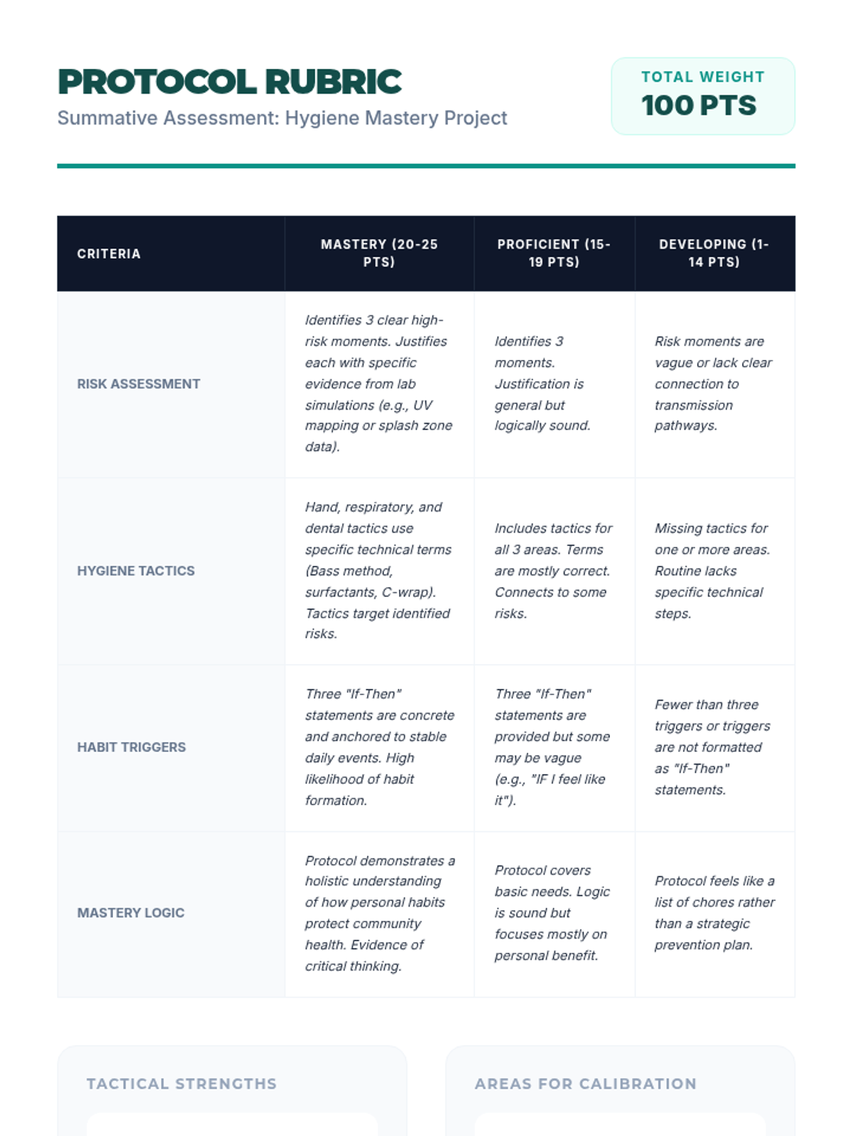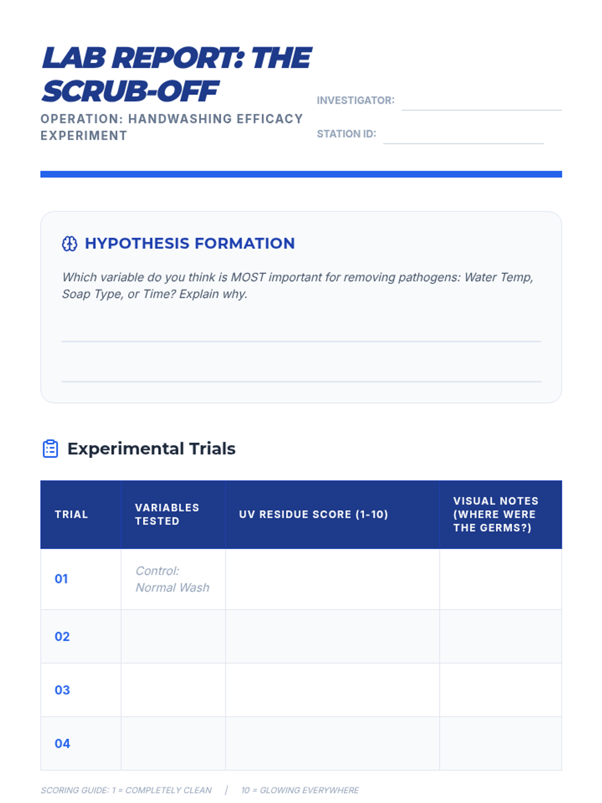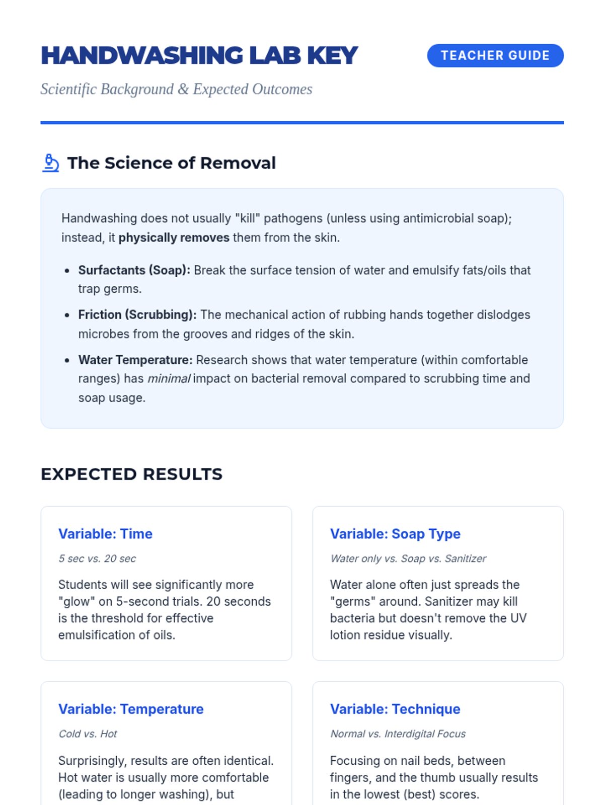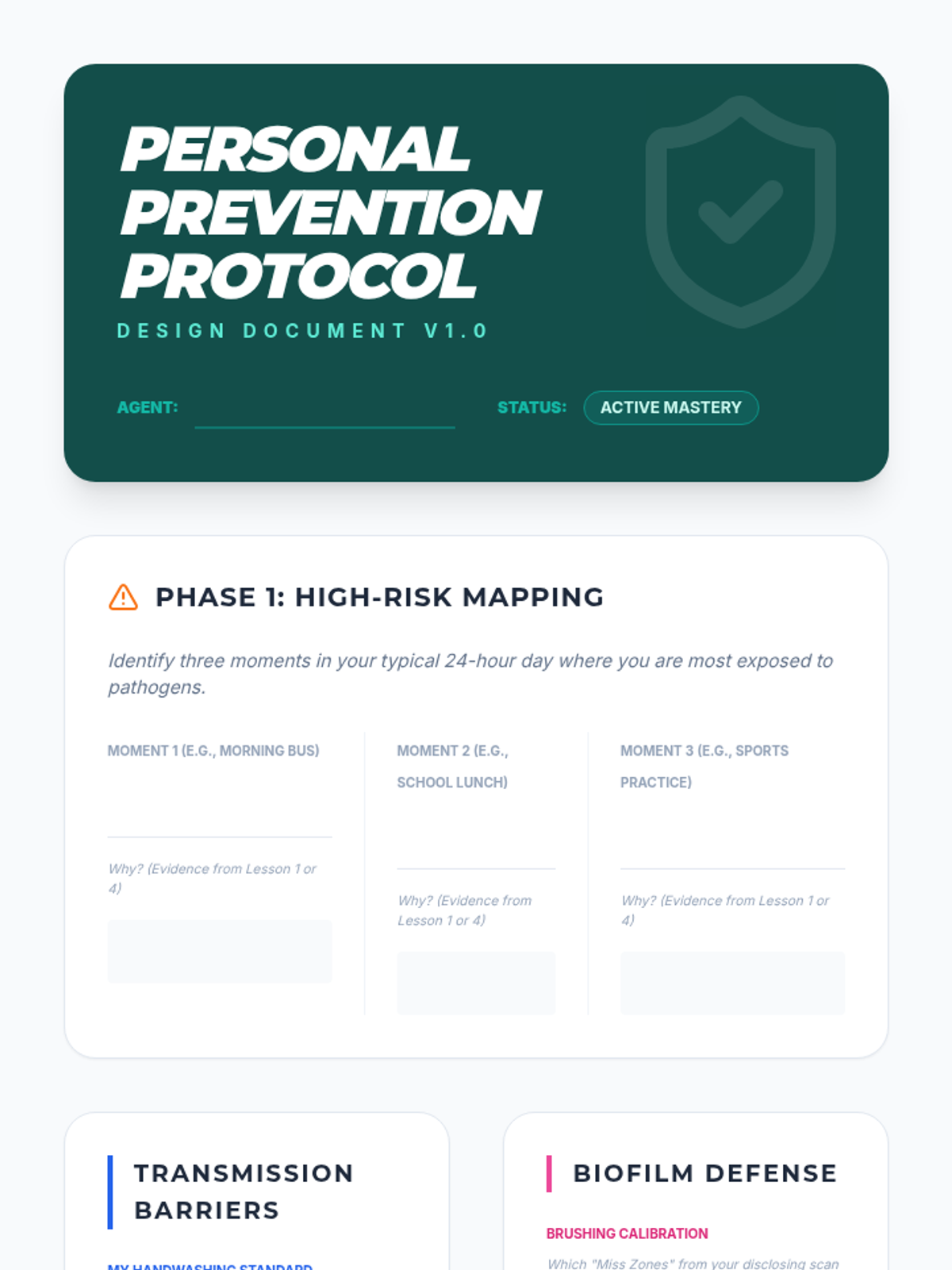 This middle school health sequence investigates the science of hygiene through simulations and experiments. Students analyze pathogen transmission, evaluate handwashing efficacy, study oral biofilms, and design personal prevention protocols to master long-term health habits.