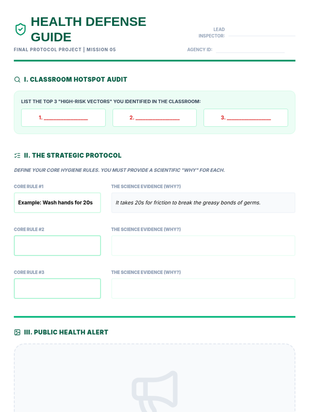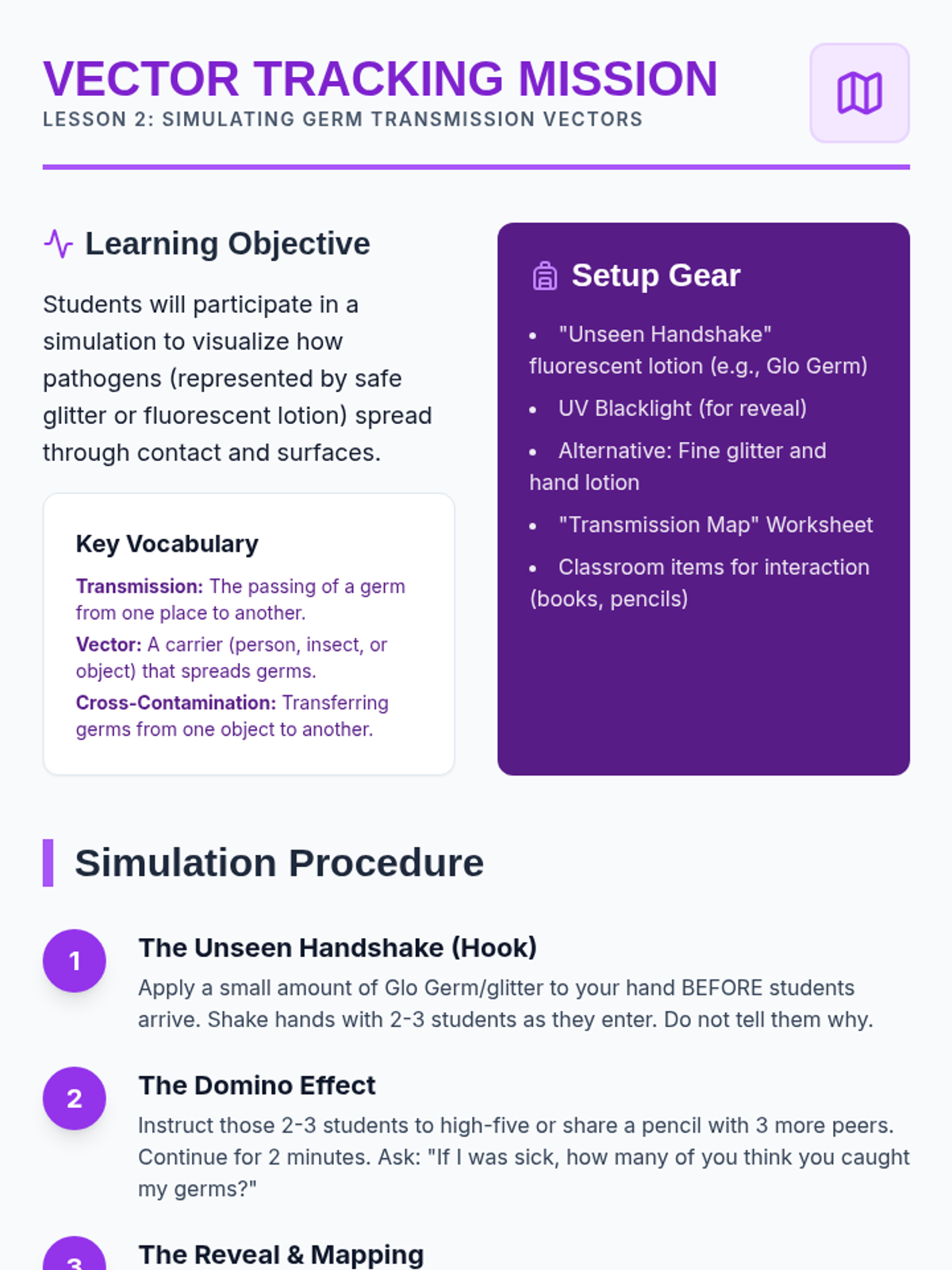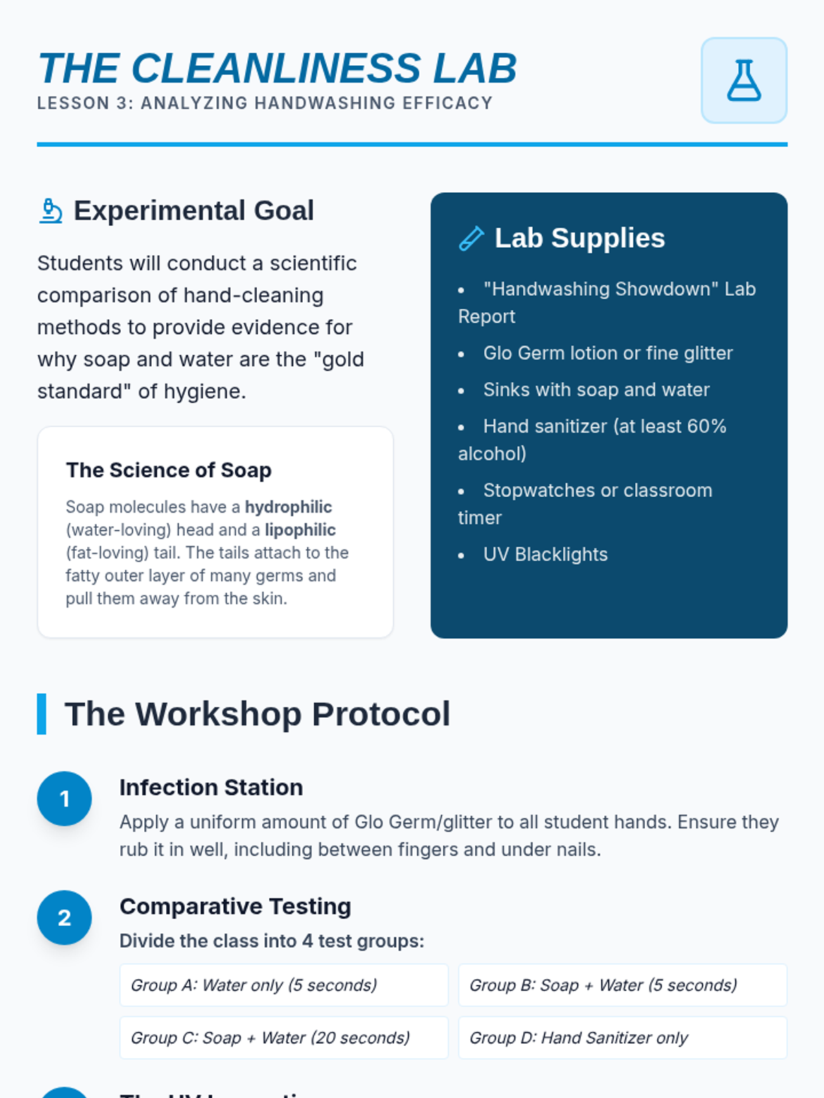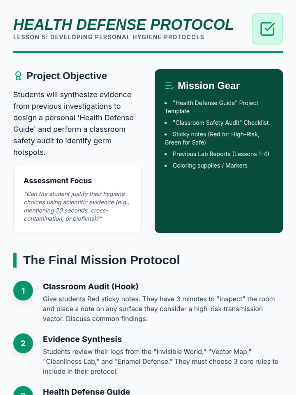 This sequence guides 4th-grade students through the science of hygiene, from identifying pathogens to creating evidence-based personal health routines. Students engage in simulations of germ transmission and experimental testing of cleaning methods to understand the 'why' behind hygiene practices.