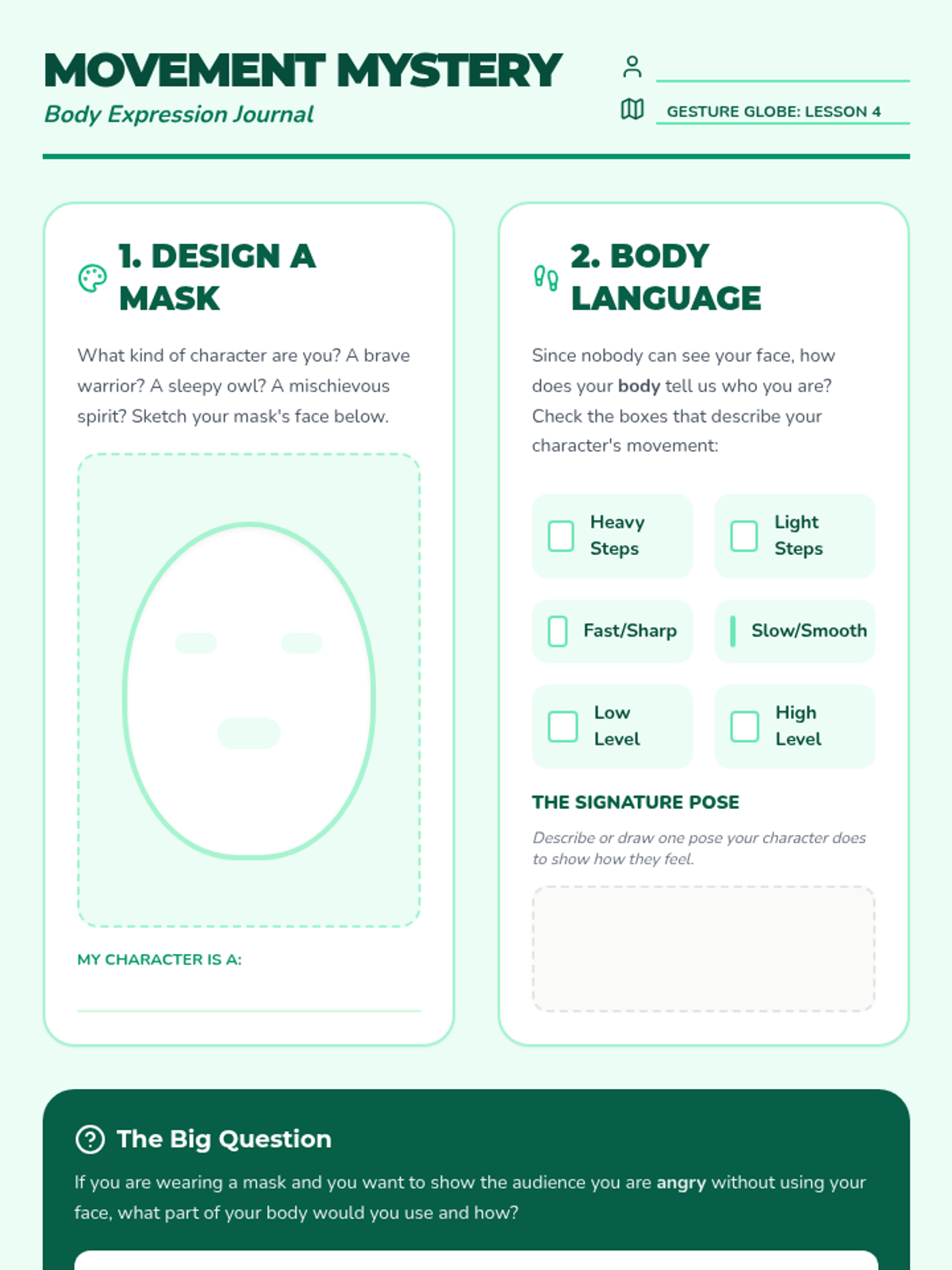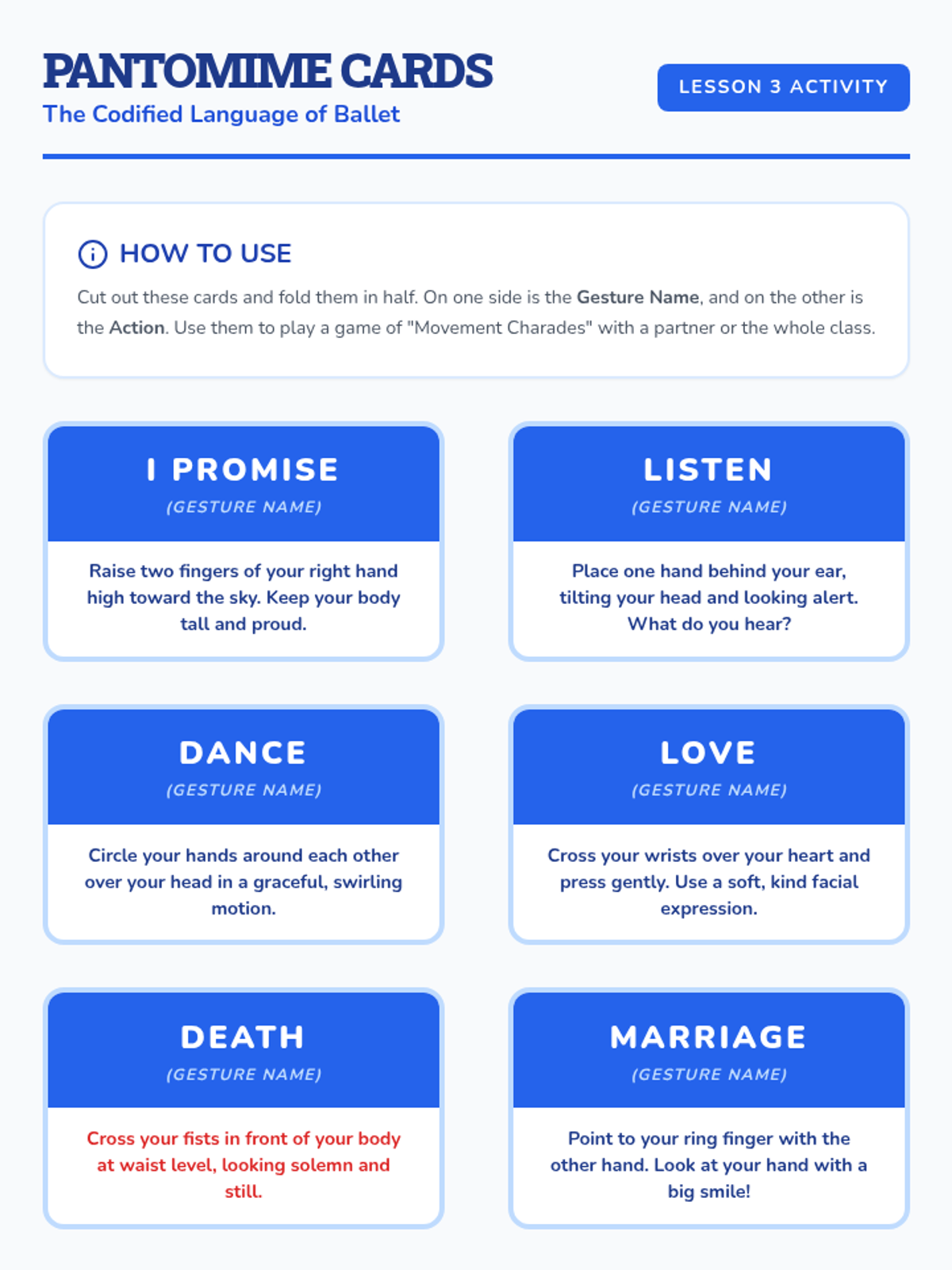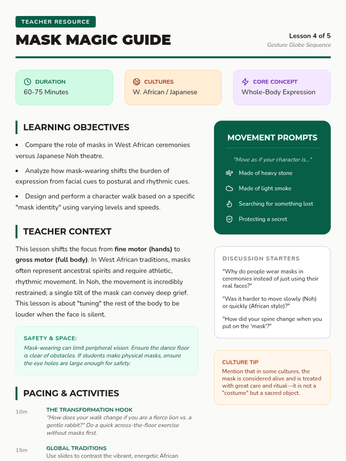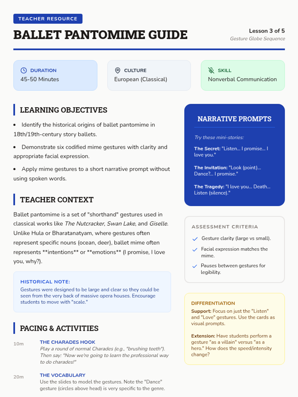 A 3rd-grade dance and history sequence exploring how global cultures use hand gestures and movement to preserve myths, genealogy, and stories. Students compare Hula, Bharatanatyam, Ballet pantomime, and mask-based dance to understand nonverbal communication.