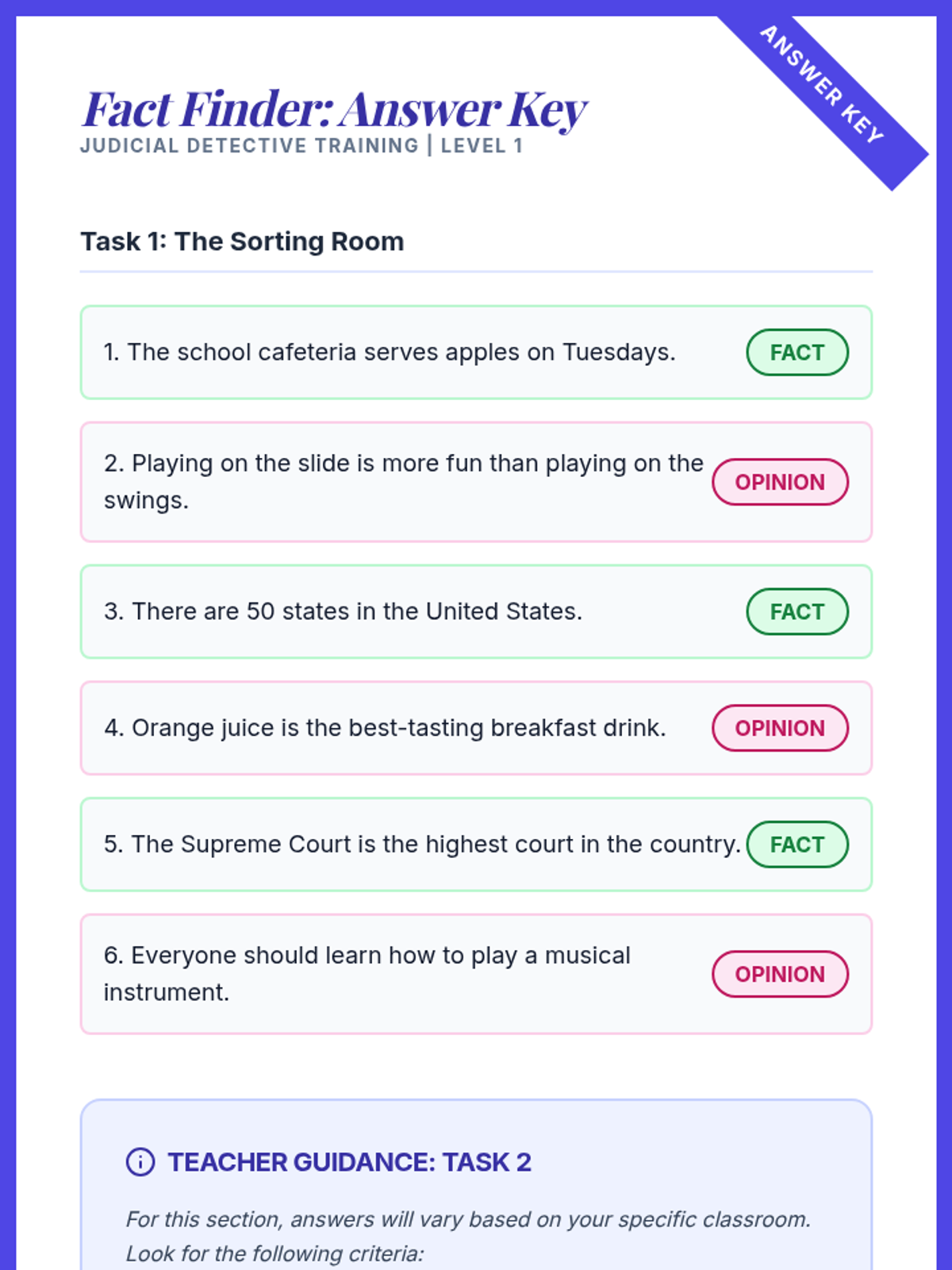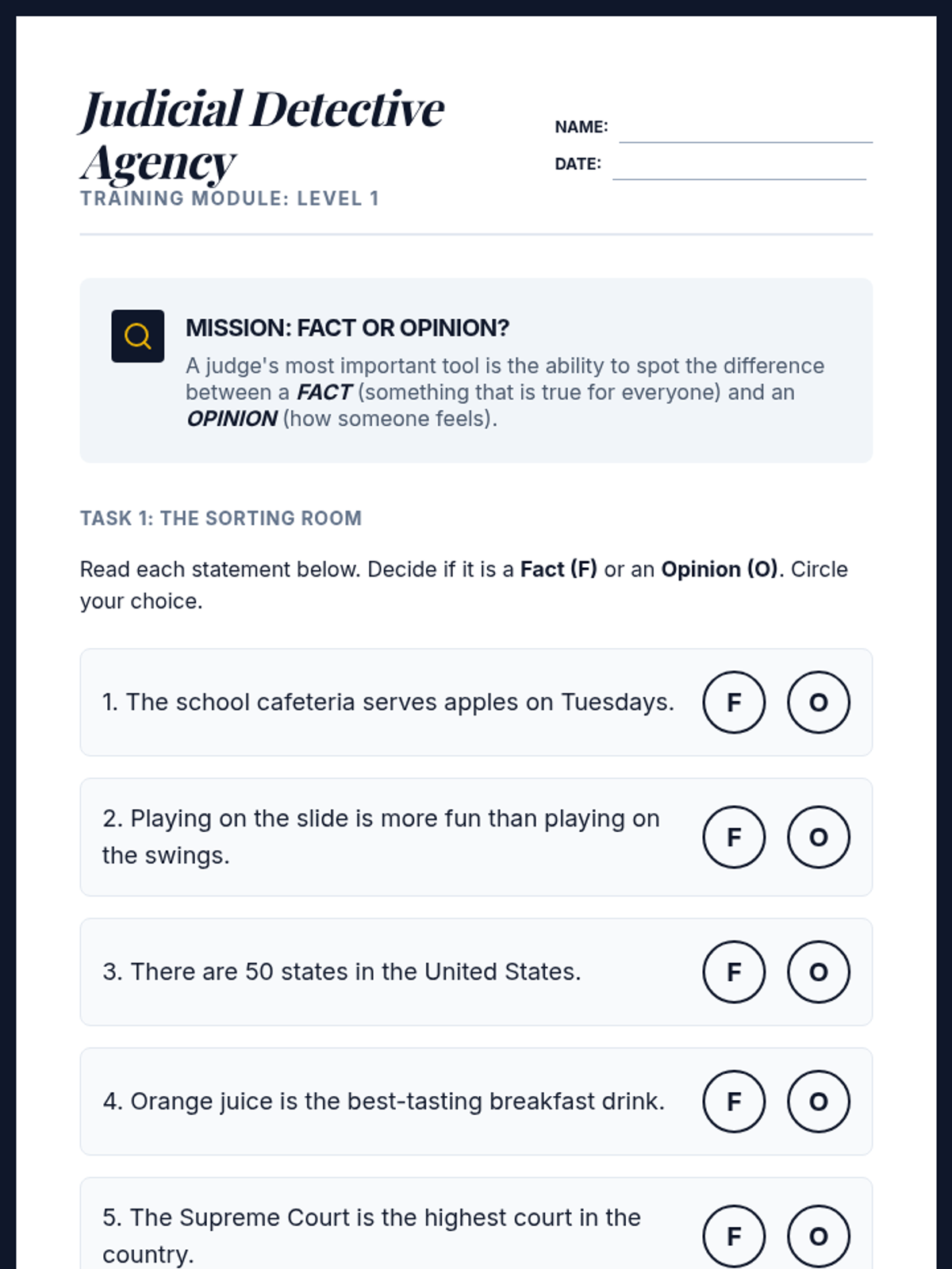 A 3rd-grade civics sequence focusing on the analytical skills of the judicial branch. Students act as 'Judicial Detectives' to learn about fact vs. opinion, evidence, impartiality, and making fair judgments based on rules.