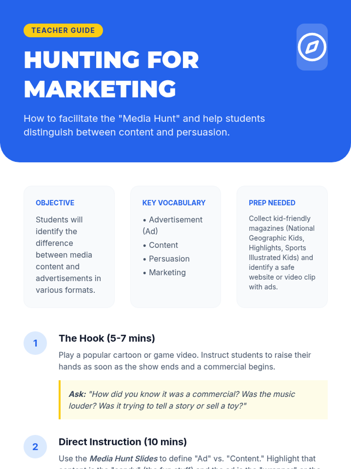 An inquiry-based unit for 3rd graders to deconstruct media messages. Students learn to identify advertisements, analyze target audiences, recognize staging tricks, and decode emotional appeals, culminating in the creation of 'honest' advertisements.