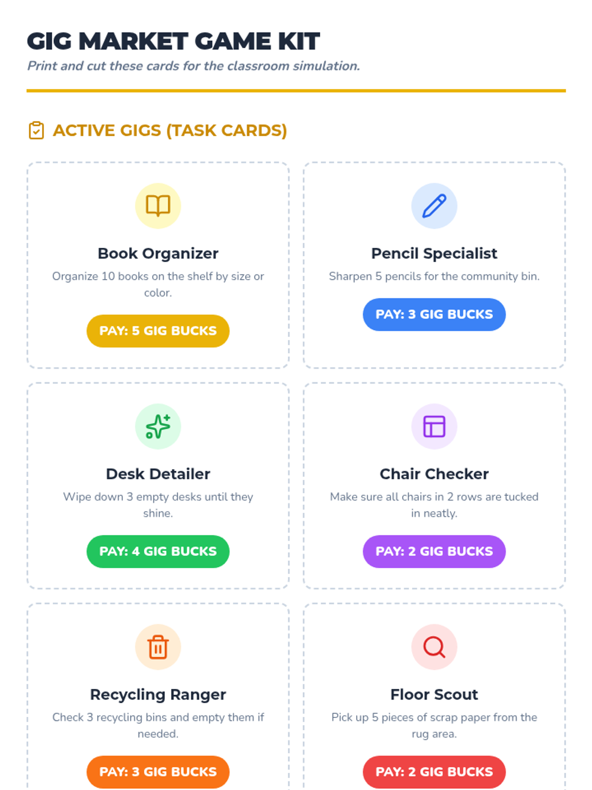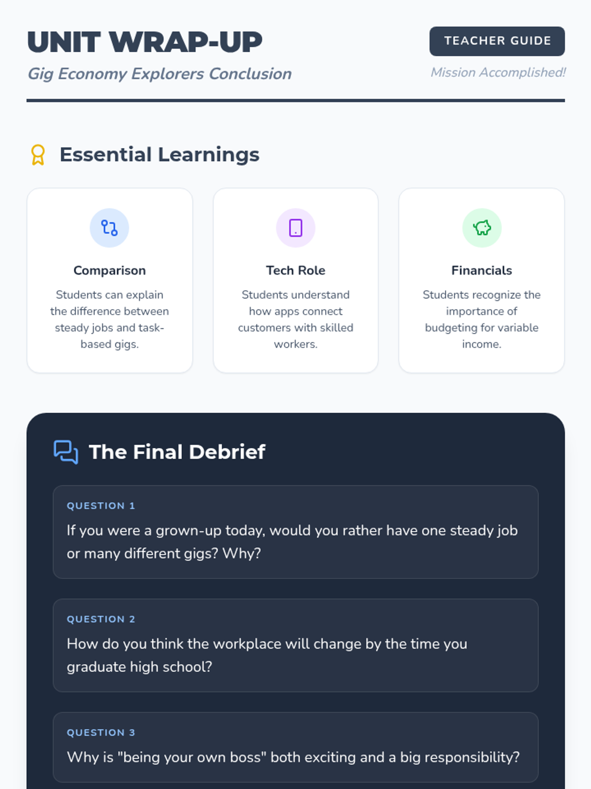 A game-based economics unit for 3rd graders exploring the shift from traditional employment to the gig economy, covering job types, technology's role, and financial literacy.