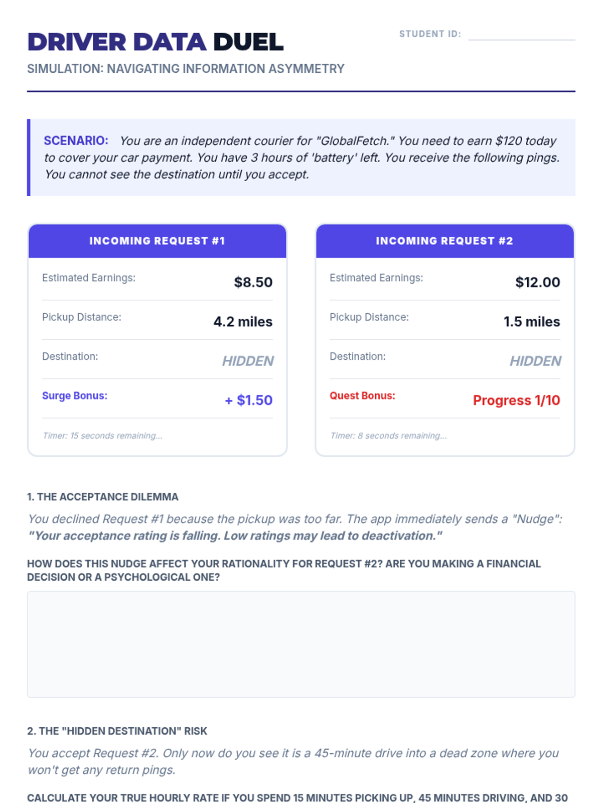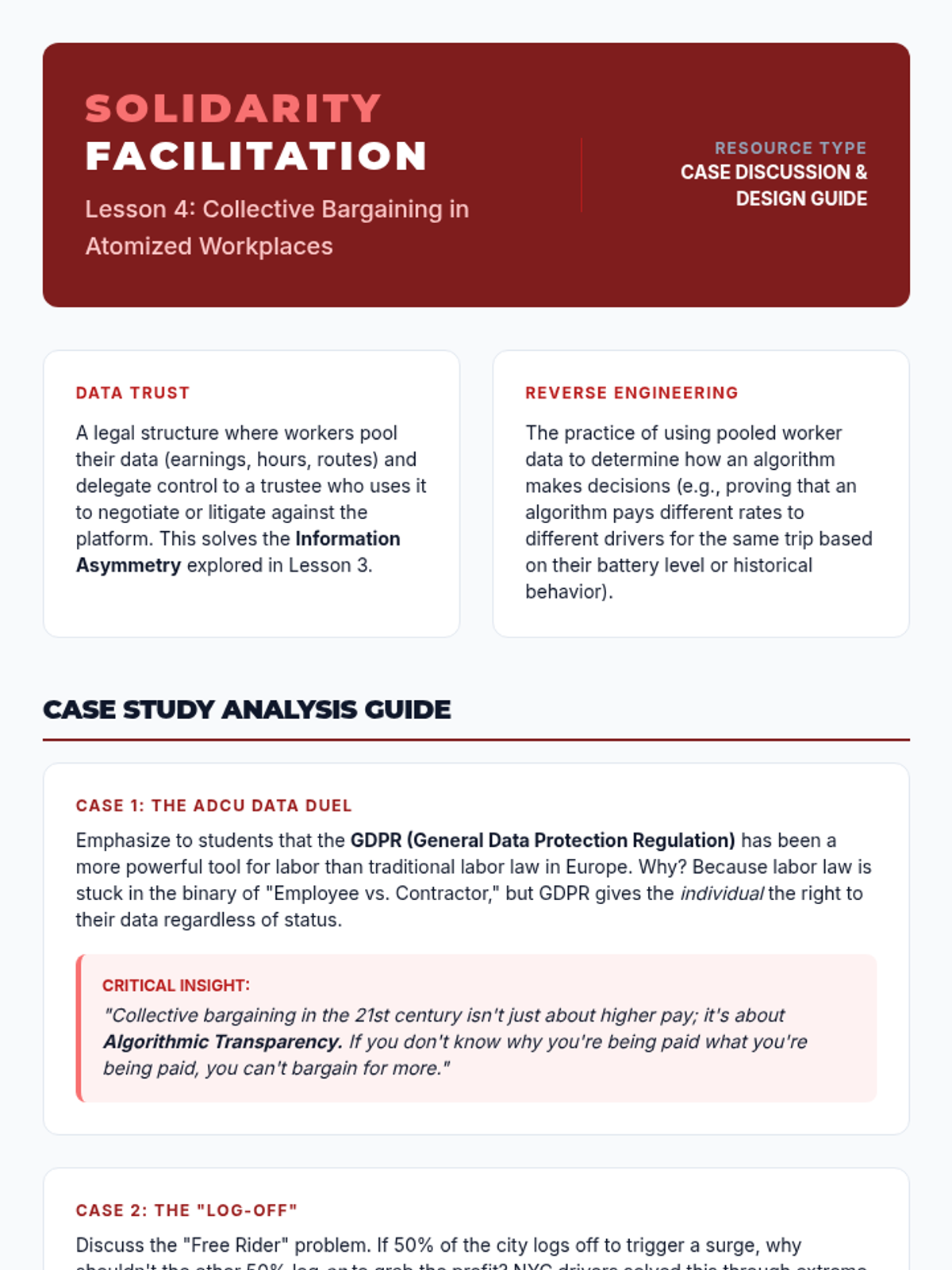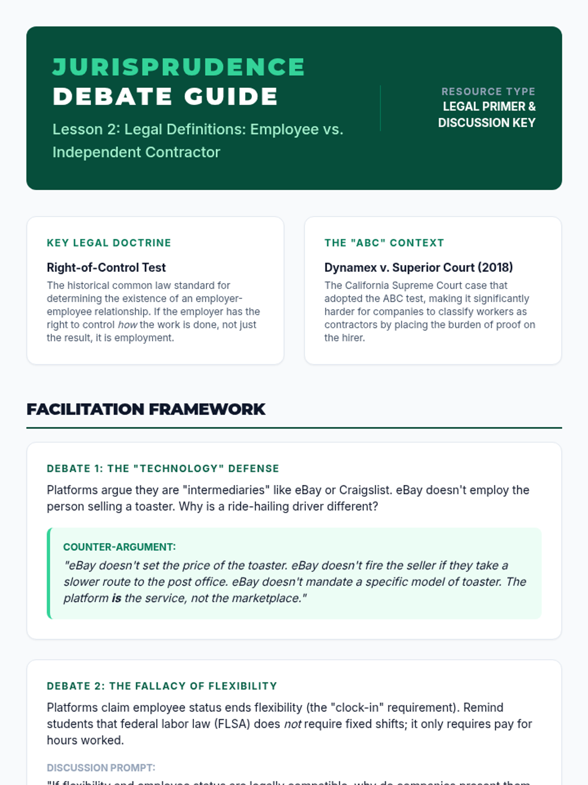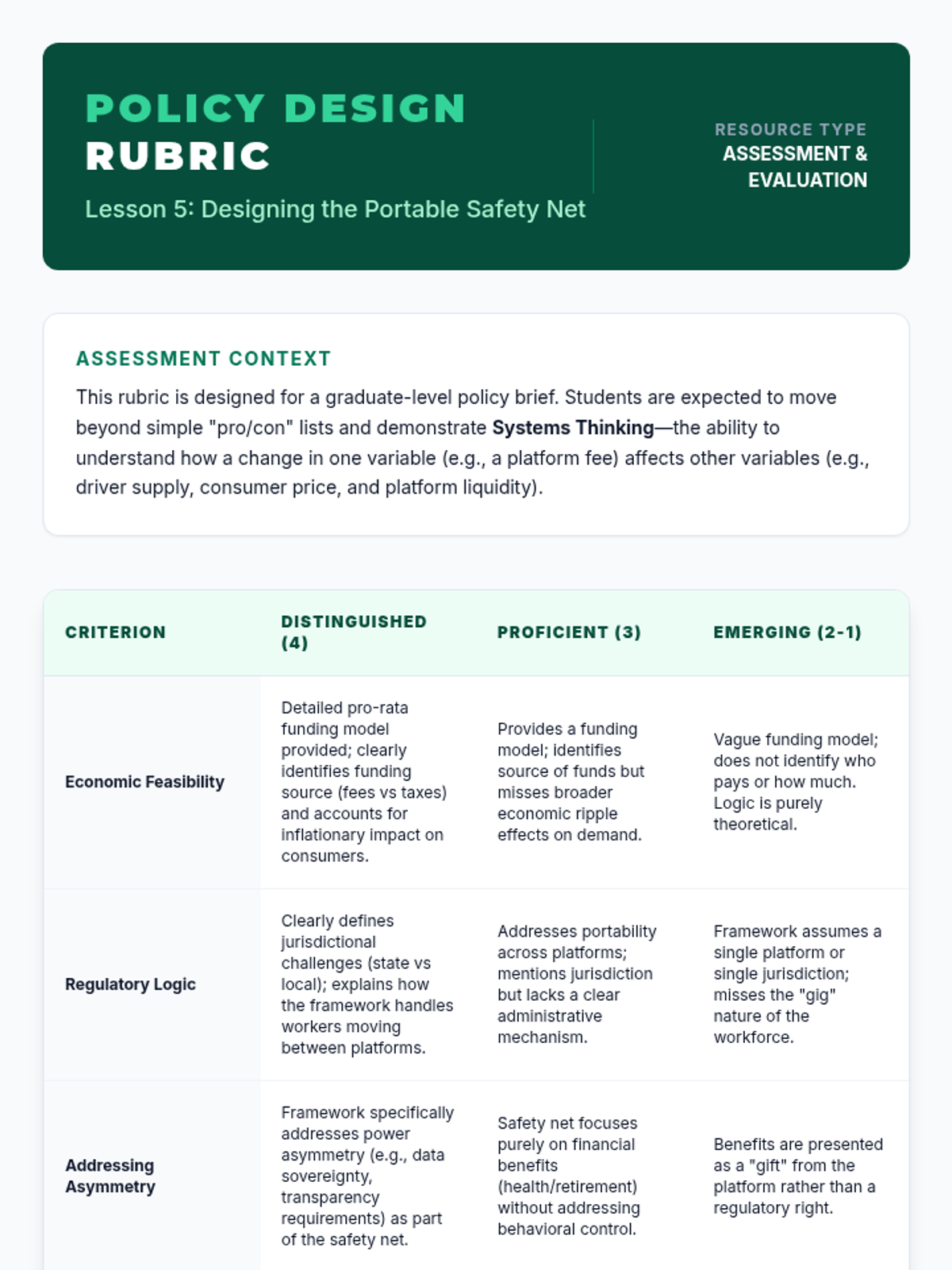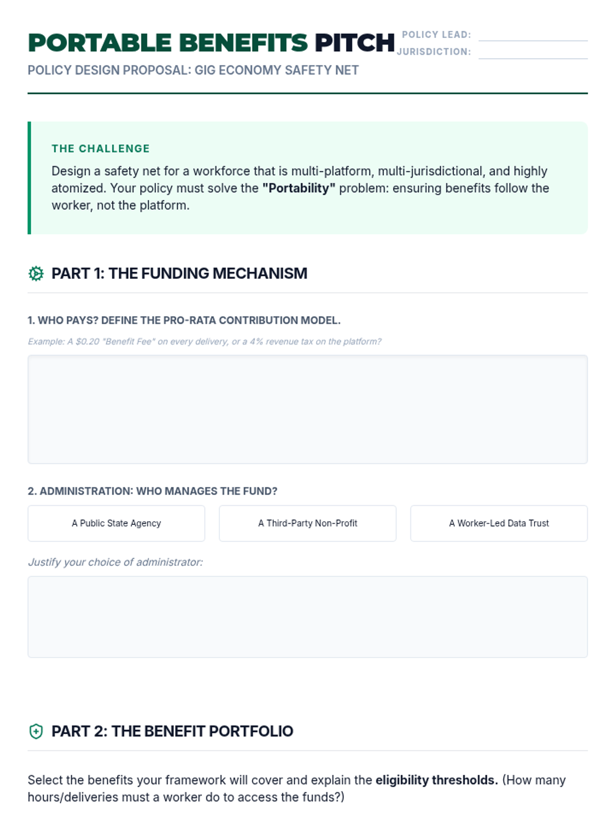 A graduate-level exploration of the gig economy's regulatory challenges, investigating business models, labor law definitions, algorithmic control, and future policy solutions. Students deconstruct platform economics and design modernized labor frameworks for the 21st-century workforce.