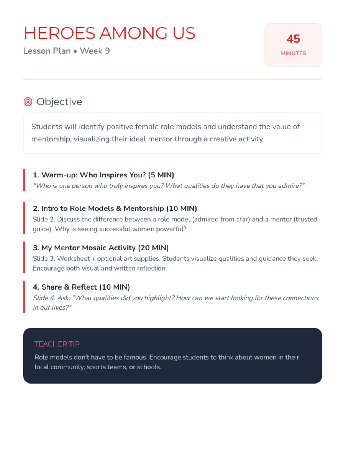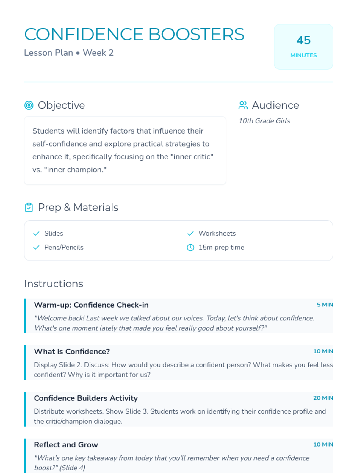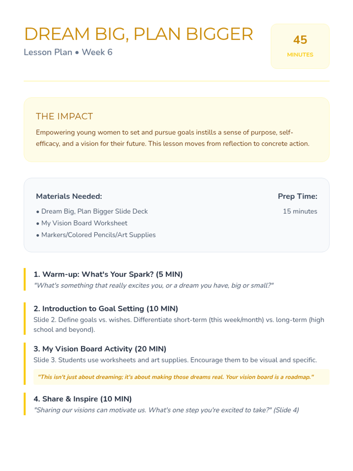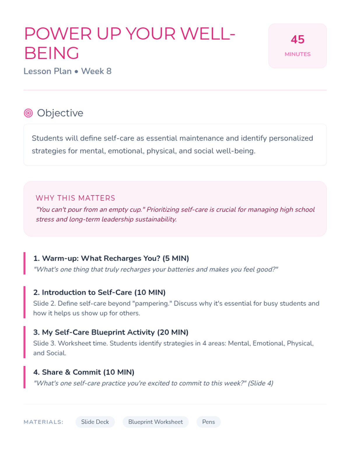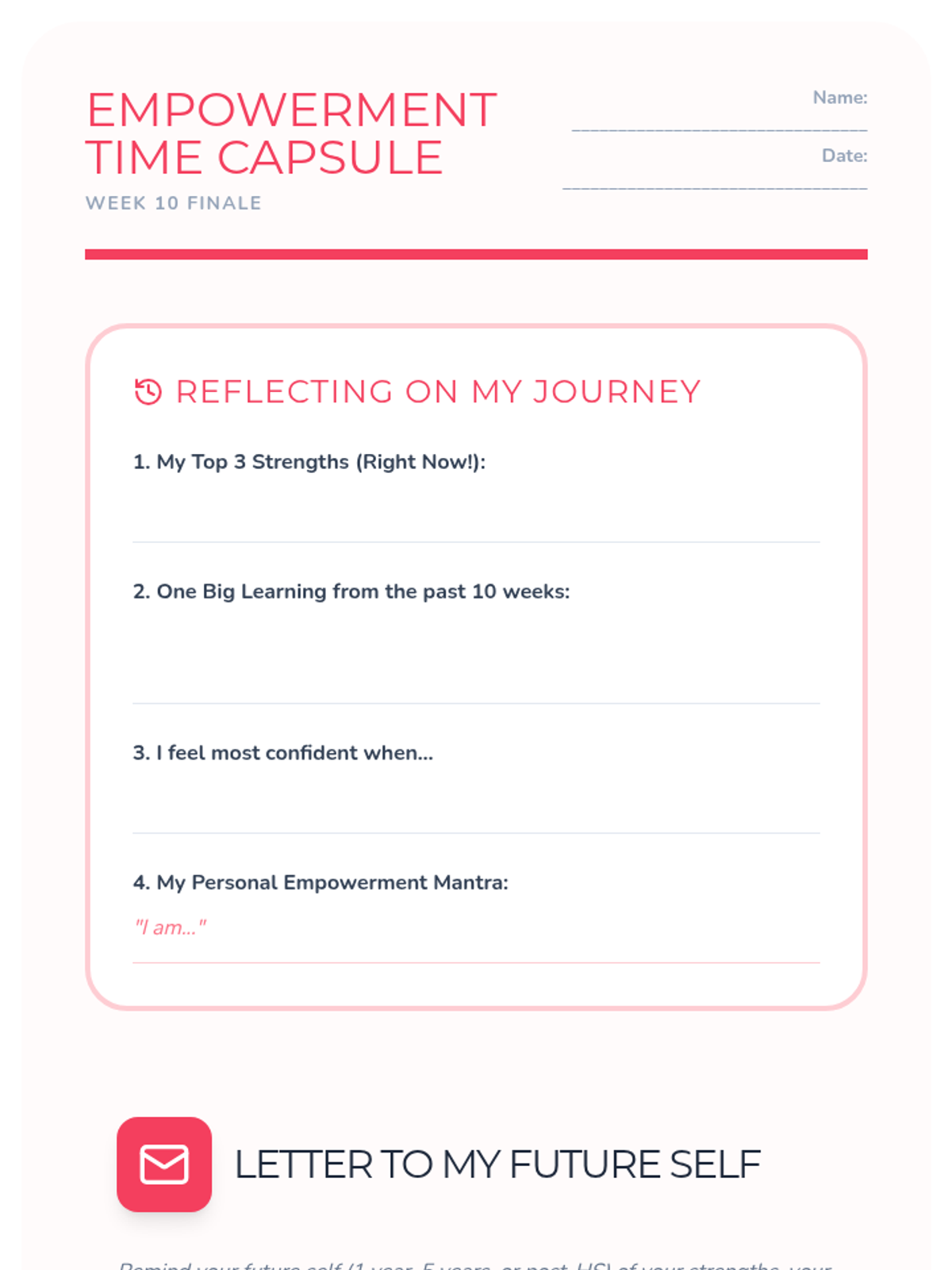 A 10-week curriculum for 10th-grade girls focused on fostering leadership, self-esteem, and critical thinking through engaging activities and discussions. Each 45-minute session empowers students to recognize their strengths and advocate for themselves and others.