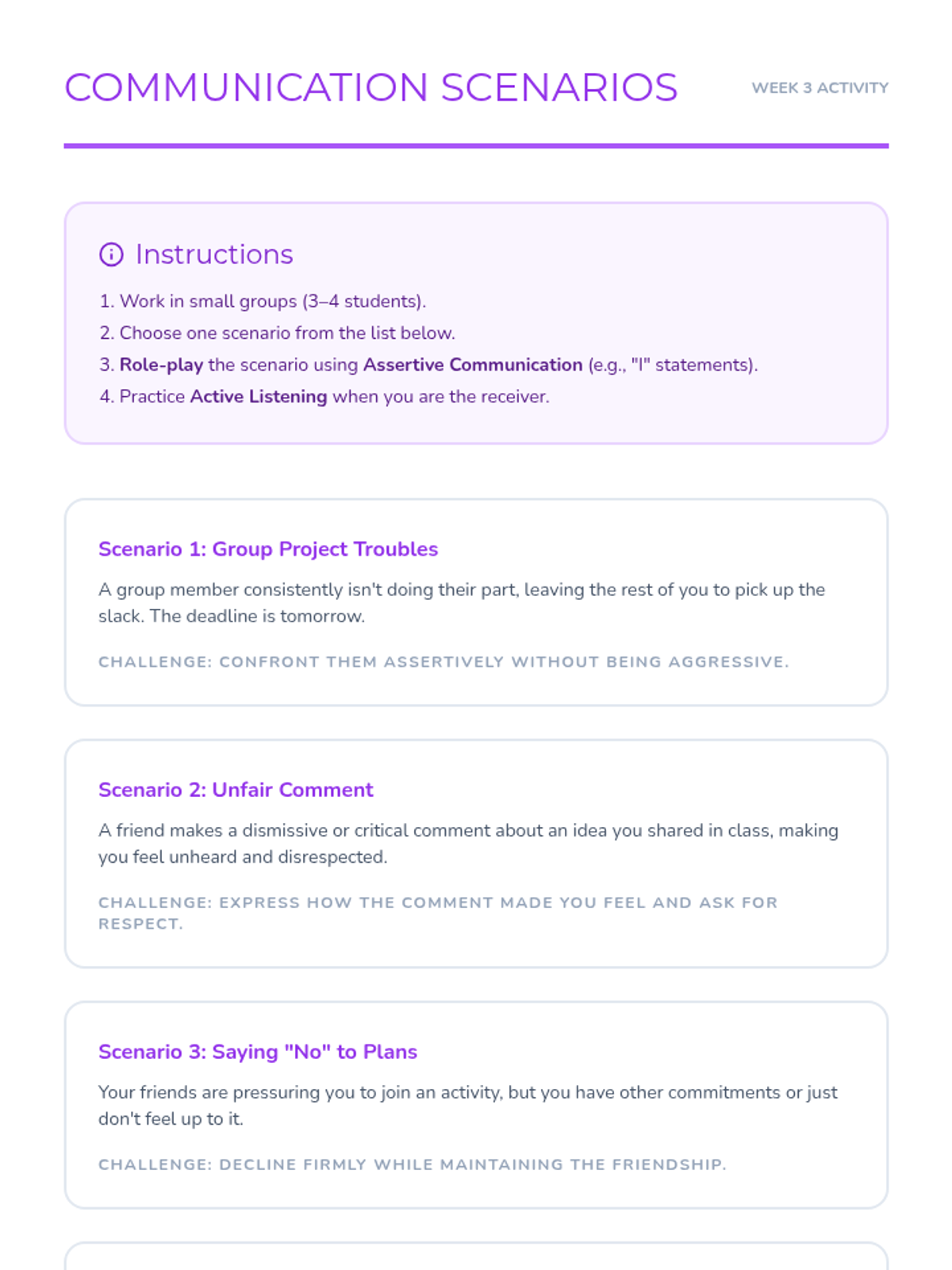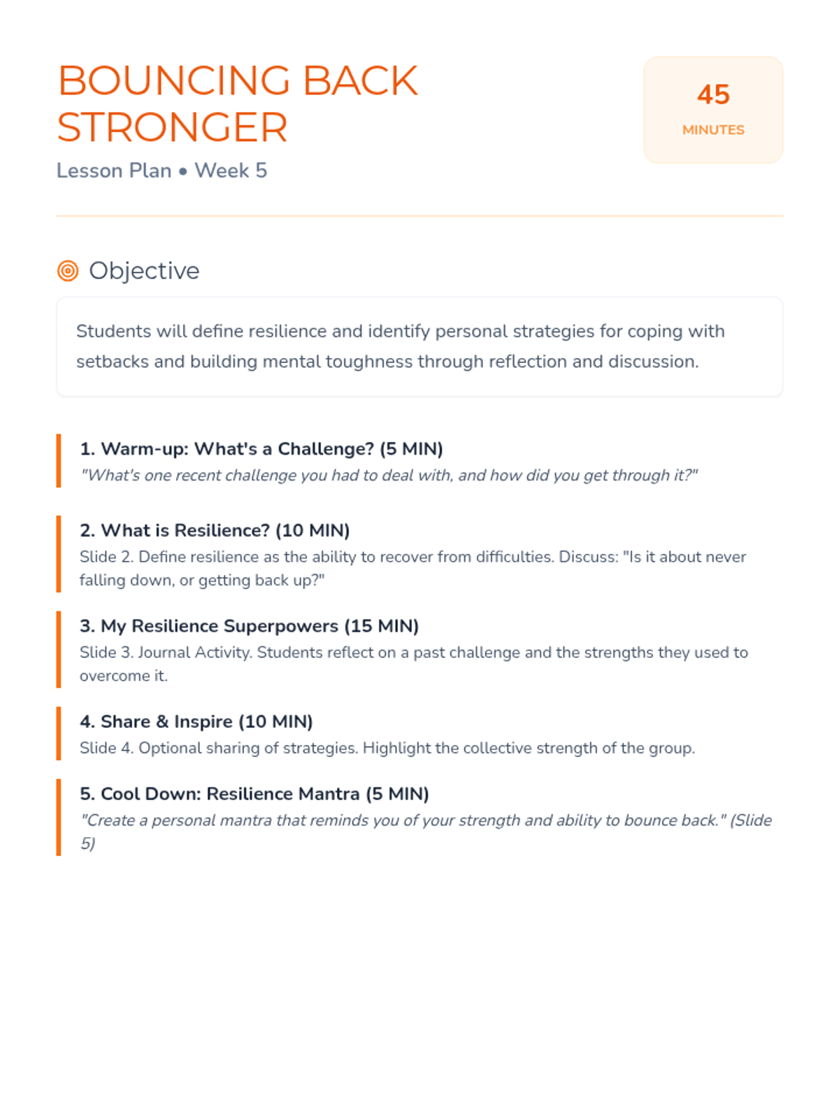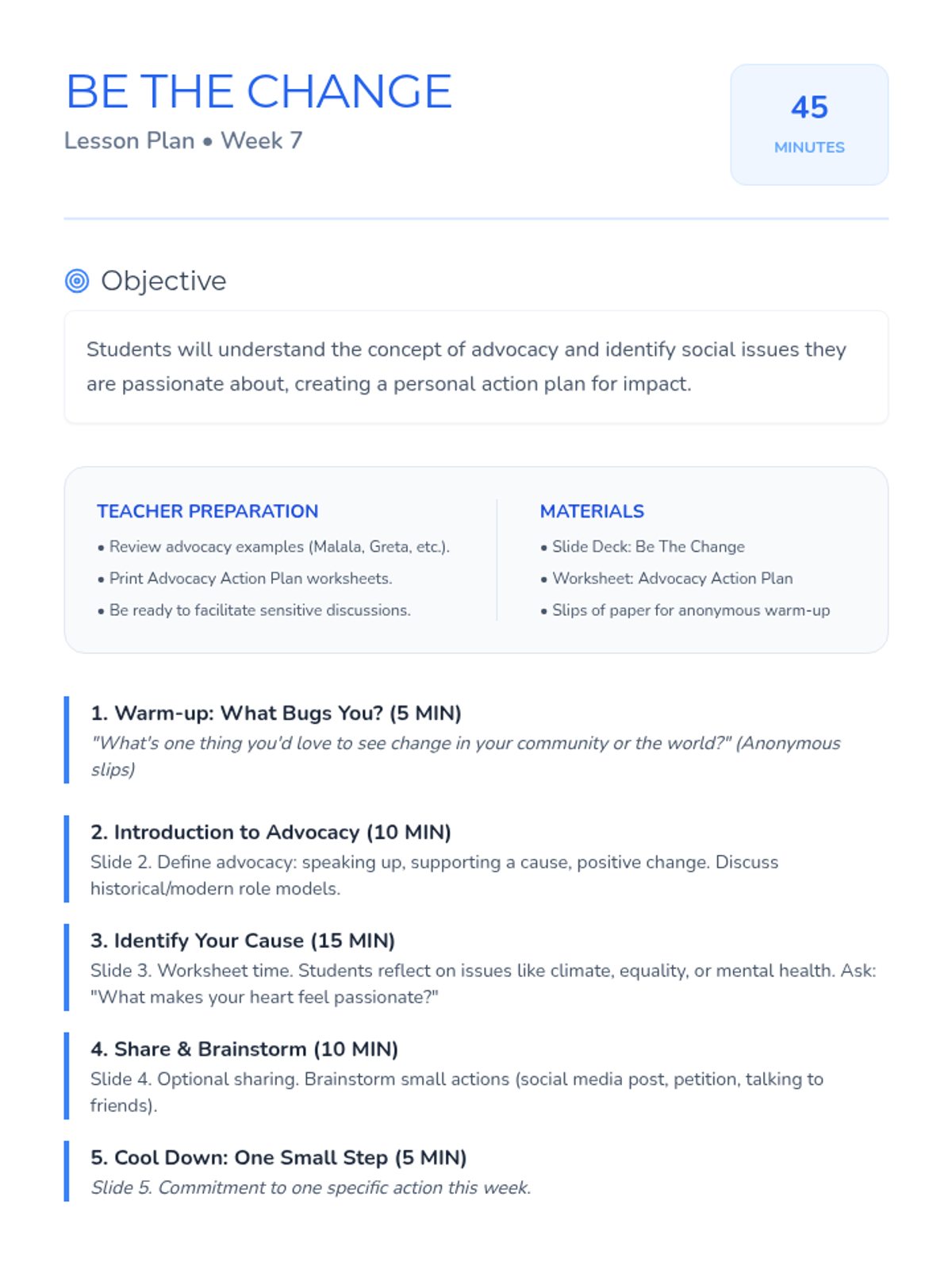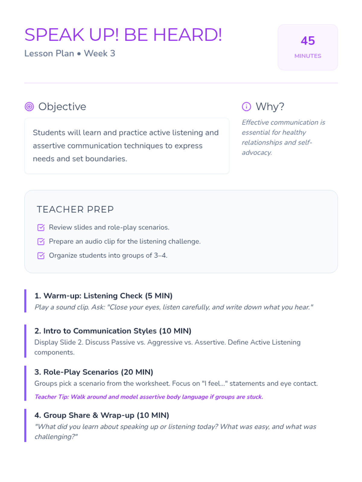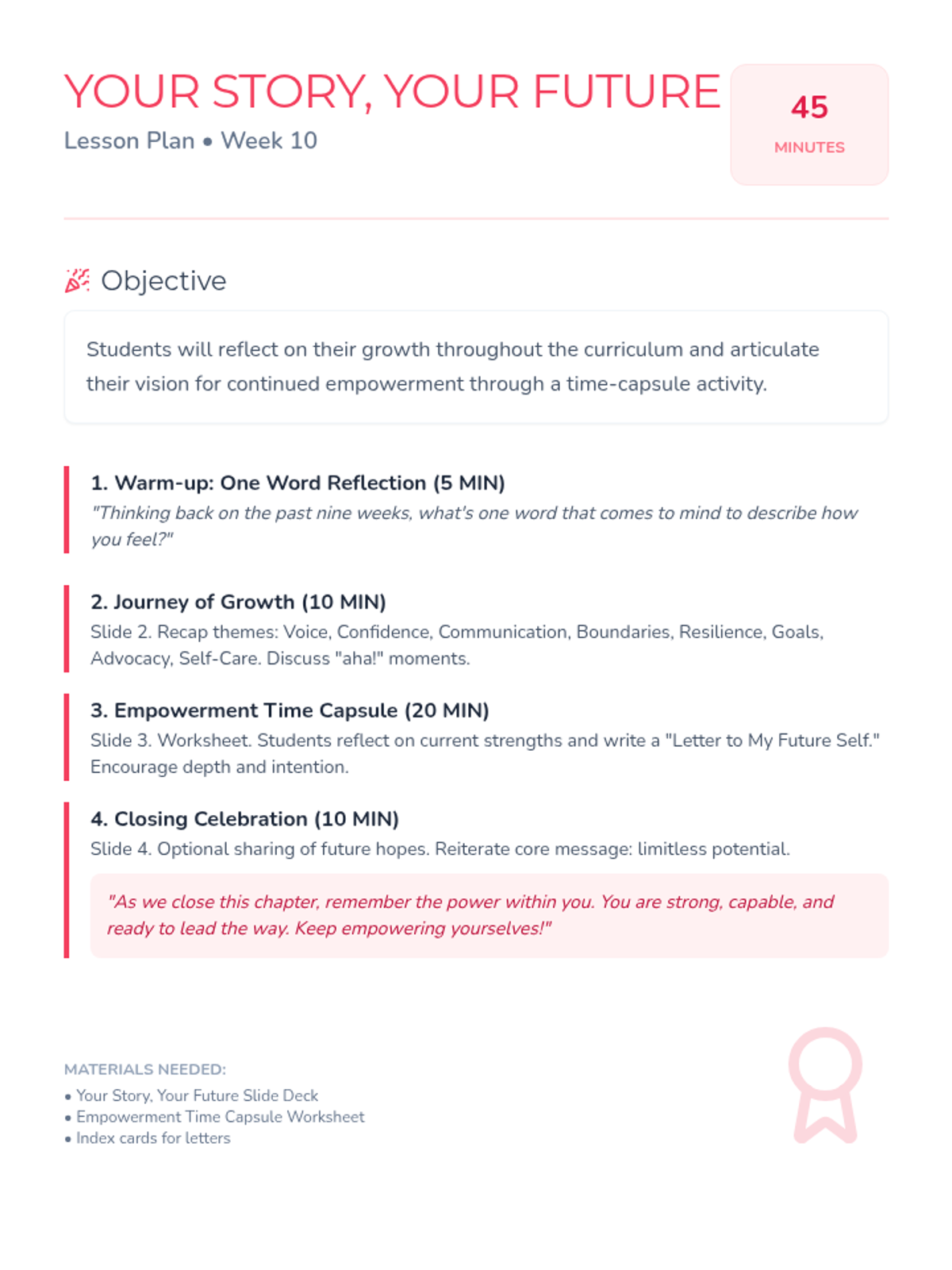 A 10-week curriculum for 10th-grade girls focused on fostering leadership, self-esteem, and critical thinking through engaging activities and discussions. Each 45-minute session empowers students to recognize their strengths and advocate for themselves and others.