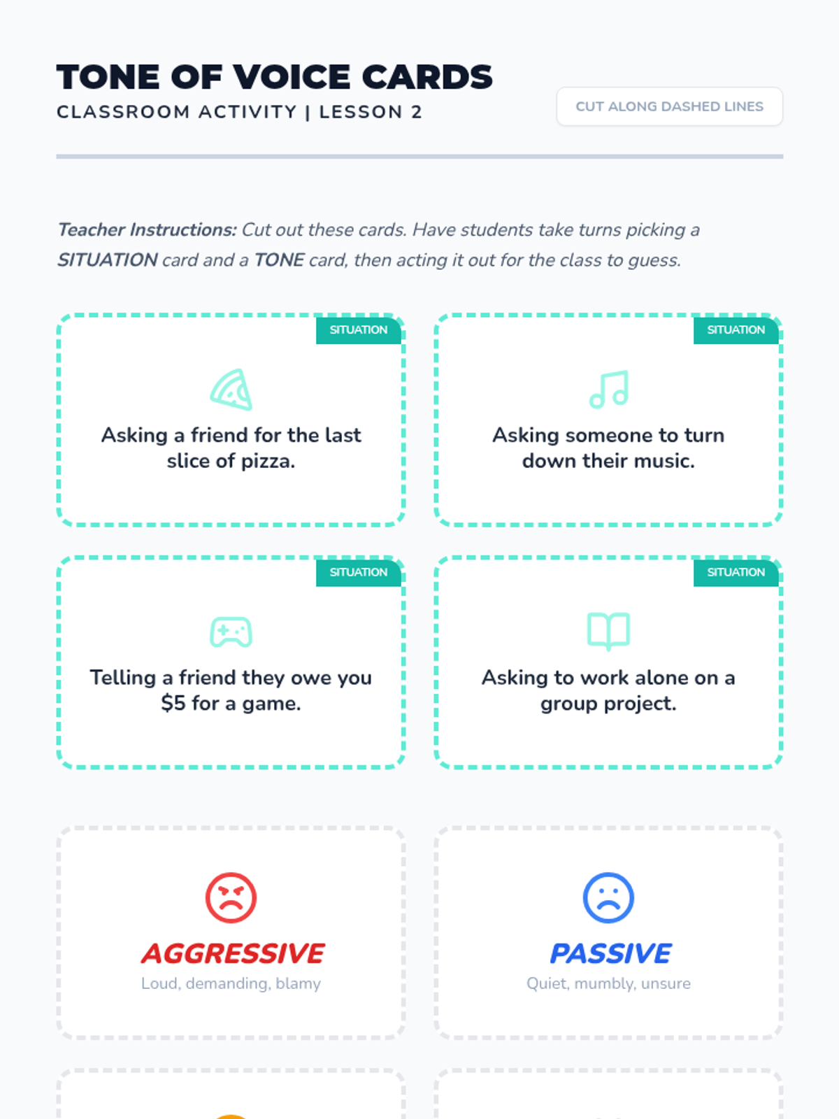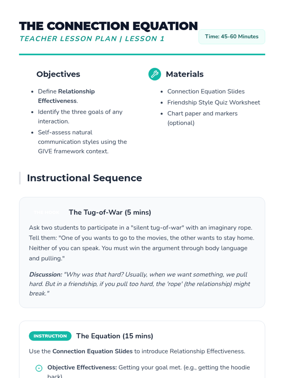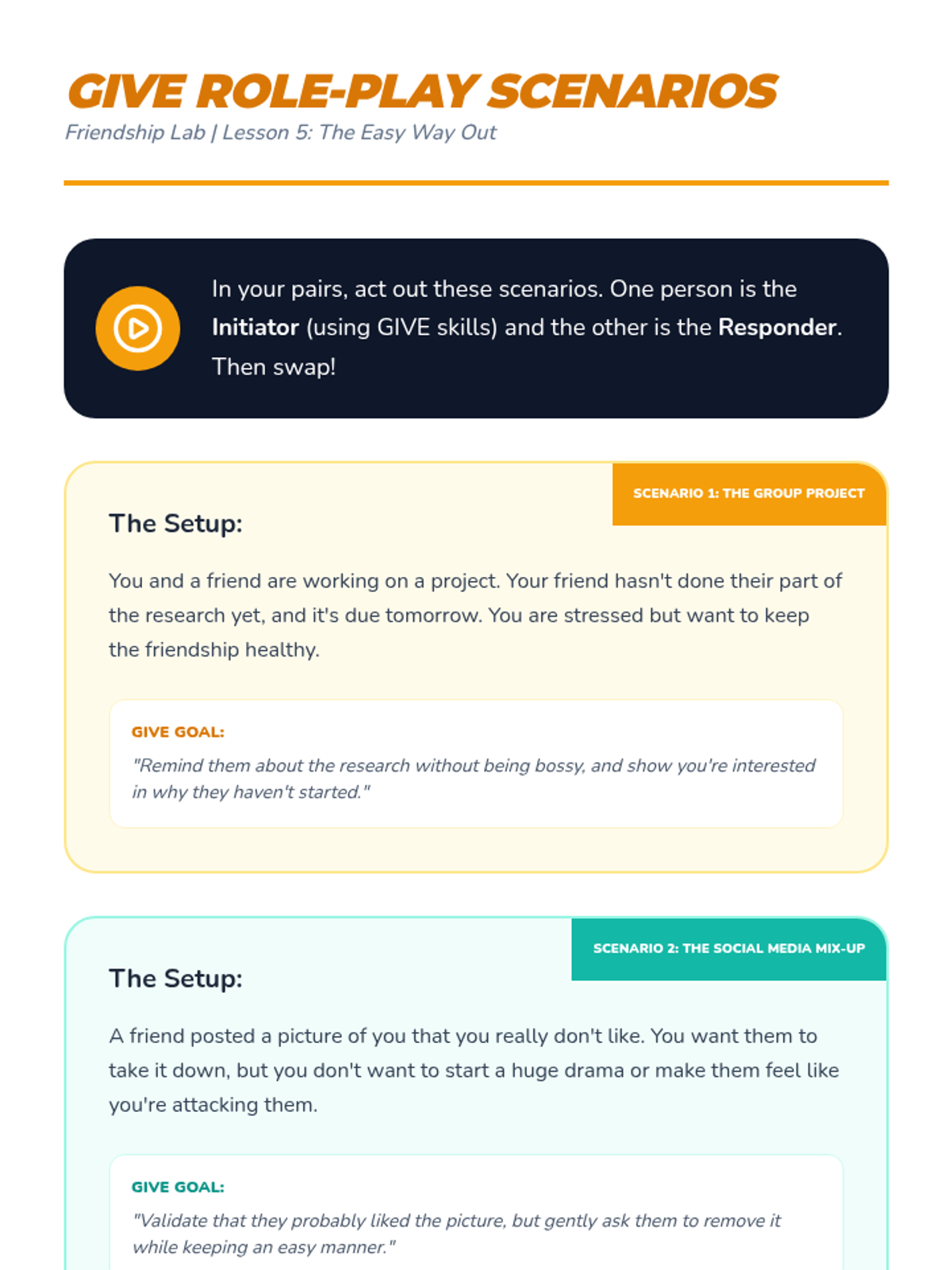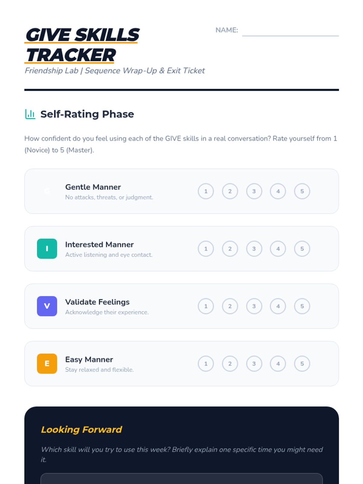 A comprehensive sequence for 6th graders to master the GIVE framework for healthy relationships, covering Gentle, Interested, Validate, and Easy manner skills through hands-on practice and reflection.