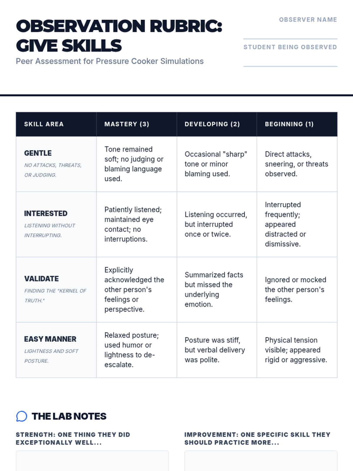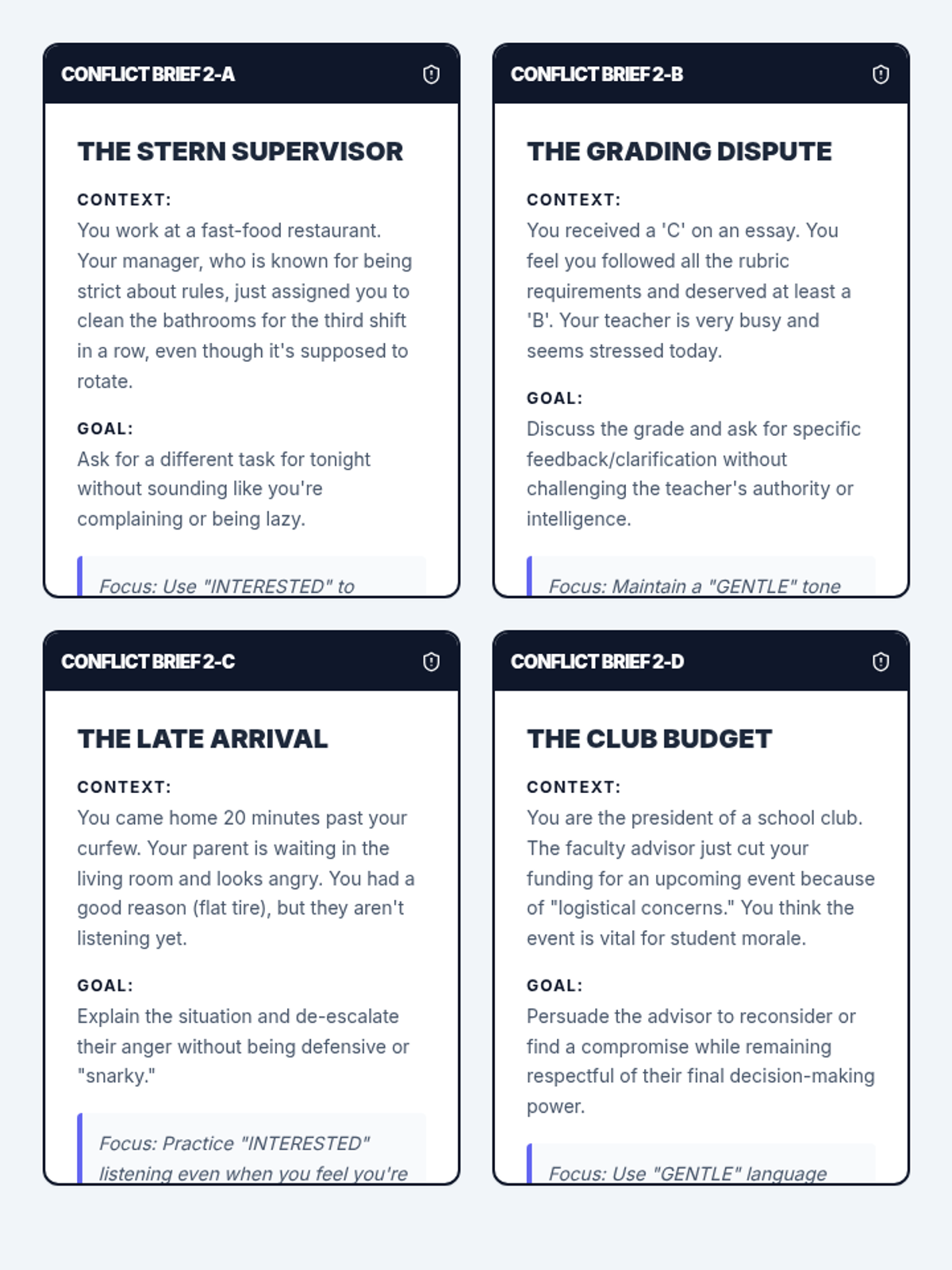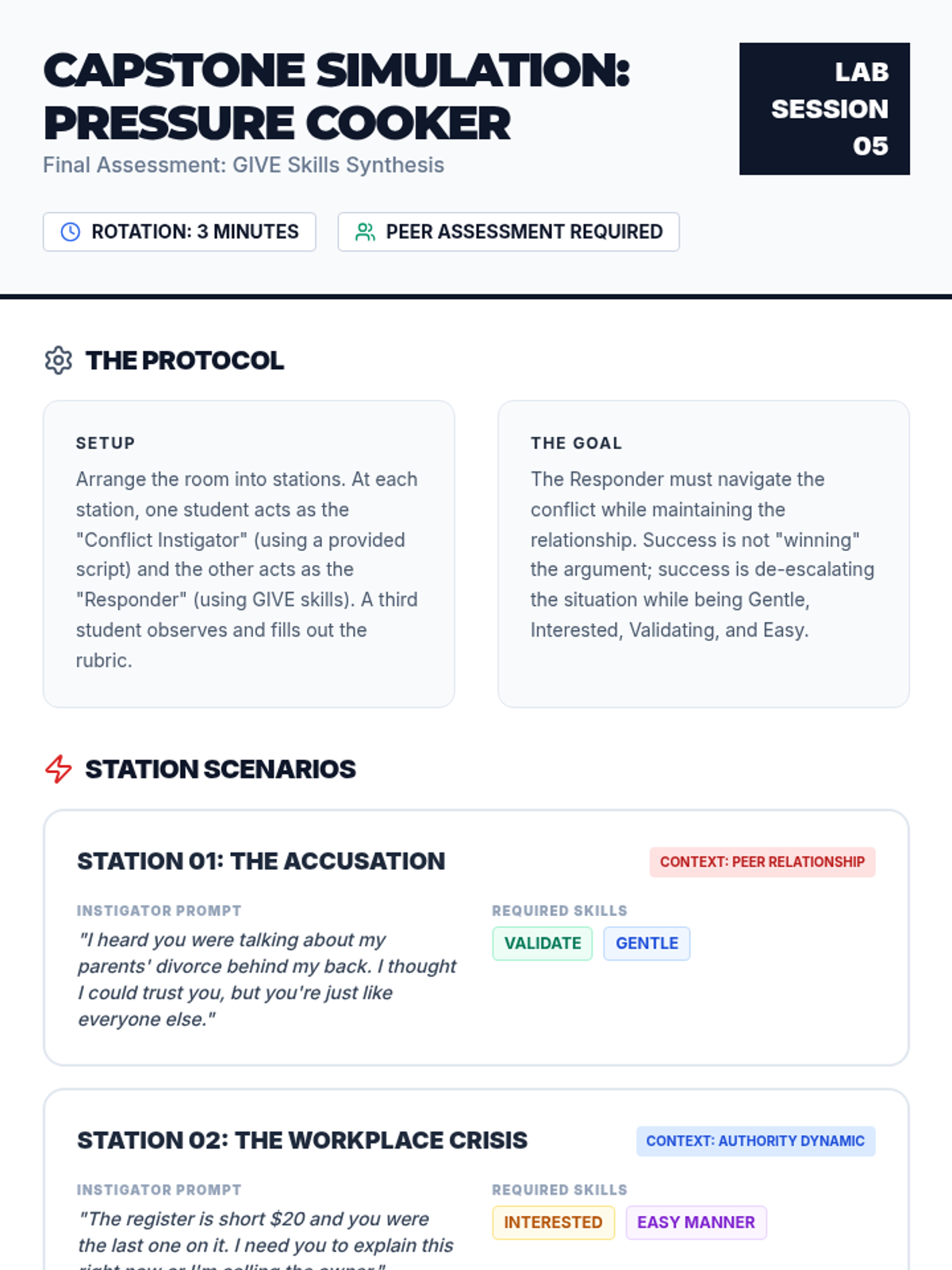 A comprehensive 5-lesson sequence for 11th-grade students focusing on the GIVE interpersonal effectiveness skills. Students move from analyzing emotional triggers and conflict escalation to mastering high-stakes simulations involving authority figures, peers, and complex validation challenges.
