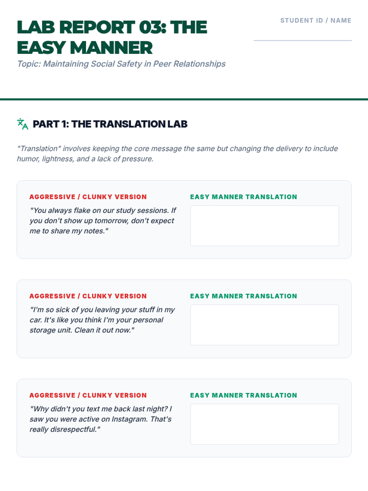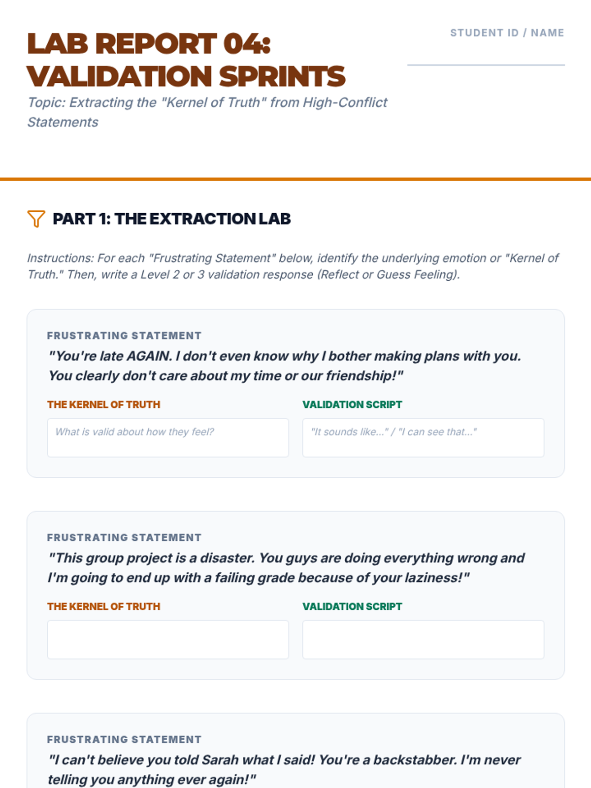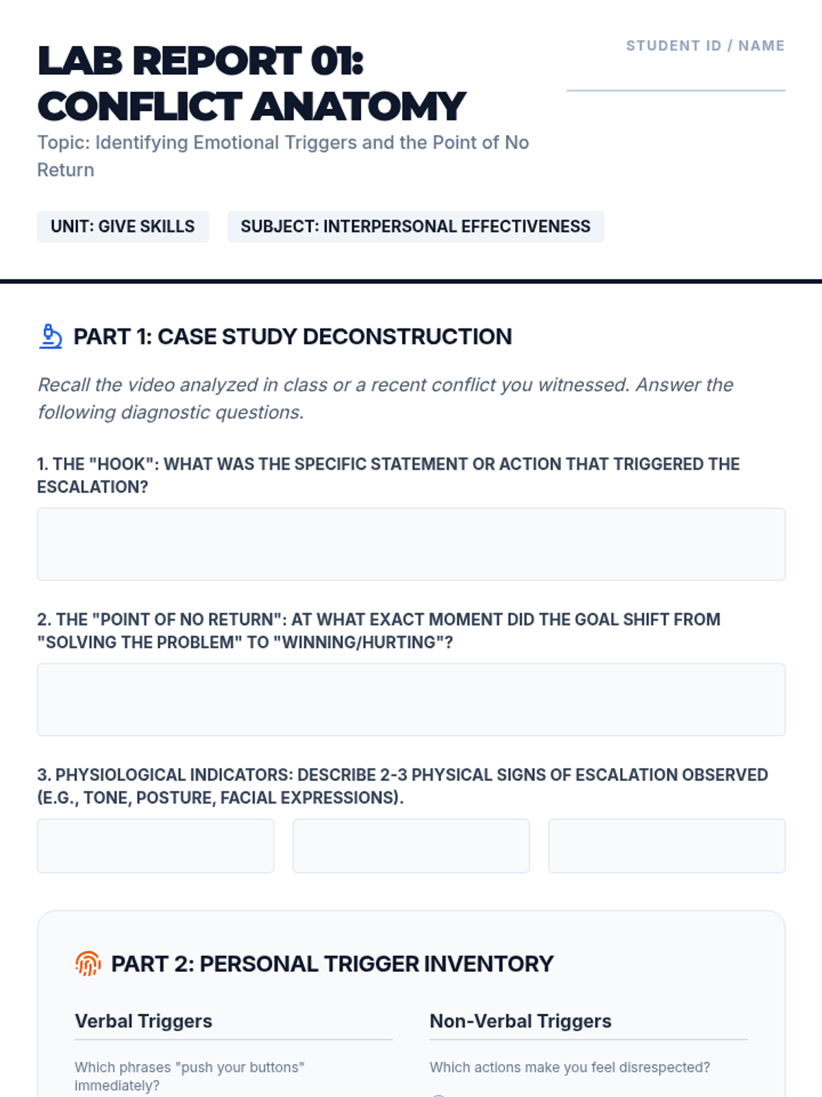 A comprehensive 5-lesson sequence for 11th-grade students focusing on the GIVE interpersonal effectiveness skills. Students move from analyzing emotional triggers and conflict escalation to mastering high-stakes simulations involving authority figures, peers, and complex validation challenges.
