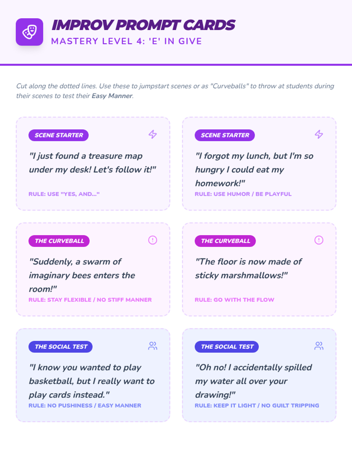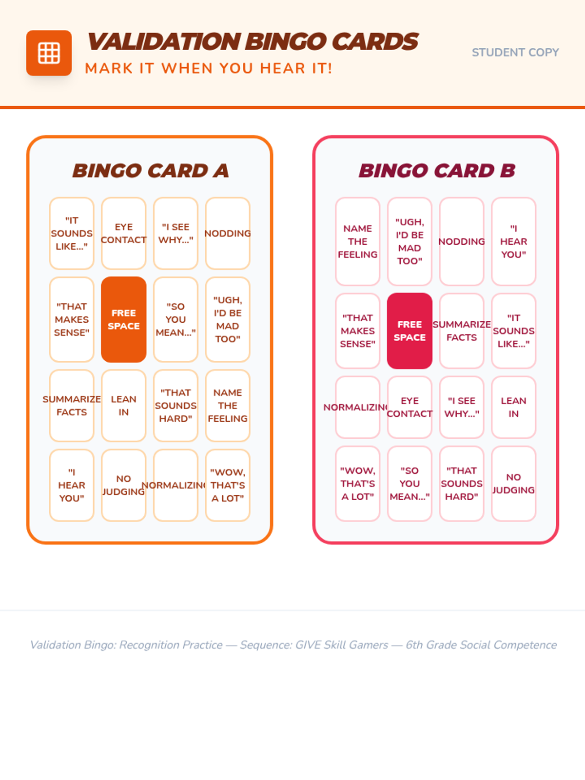 A high-energy, game-based sequence where 6th graders master the GIVE skills for healthy relationships through collaborative challenges and competitive play. Students learn to be Gentle, Interested, Validating, and have an Easy manner in their interactions.