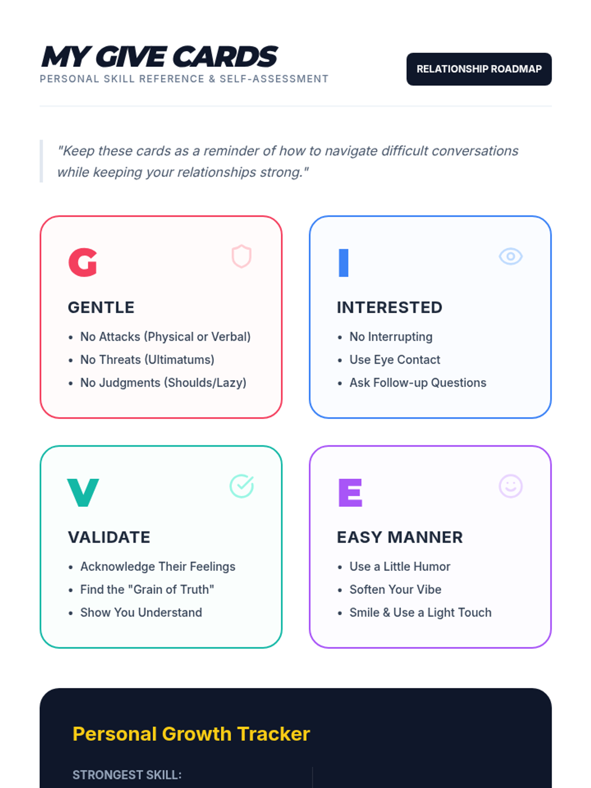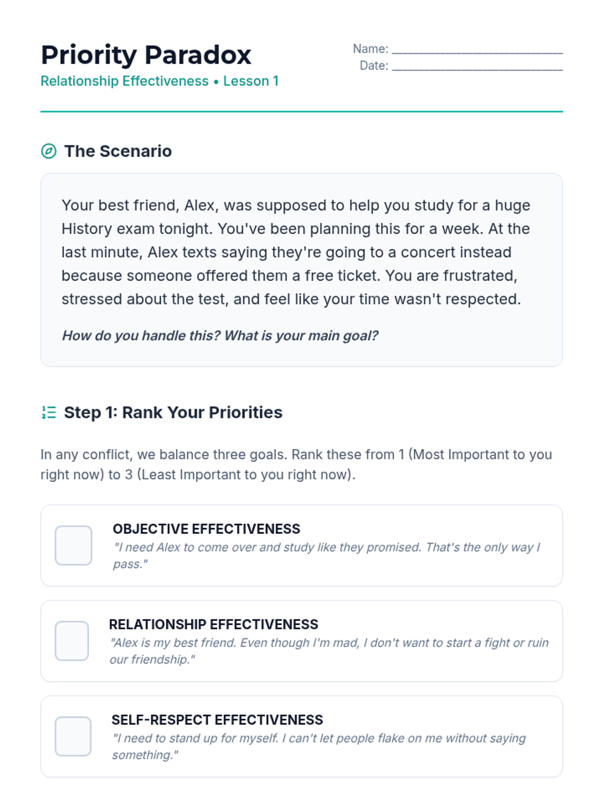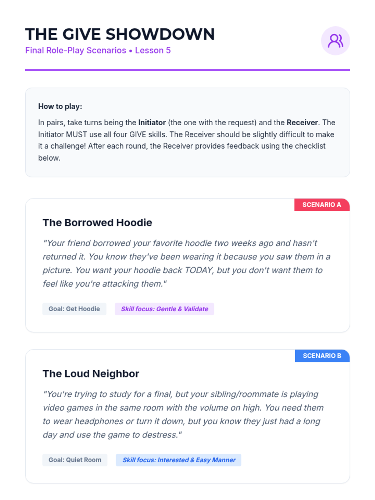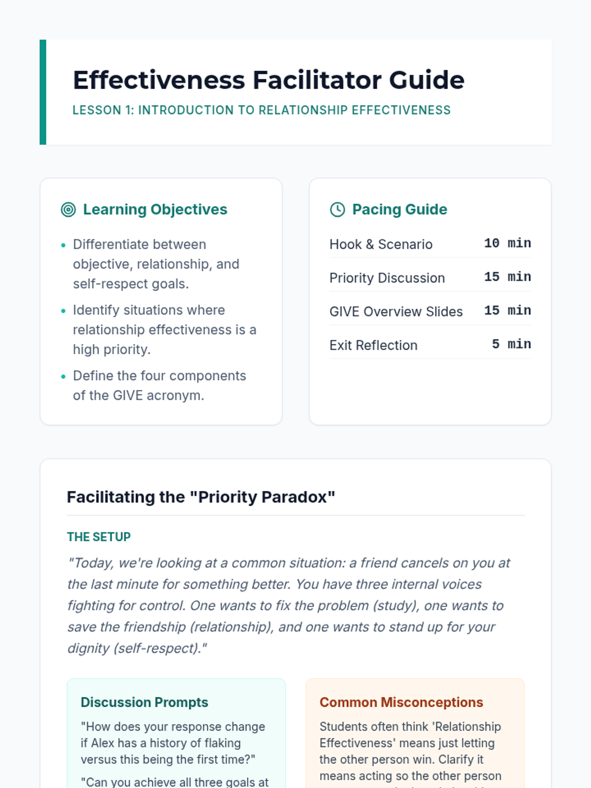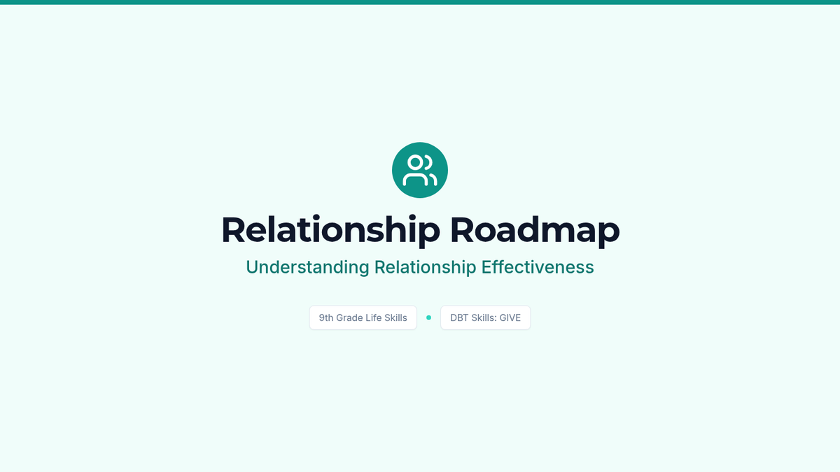 A comprehensive 5-lesson sequence for 9th graders exploring the DBT GIVE acronym (Gentle, Interested, Validate, Easy manner) to improve relationship effectiveness and communication. Students progress from conceptual understanding to hands-on skill integration and role-play.