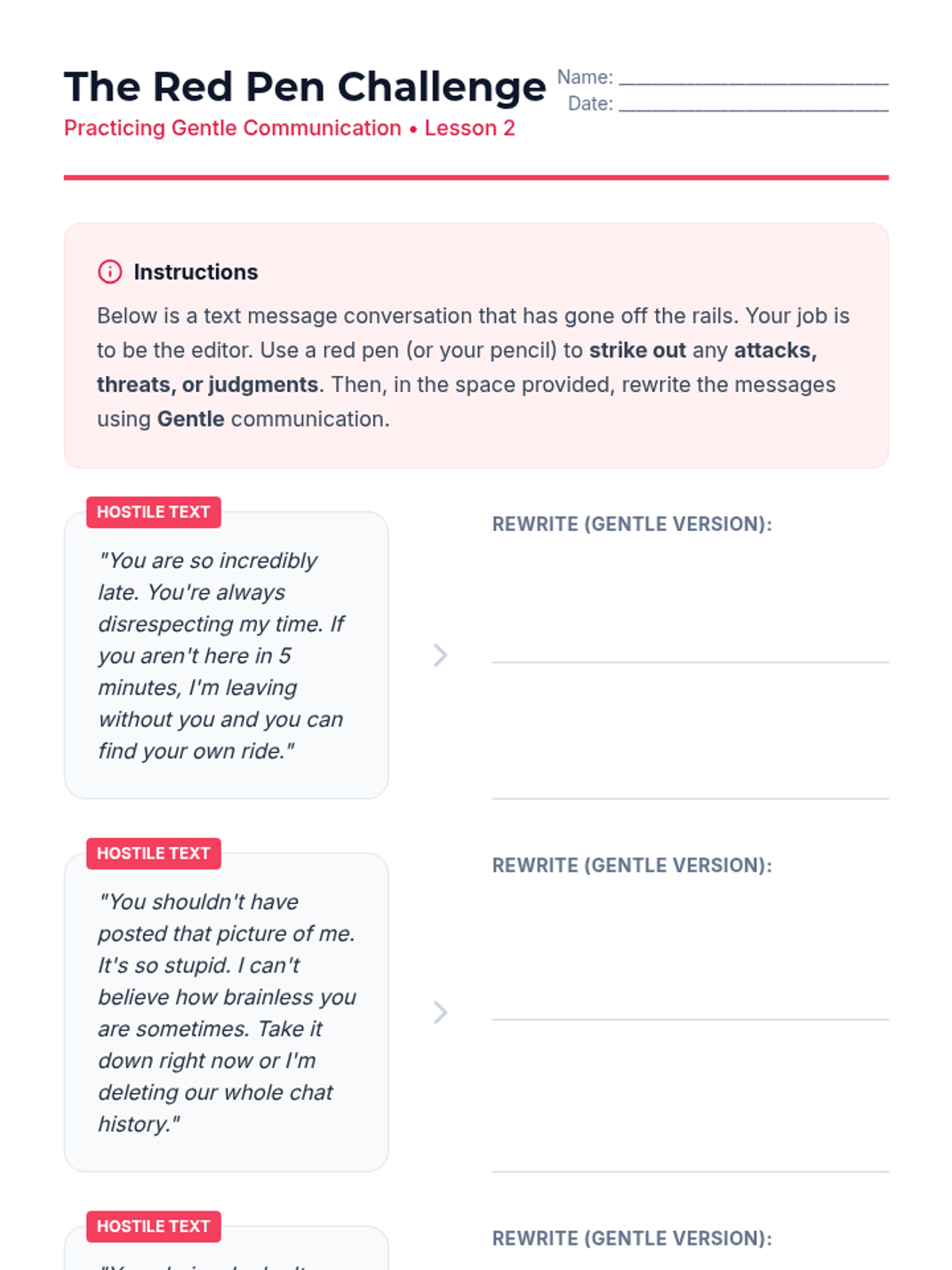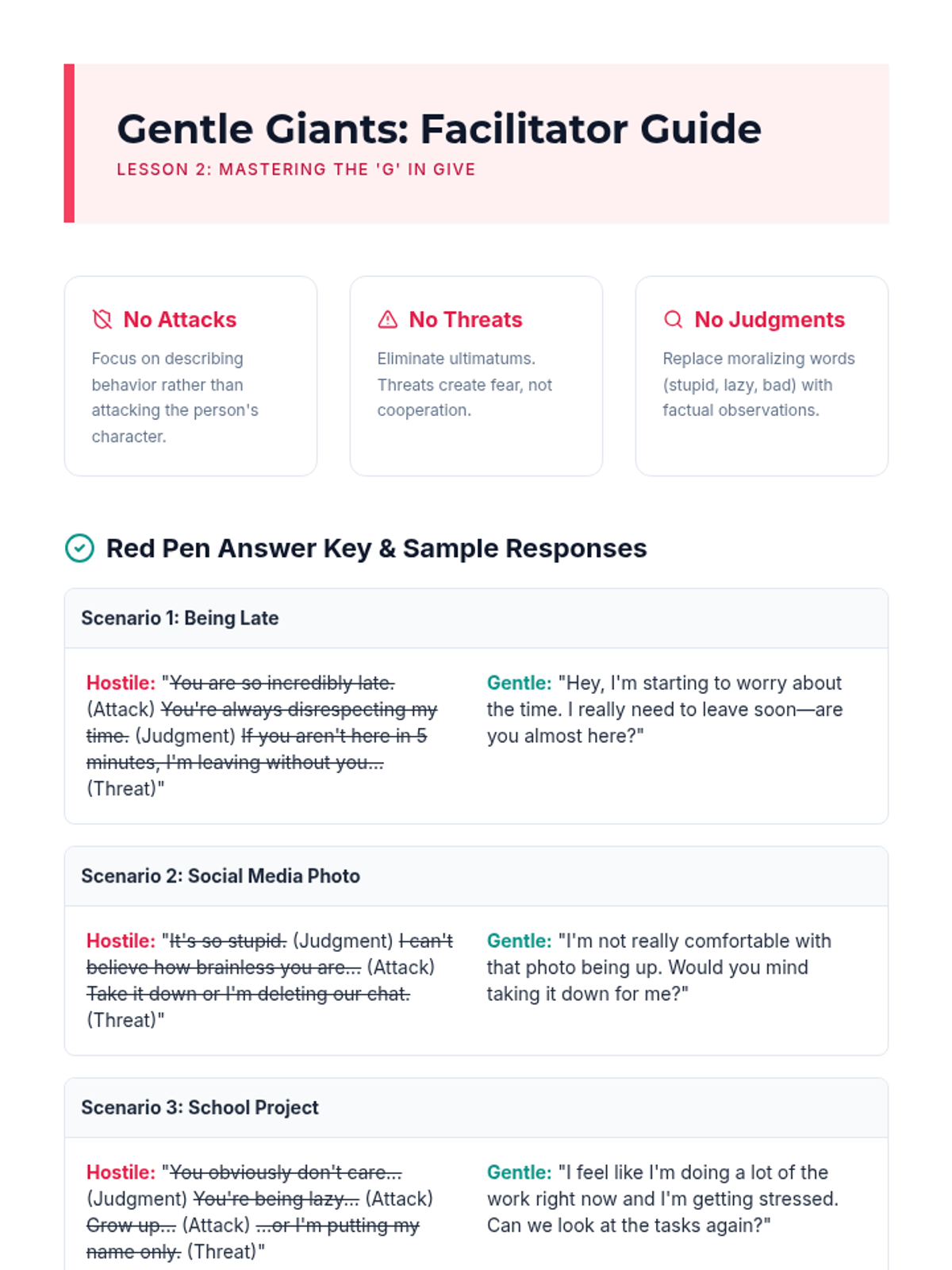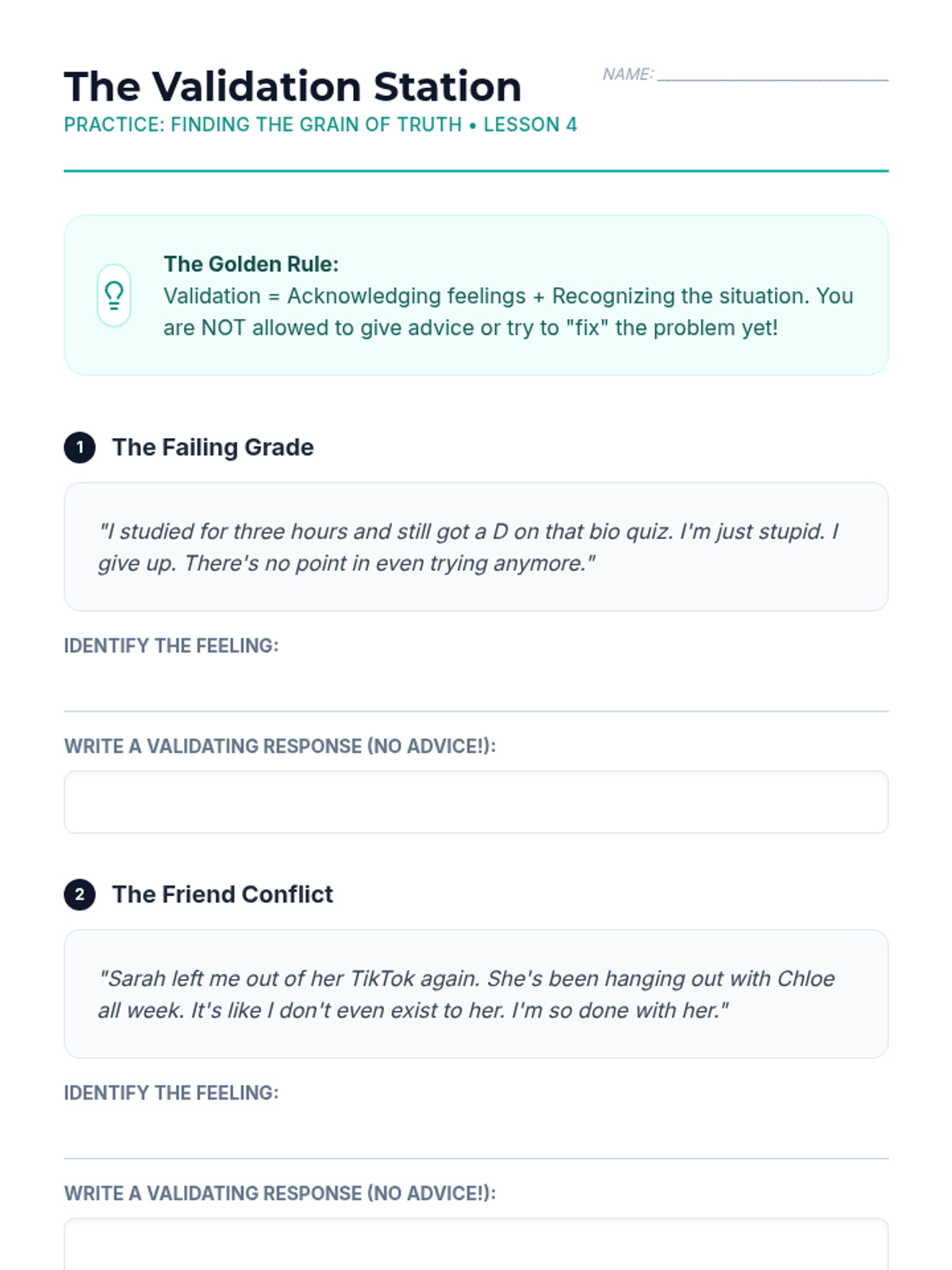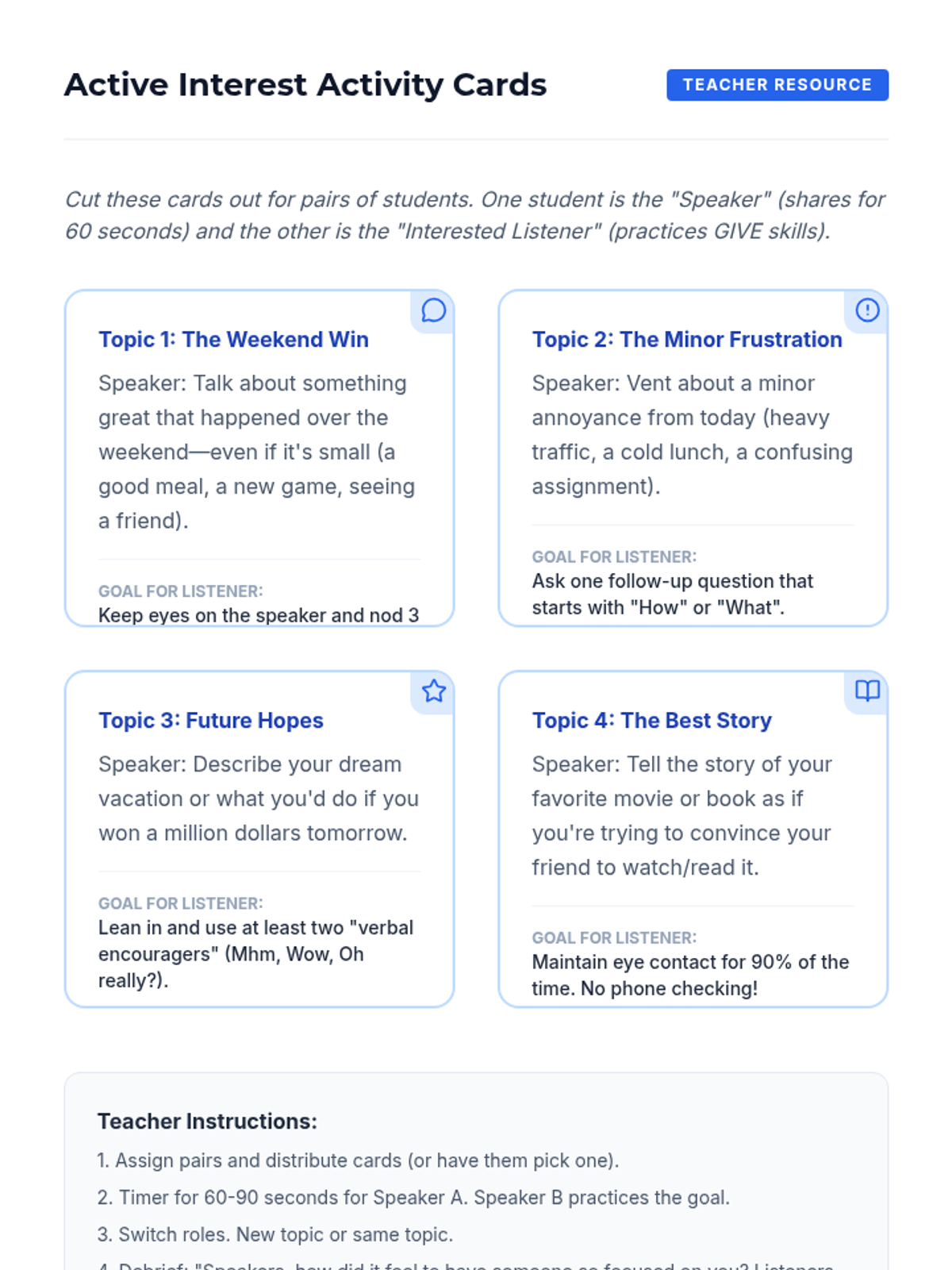 A comprehensive 5-lesson sequence for 9th graders exploring the DBT GIVE acronym (Gentle, Interested, Validate, Easy manner) to improve relationship effectiveness and communication. Students progress from conceptual understanding to hands-on skill integration and role-play.