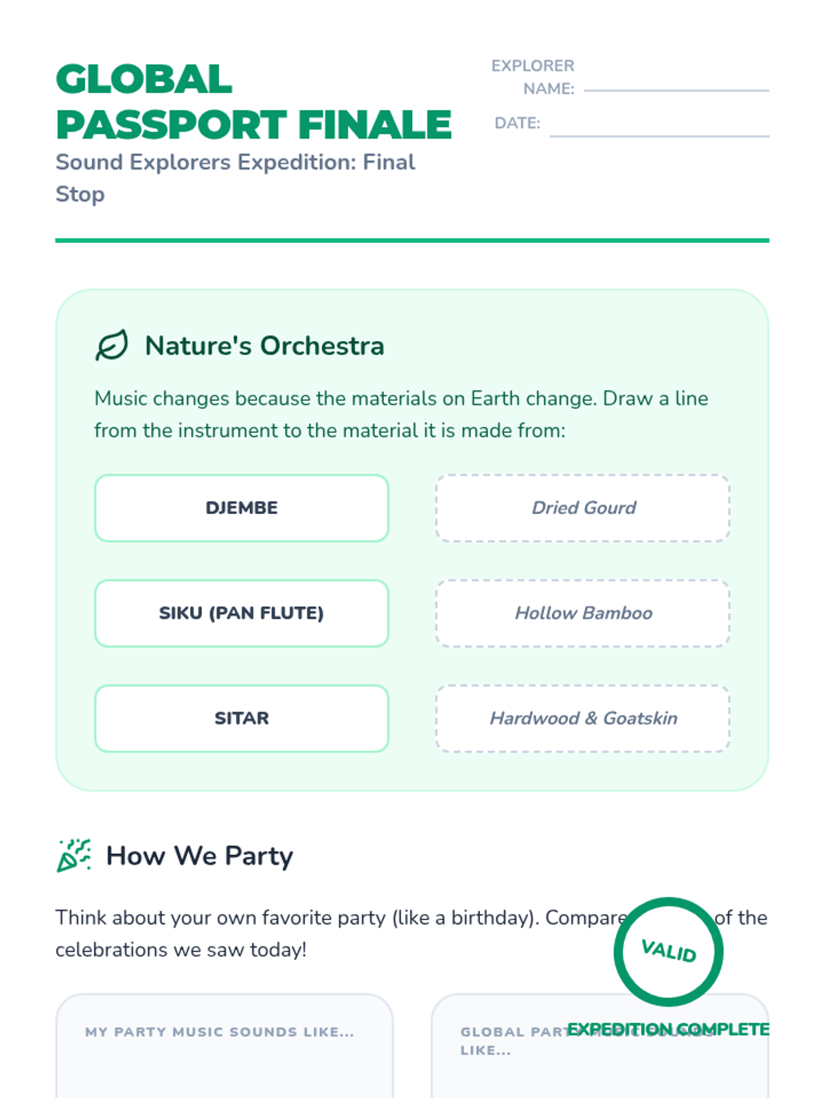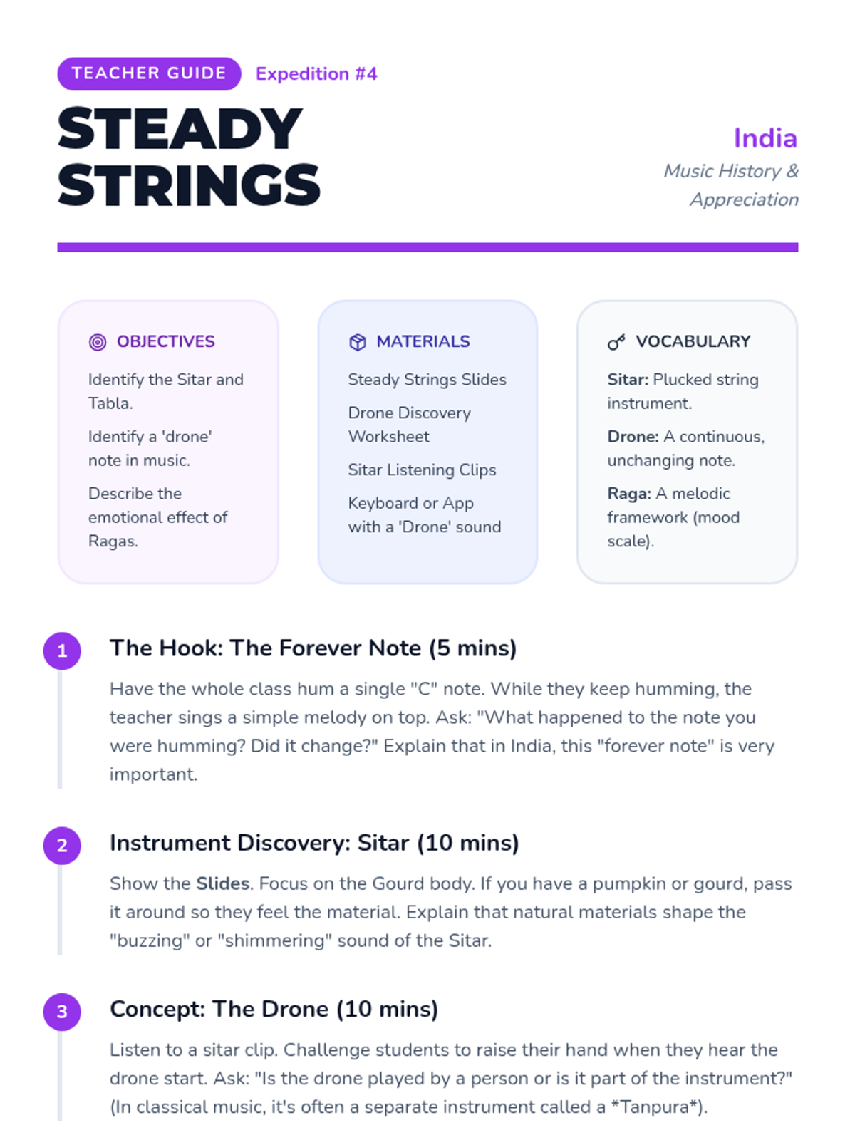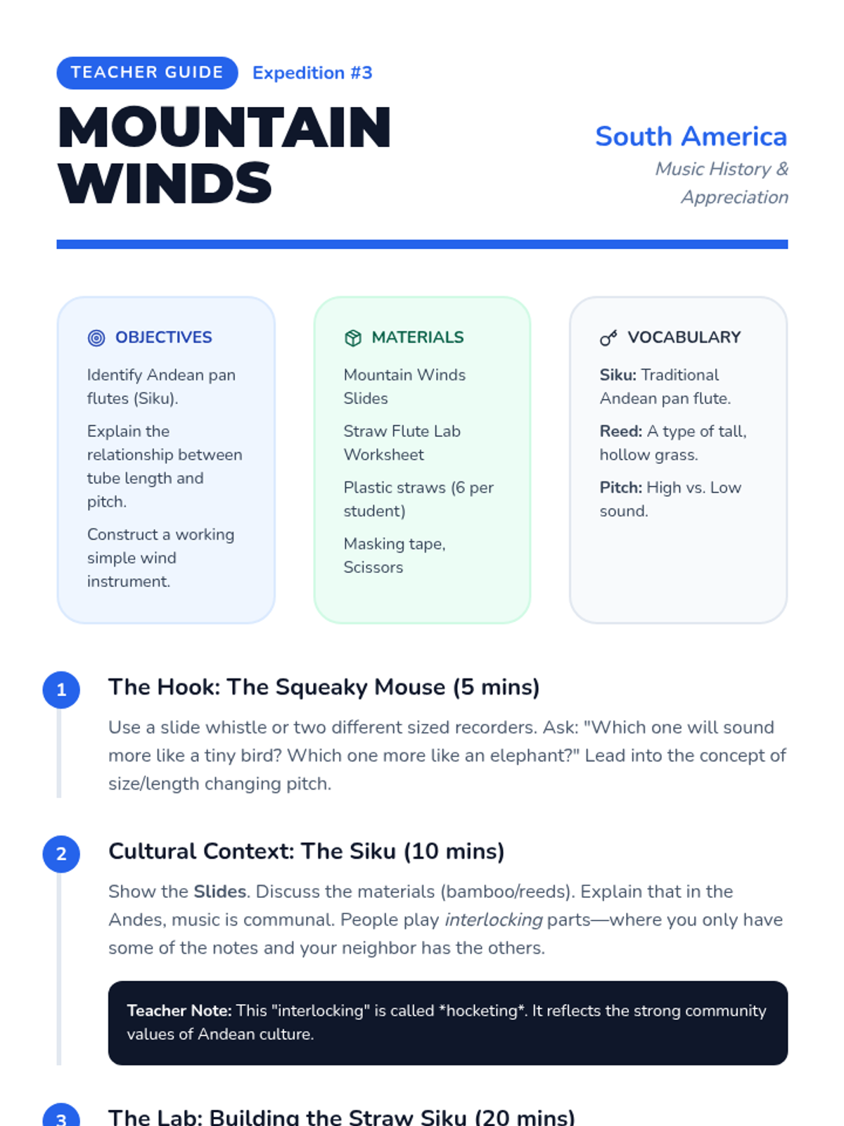 A global musical expedition for 2nd graders to discover how geography and culture shape instruments and traditions across four continents. Students explore materials, physics of sound, and the cultural roles of music through inquiry and hands-on activities.