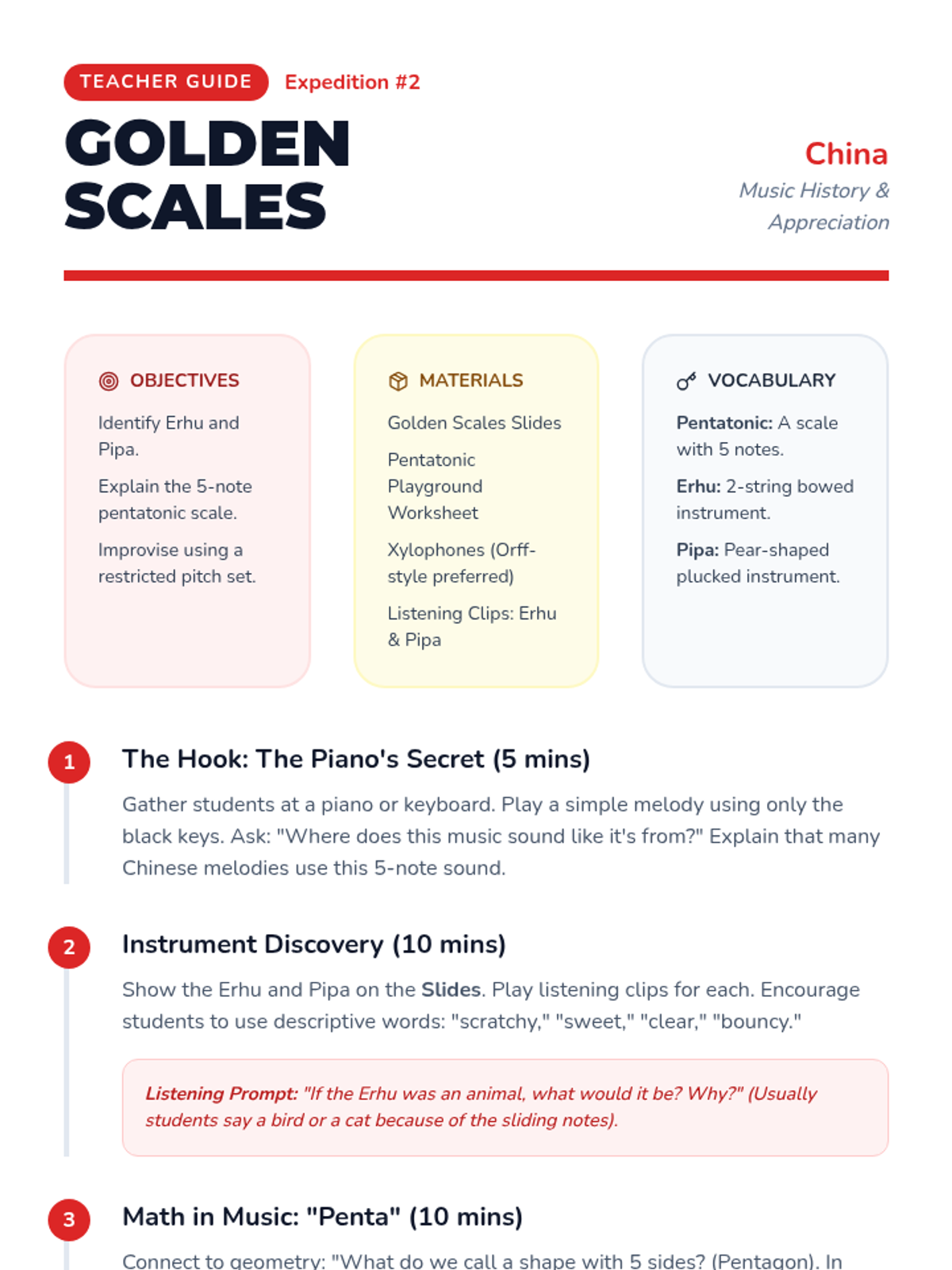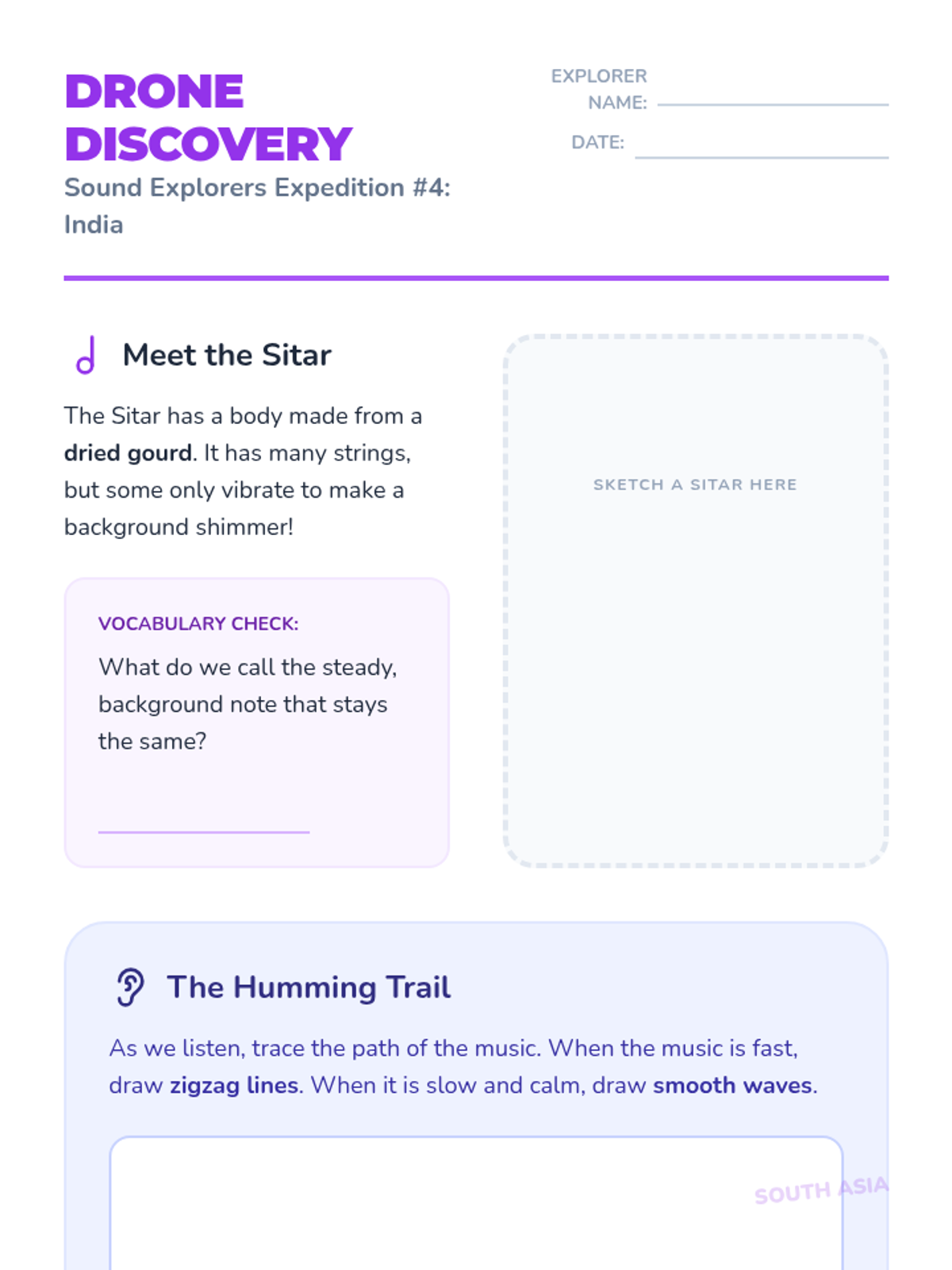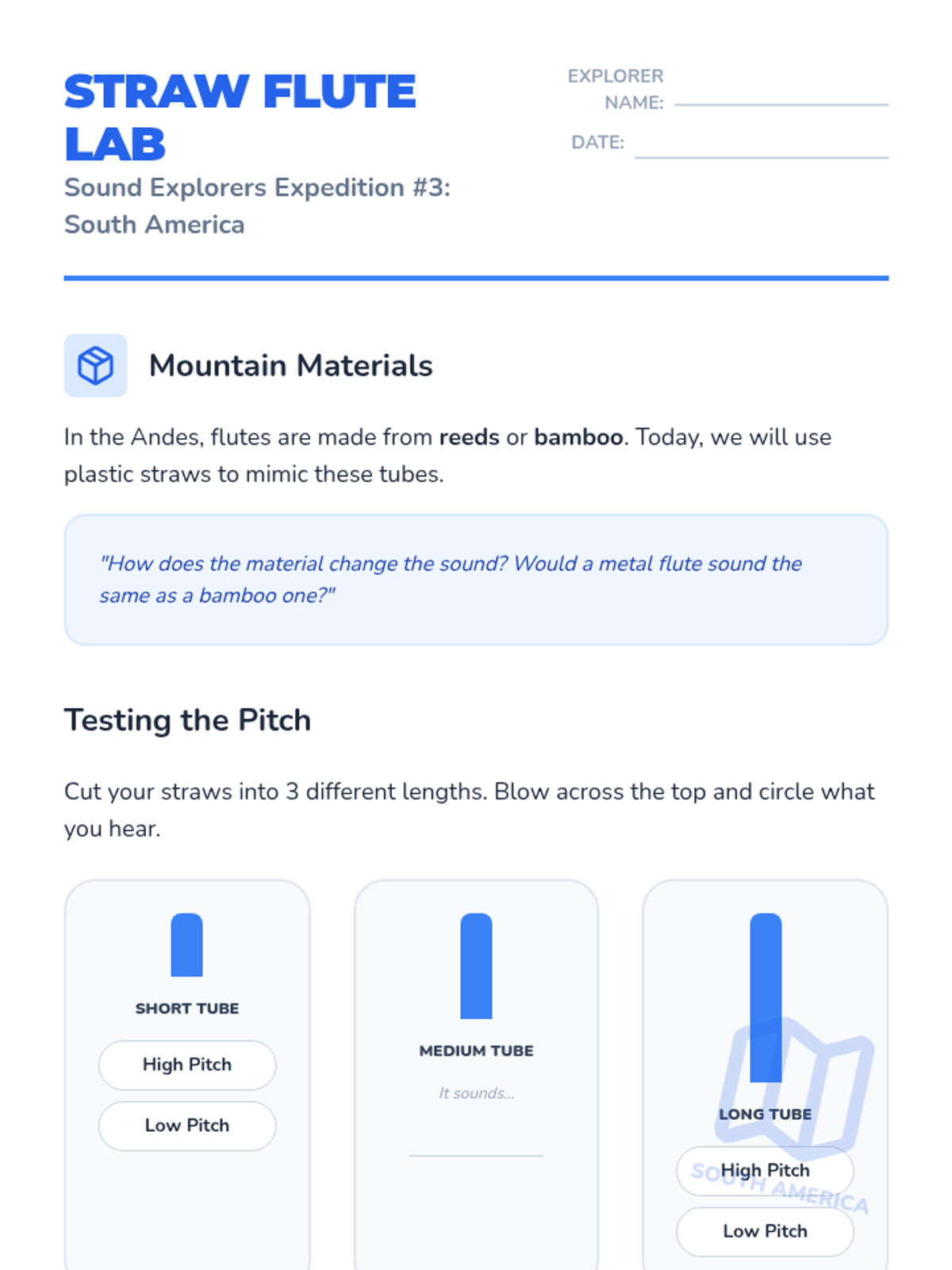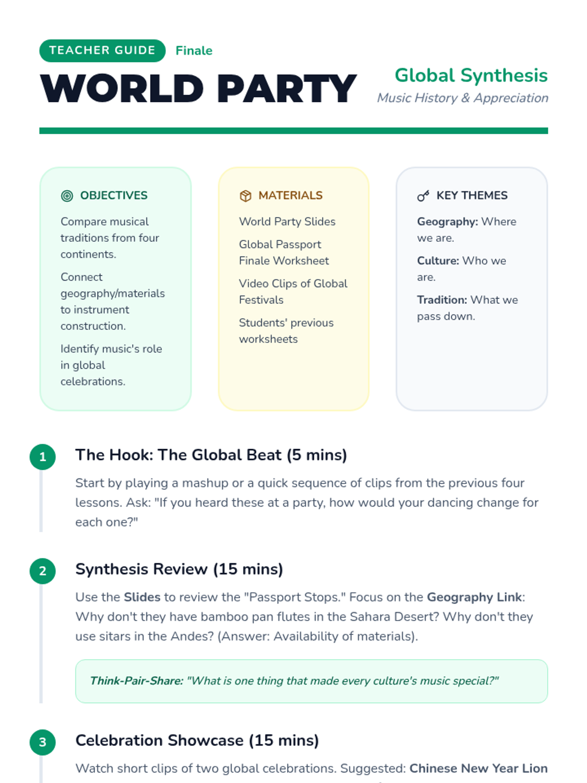 A global musical expedition for 2nd graders to discover how geography and culture shape instruments and traditions across four continents. Students explore materials, physics of sound, and the cultural roles of music through inquiry and hands-on activities.