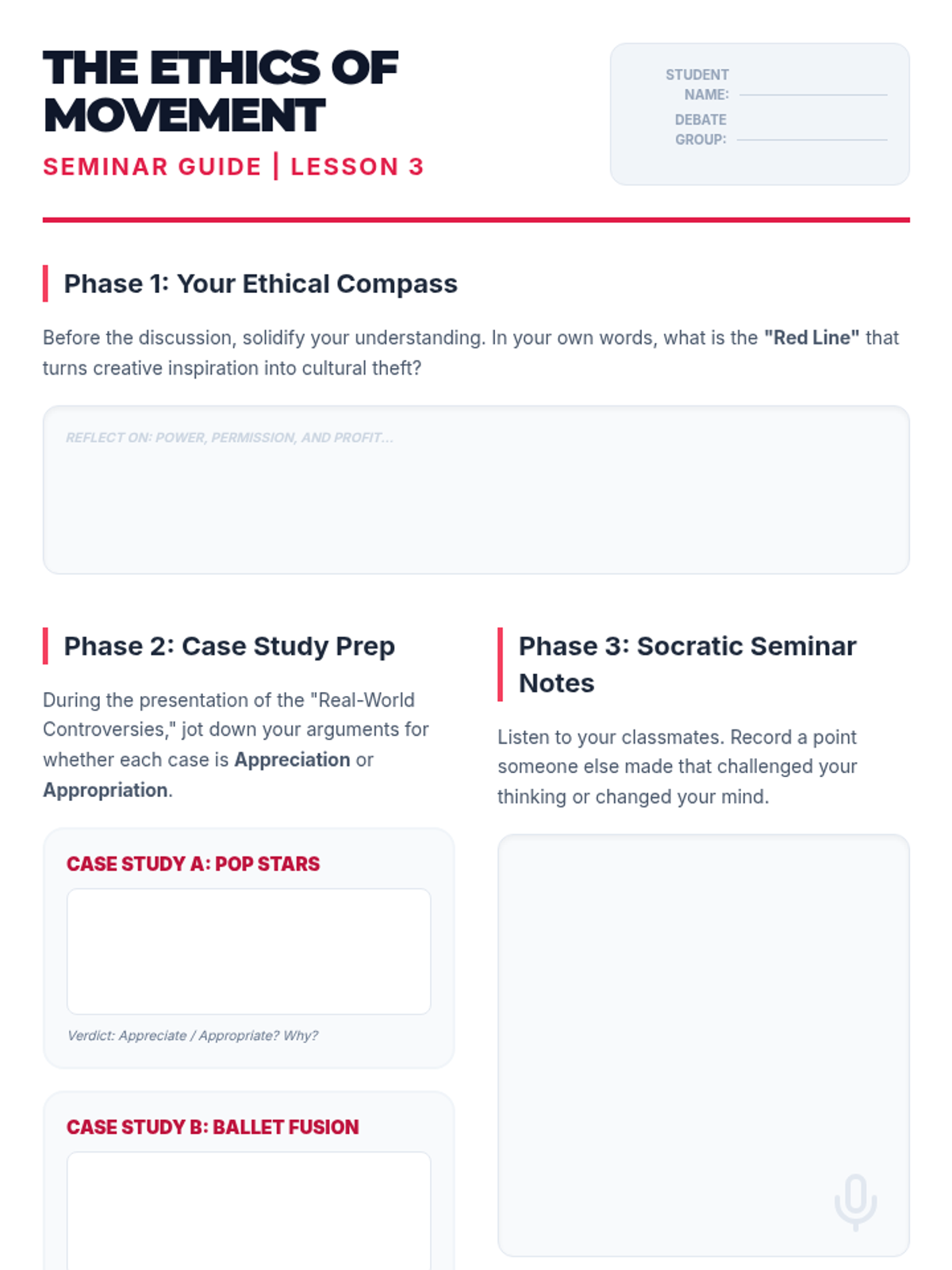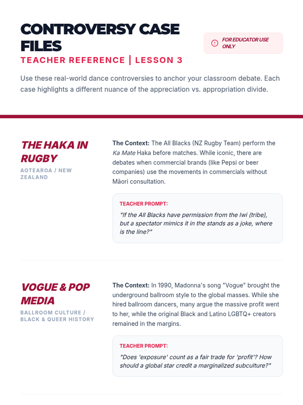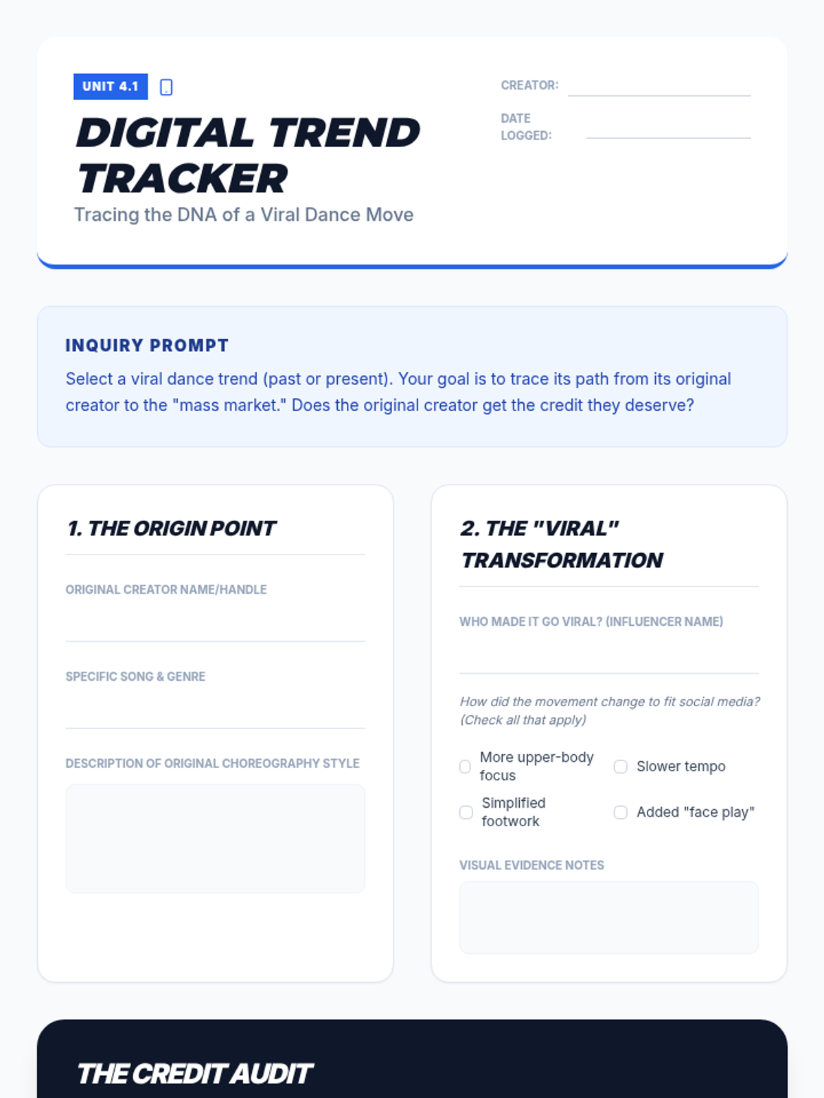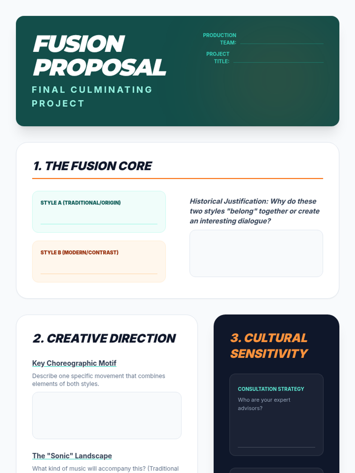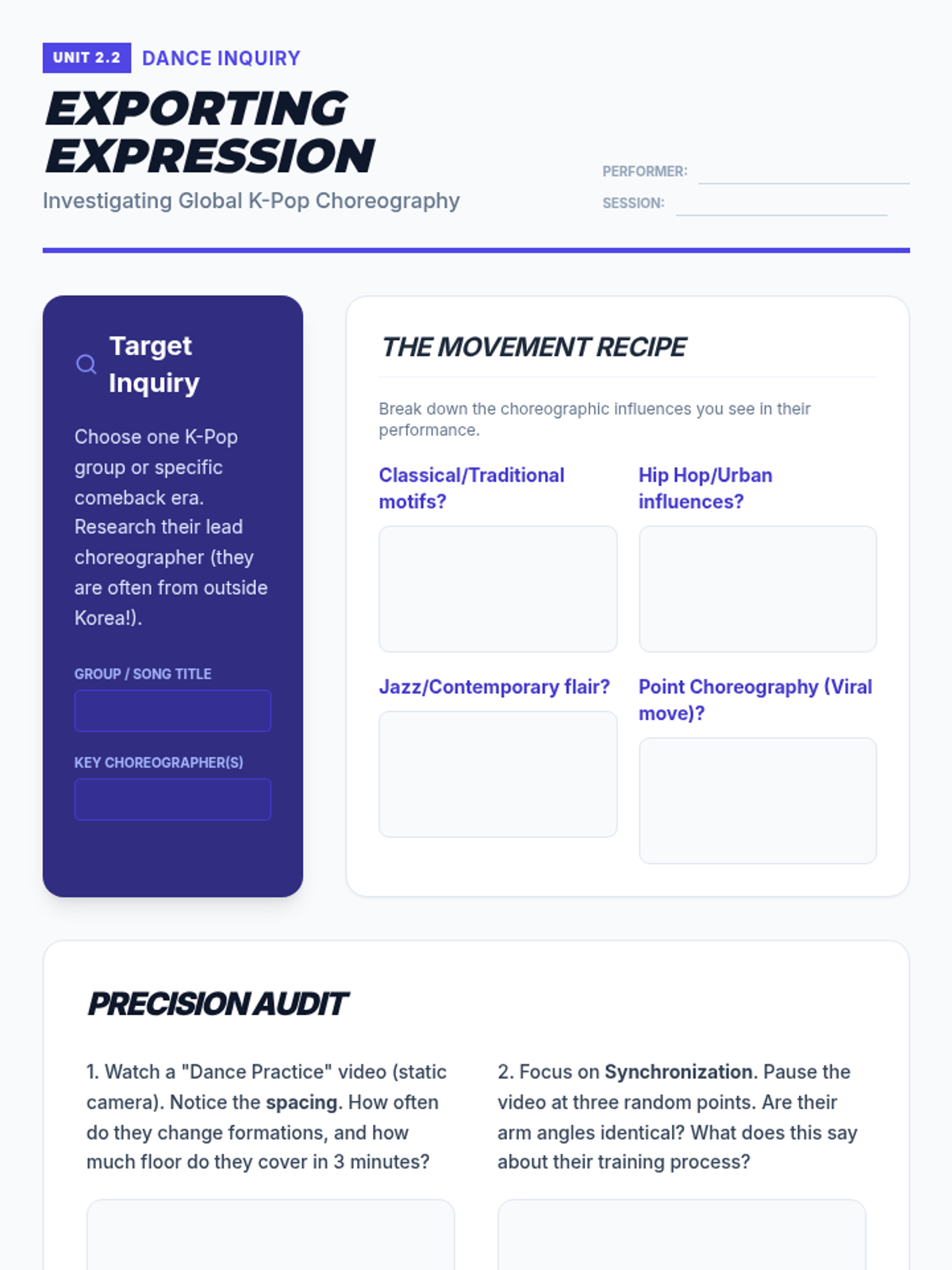 This 10th-grade sequence explores the intersection of globalization, technology, and dance culture. Students analyze Bollywood's fusion, K-Pop's global marketing, the ethics of cultural appropriation, and the impact of social media on choreography, culminating in a respectful cross-cultural fusion proposal.