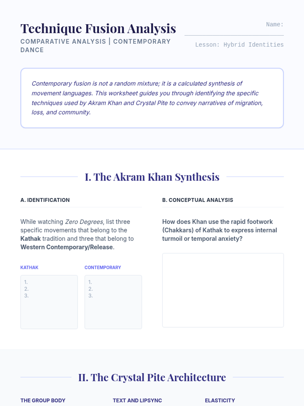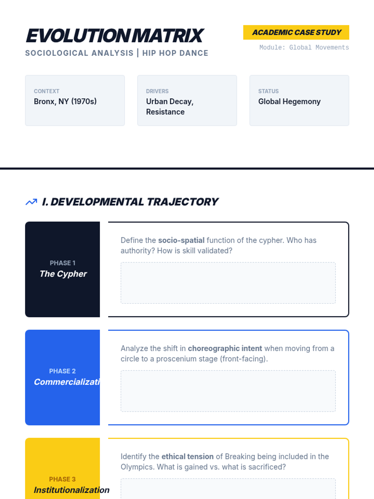 This sequence explores the evolution of dance in the 20th and 21st centuries, focusing on how globalization and the African Diaspora have reshaped the concert dance canon. Students analyze Hip Hop, Butoh, and contemporary fusion to understand the shifting boundaries of 'high art'.