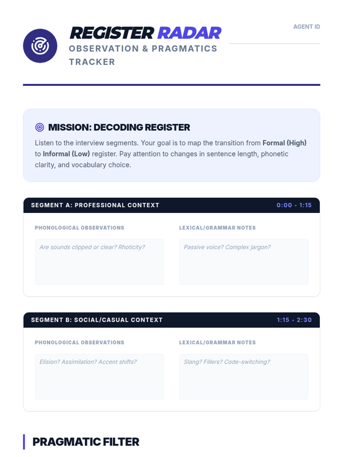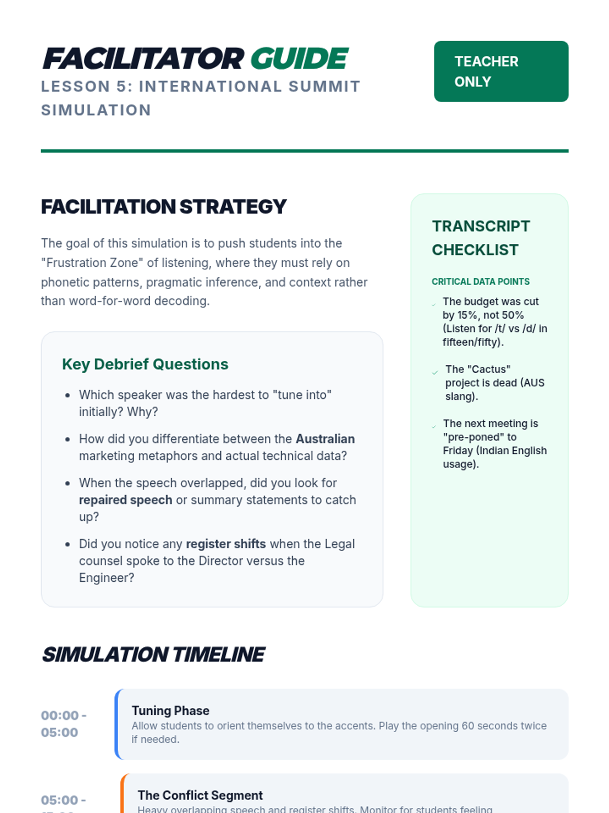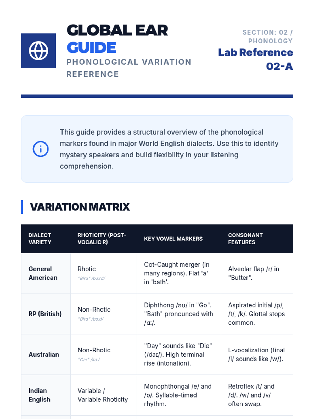 This sequence addresses the challenges of understanding natural, non-standardized English in global contexts, moving beyond textbook audio to explore regional dialects, strong accents, and connected speech. Students investigate how cultural context shapes language use and practice decoding colloquialisms and slang, culminating in a simulation of diverse English varieties in a professional setting.