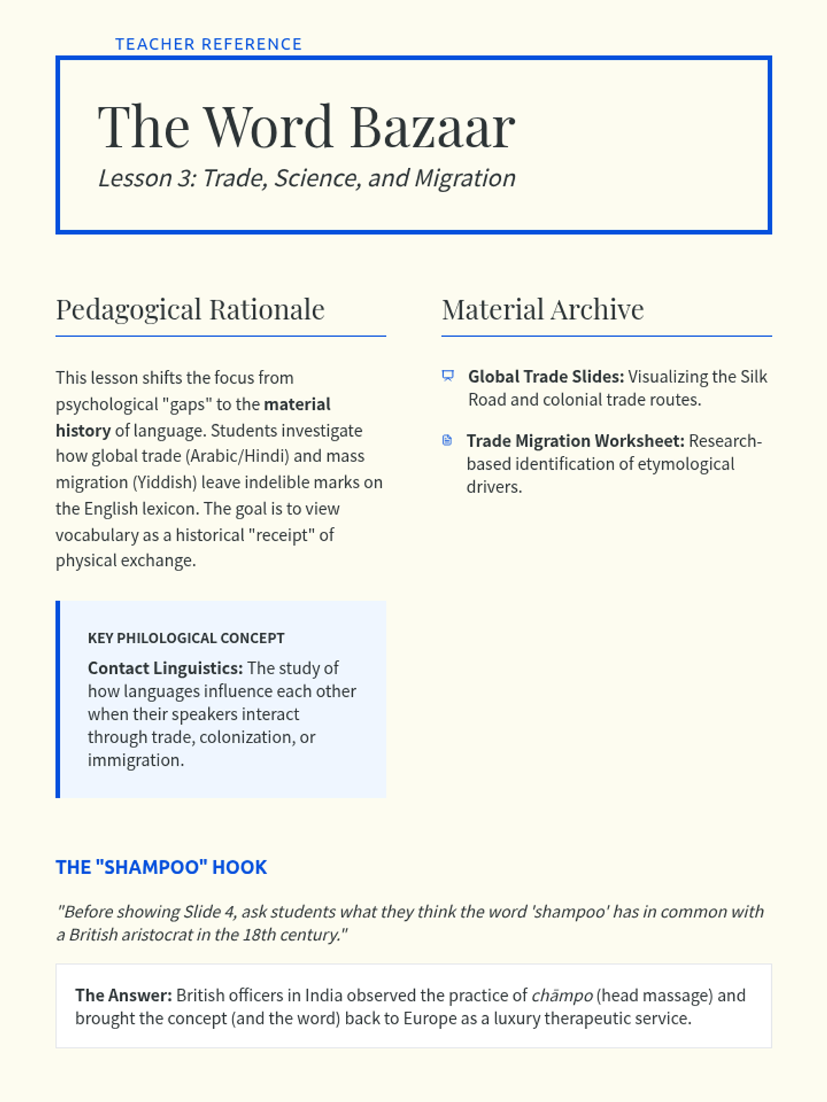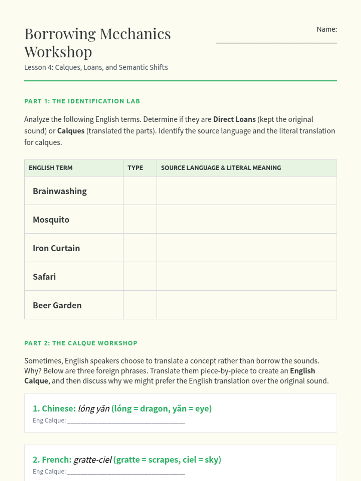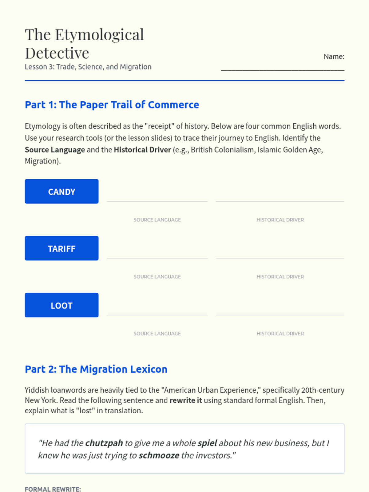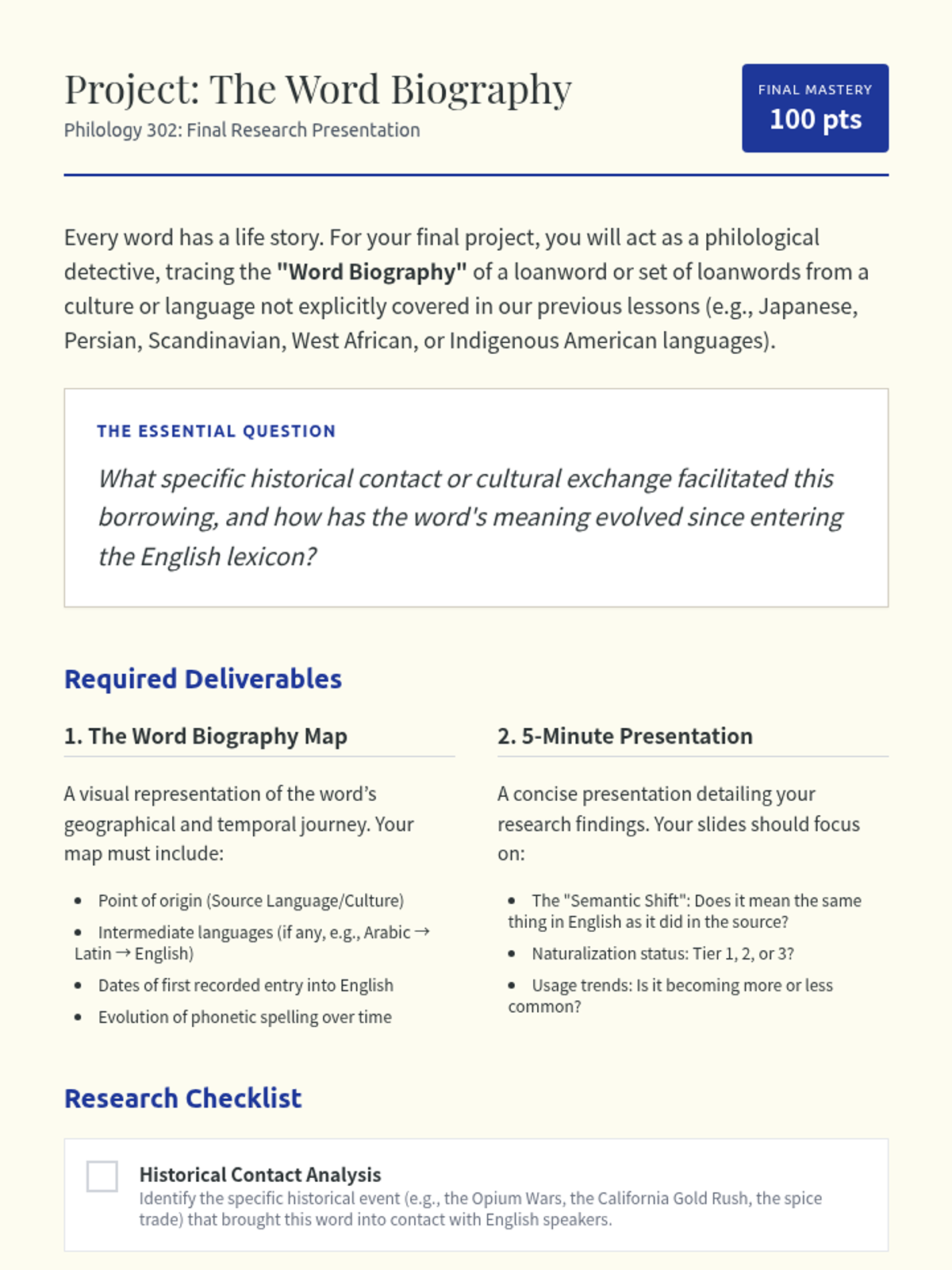 An undergraduate-level exploration of loanwords in English, focusing on the sociolinguistic history and philological origins of terms from German, Spanish, Italian, Arabic, Hindi, and Yiddish. Students investigate how culture, philosophy, and trade shape the lexicon.