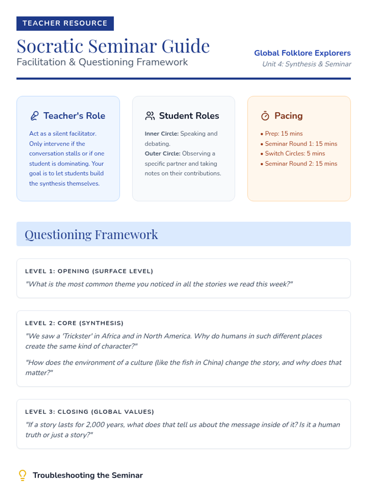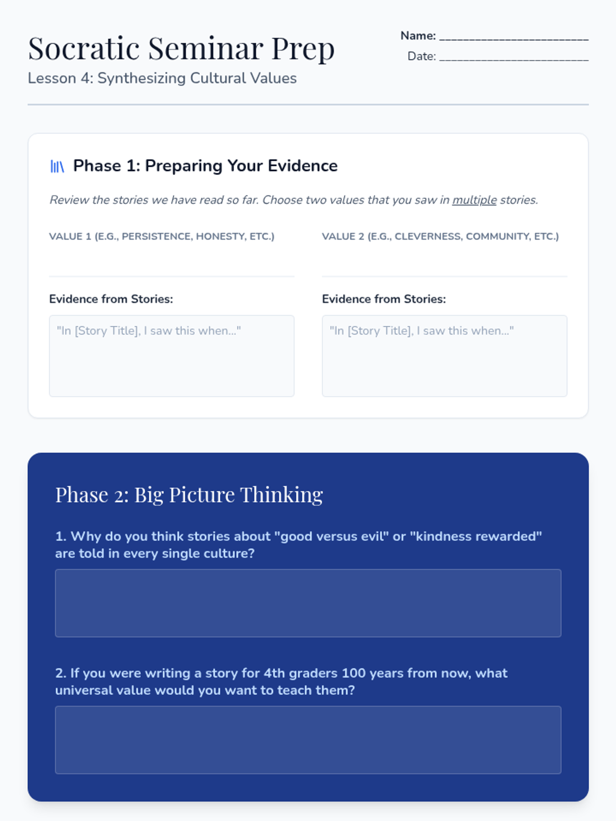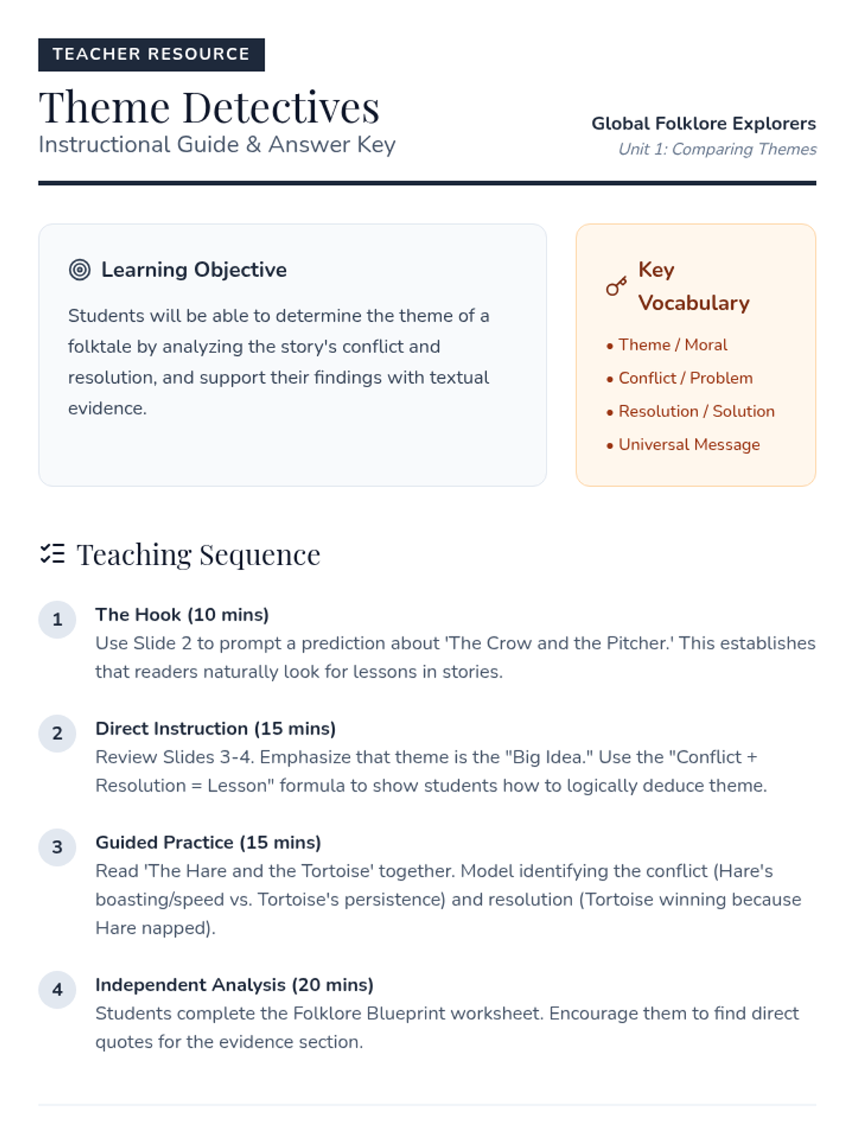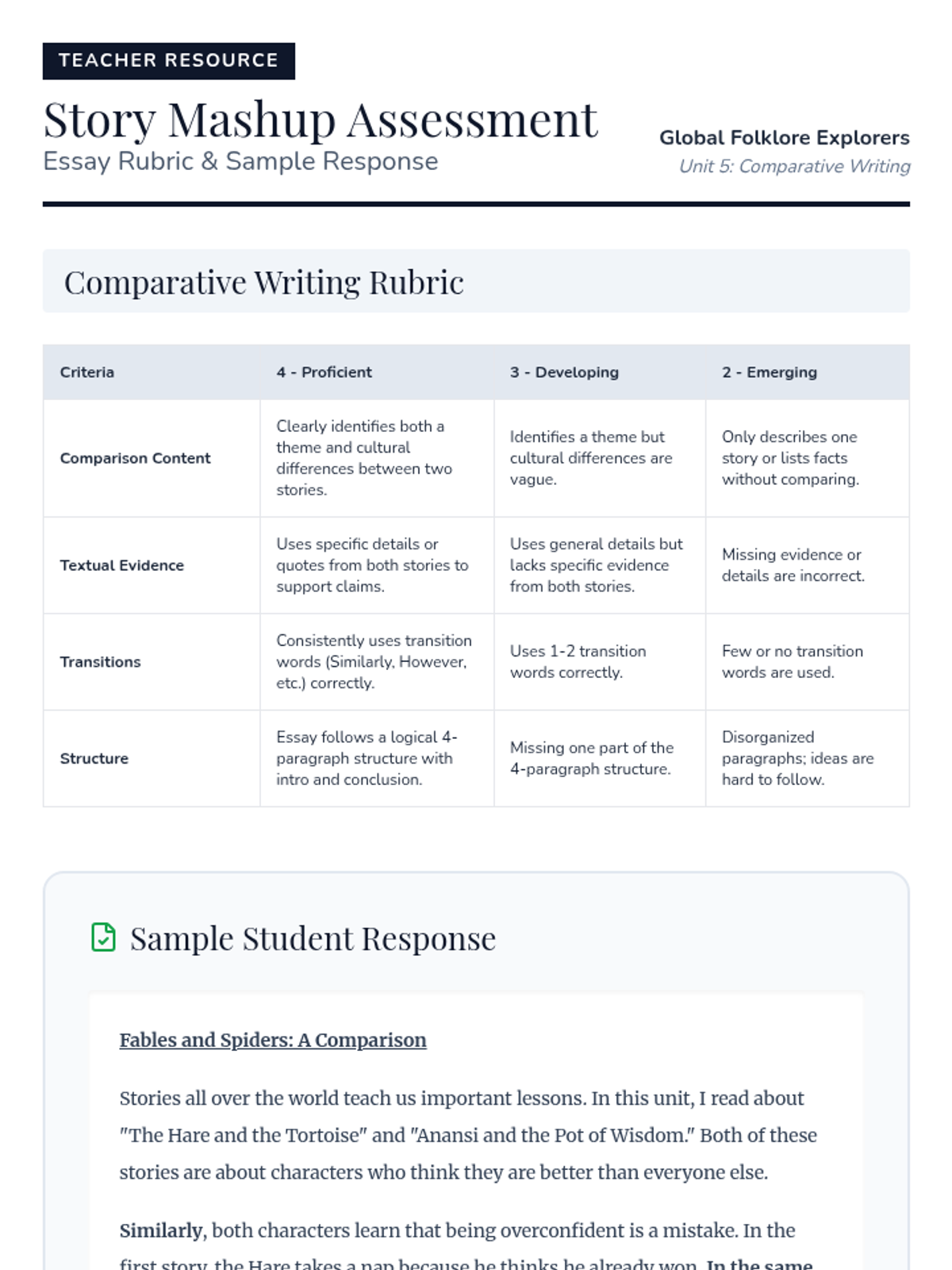 A 4th-grade ELA unit focused on comparing and contrasting themes, characters, and cultural values across global folklore, culminating in a comparative essay.