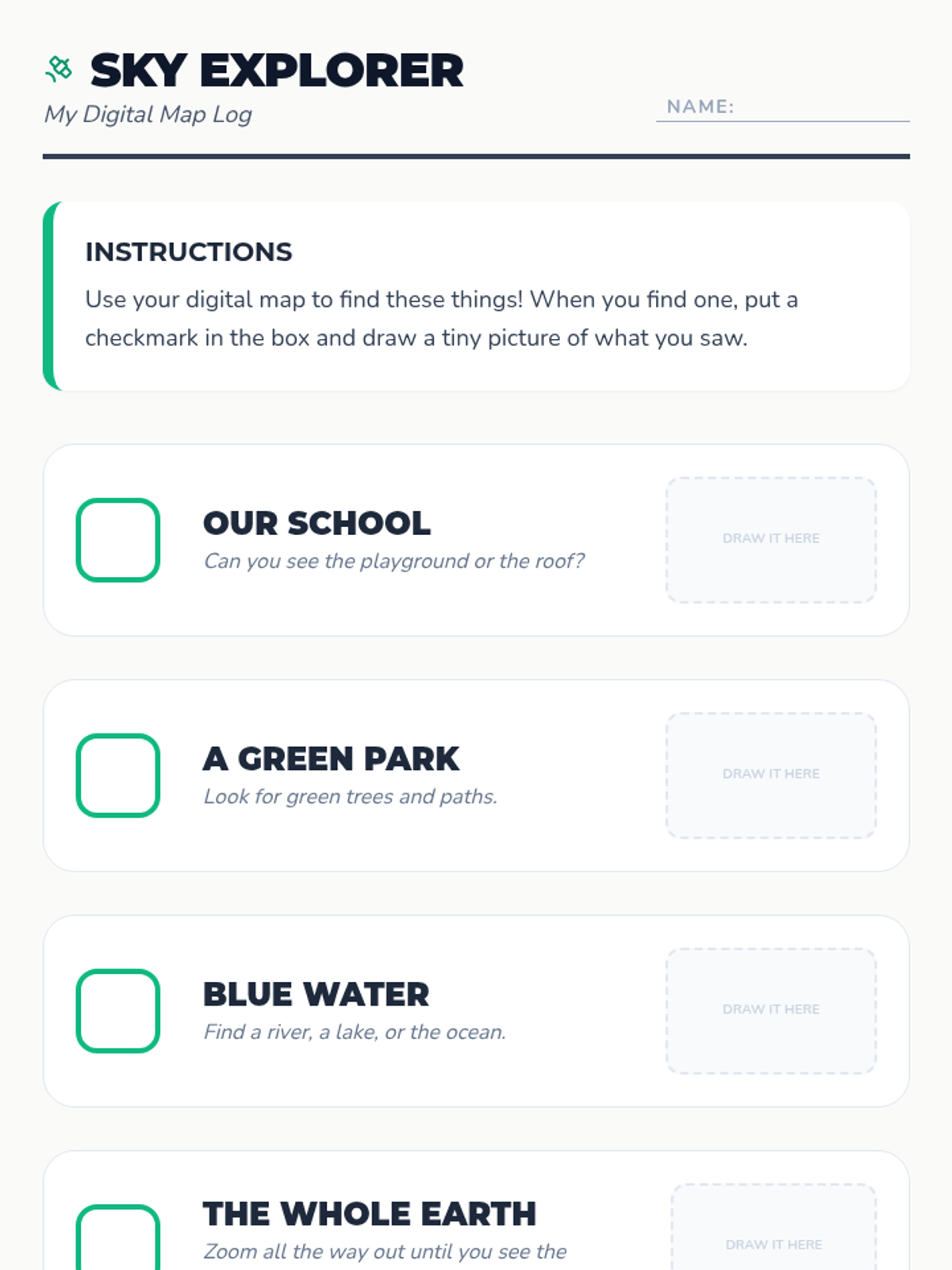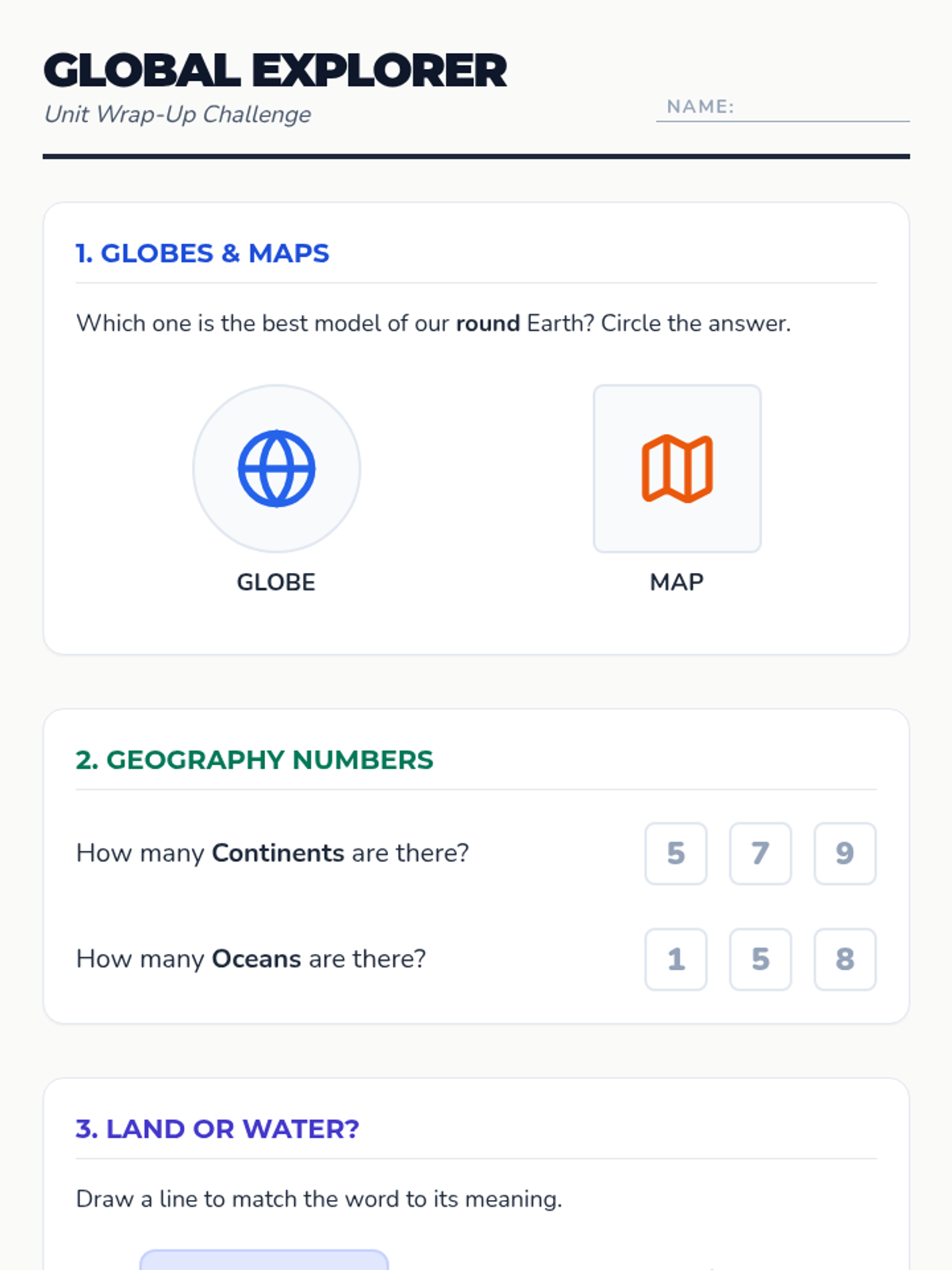A 1st Grade geography unit exploring the differences between maps and globes, identifying continents and oceans, and understanding hierarchical location from home to the planet.