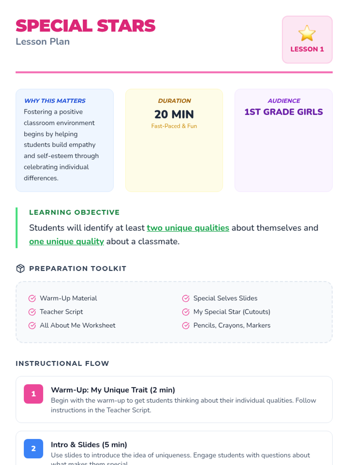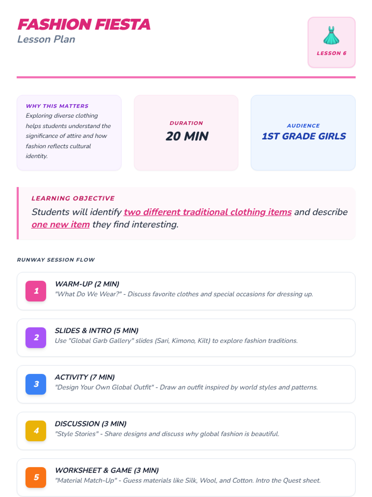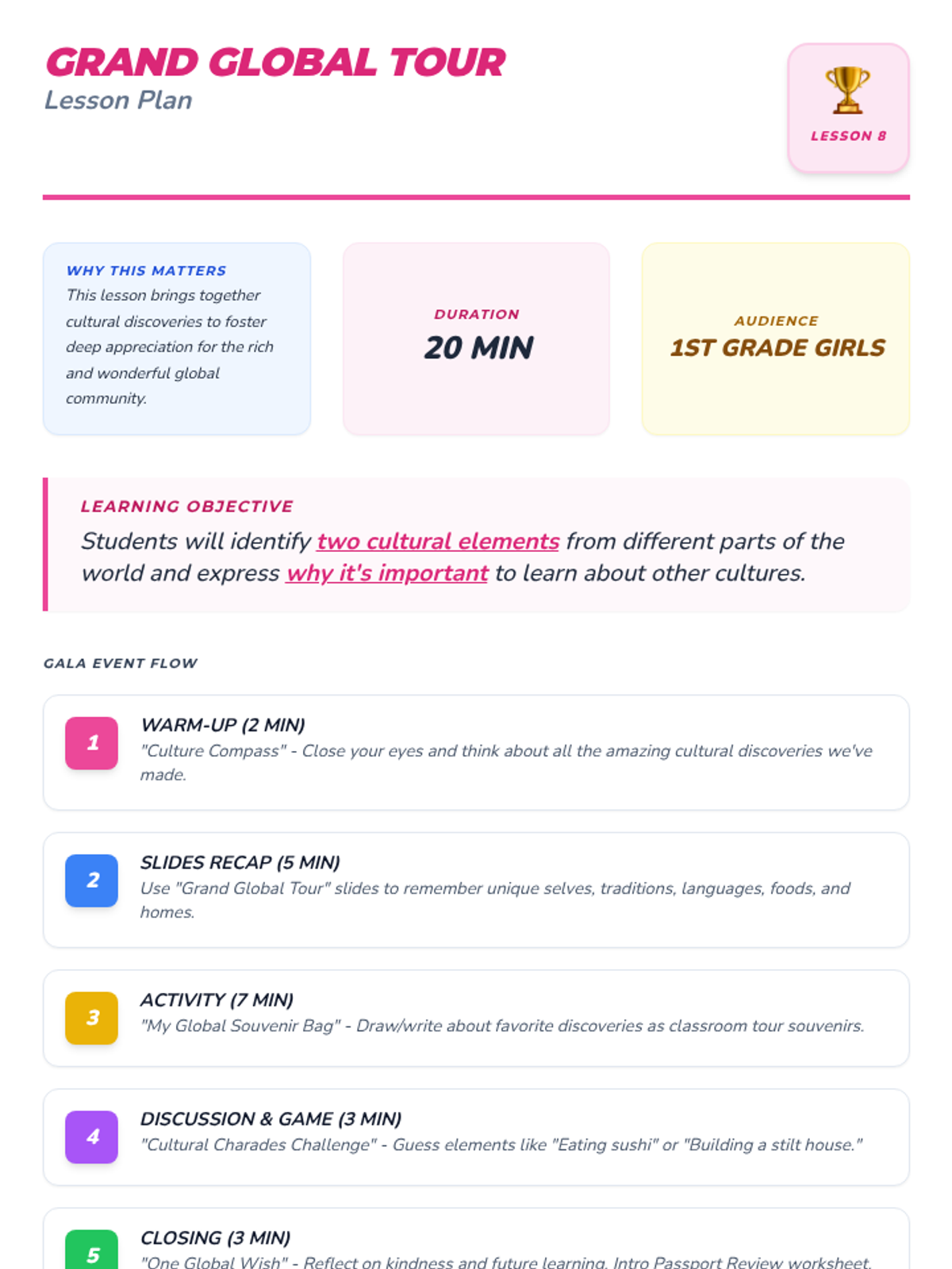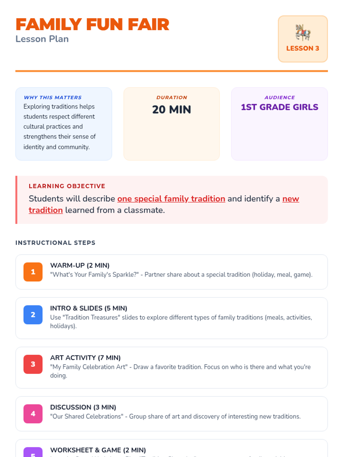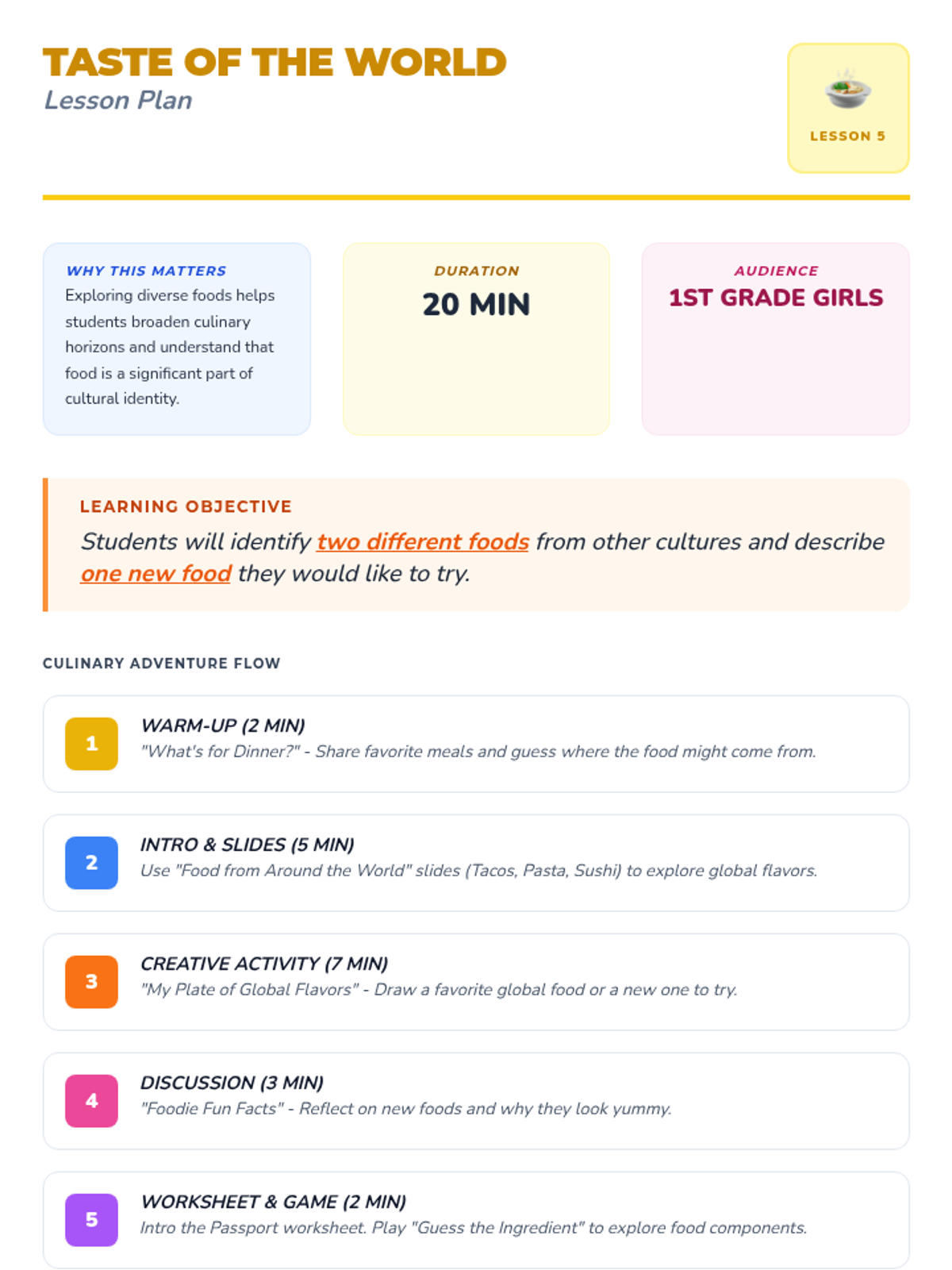 An 8-session cultural exploration sequence for 1st-grade girls, celebrating individual uniqueness, family traditions, and global diversity through food, language, fashion, and homes.