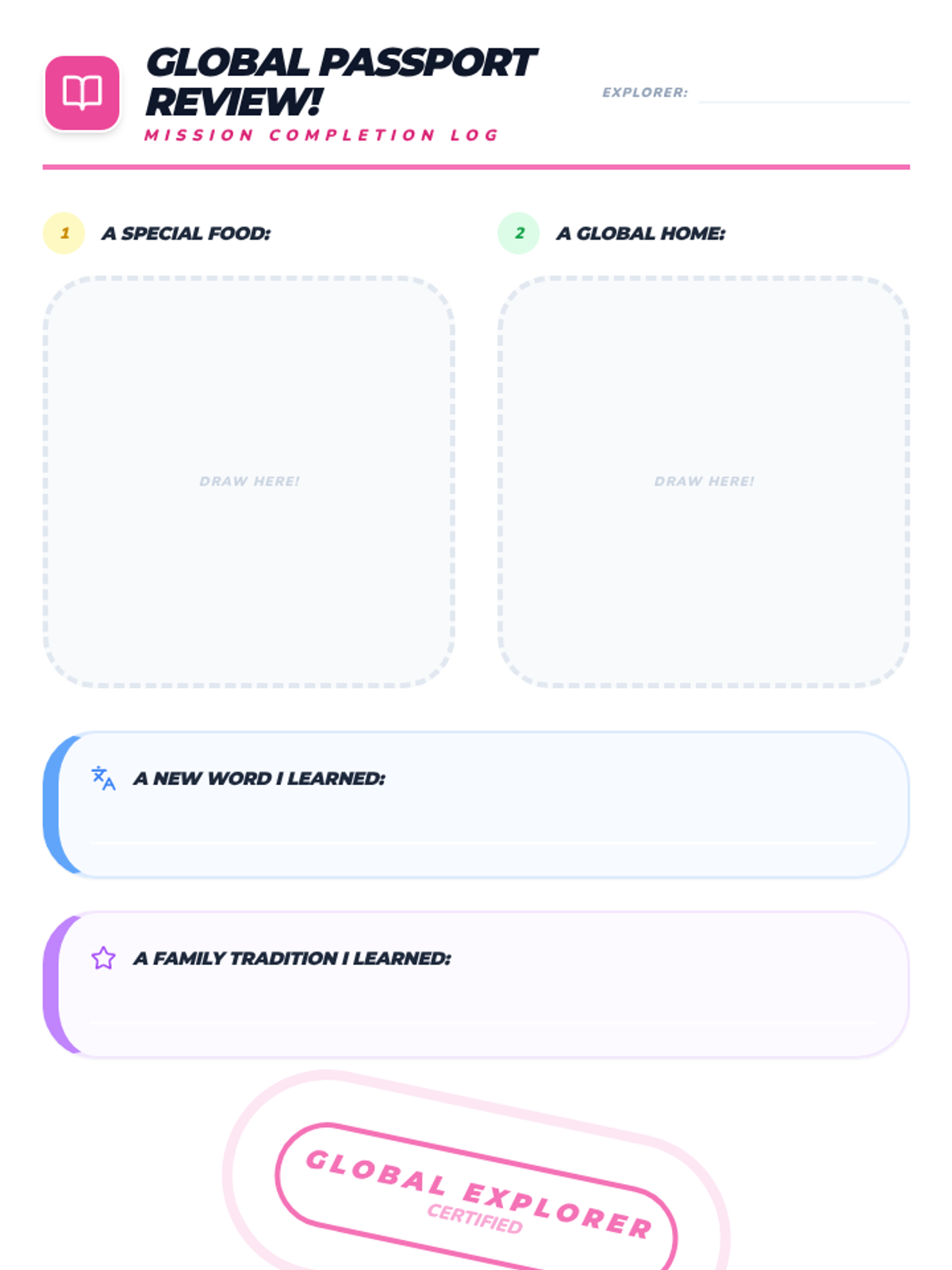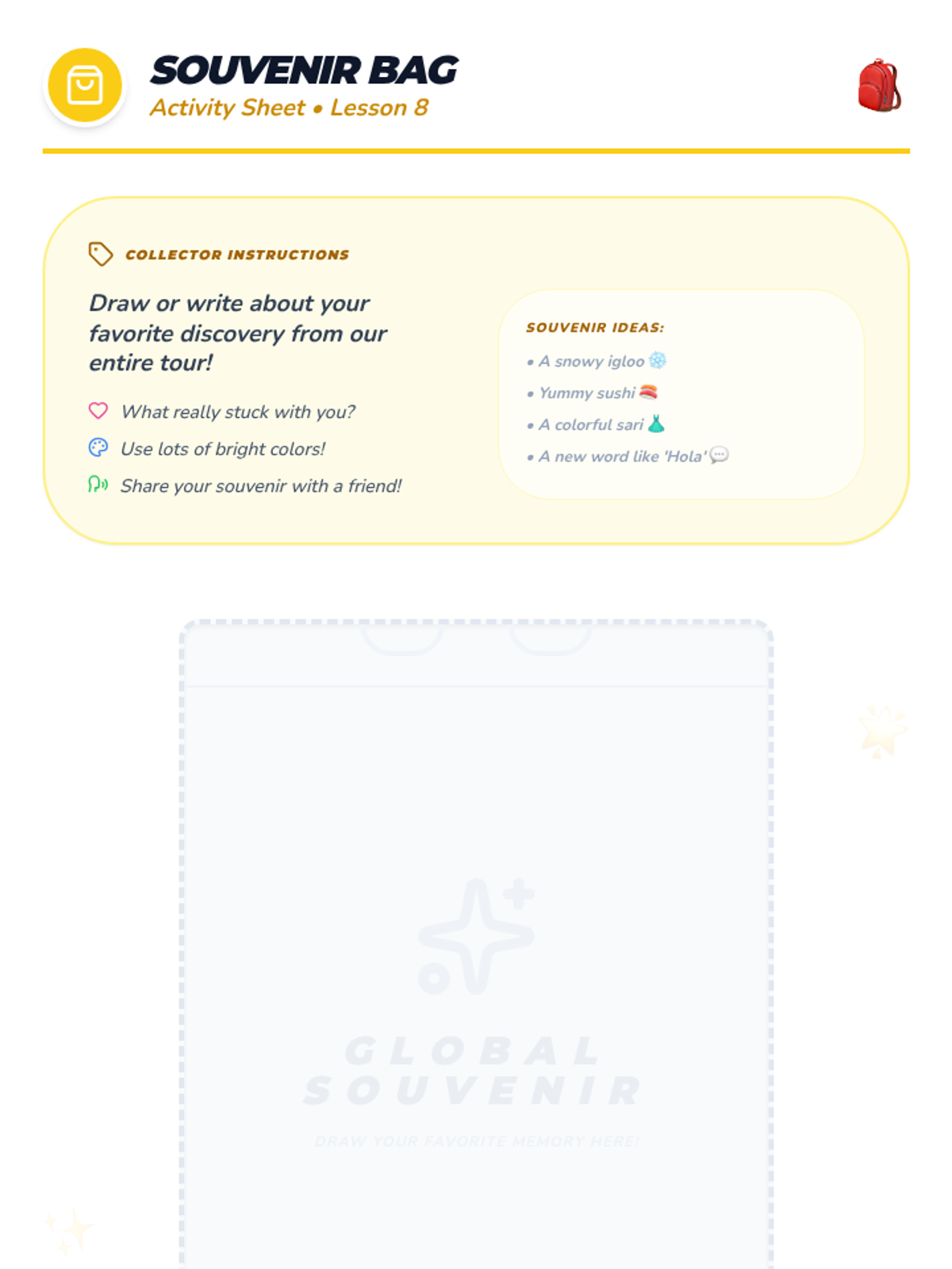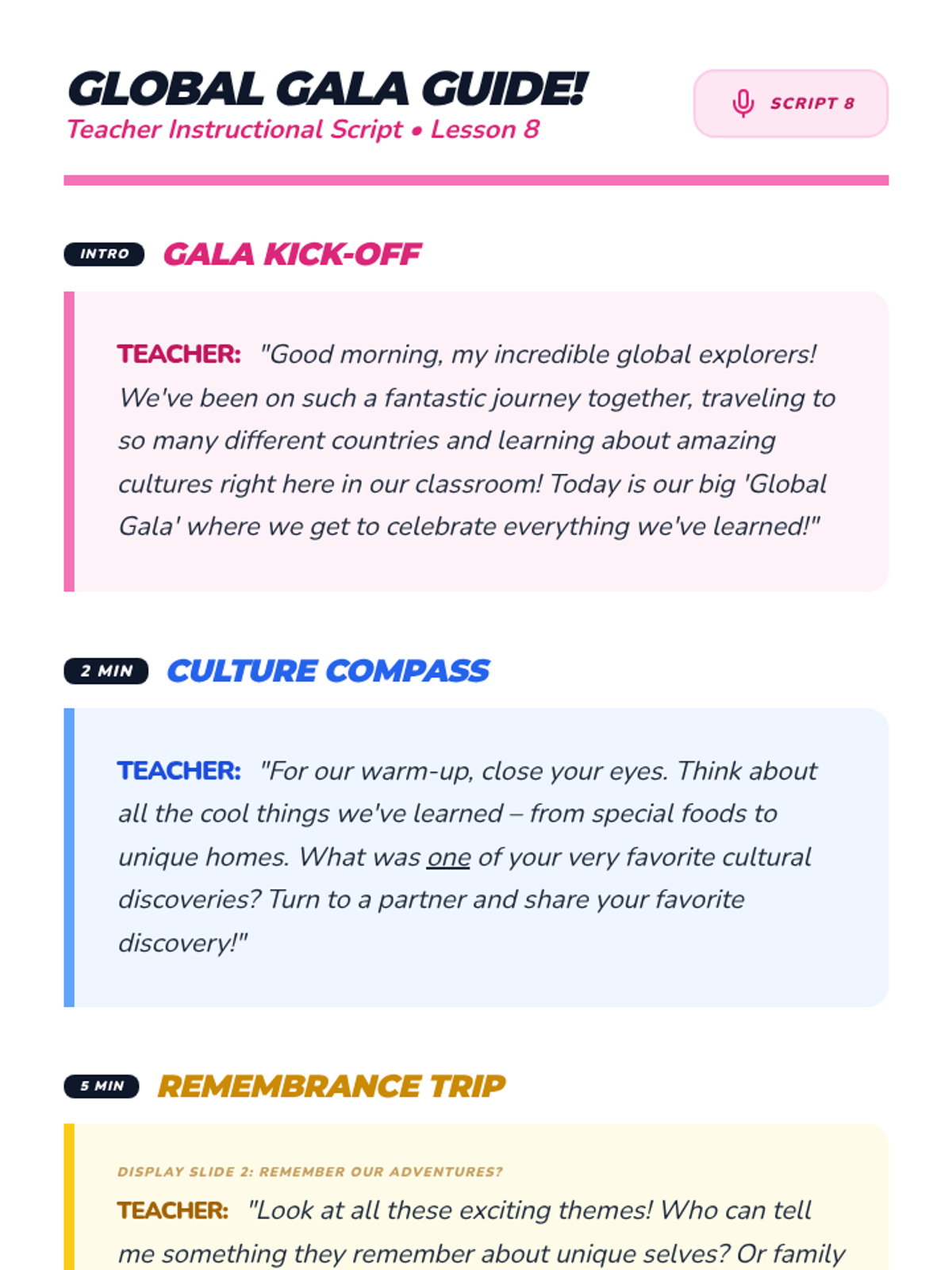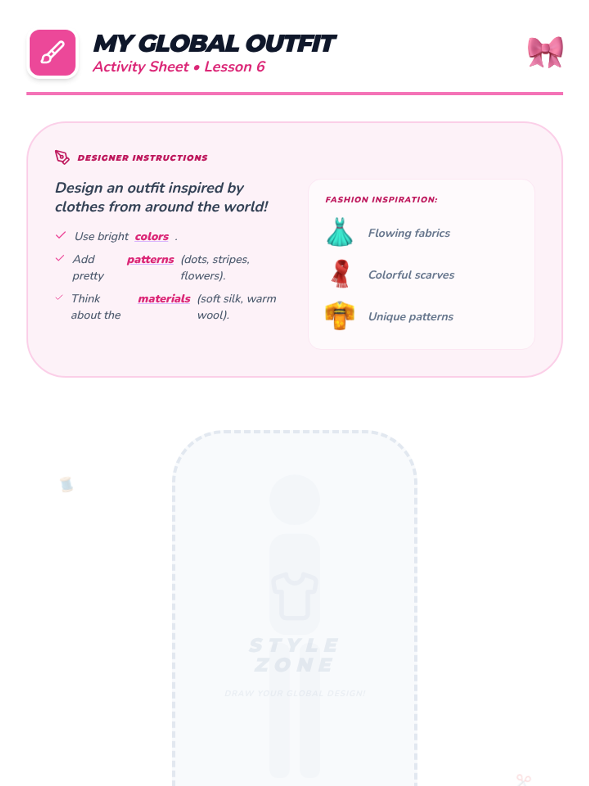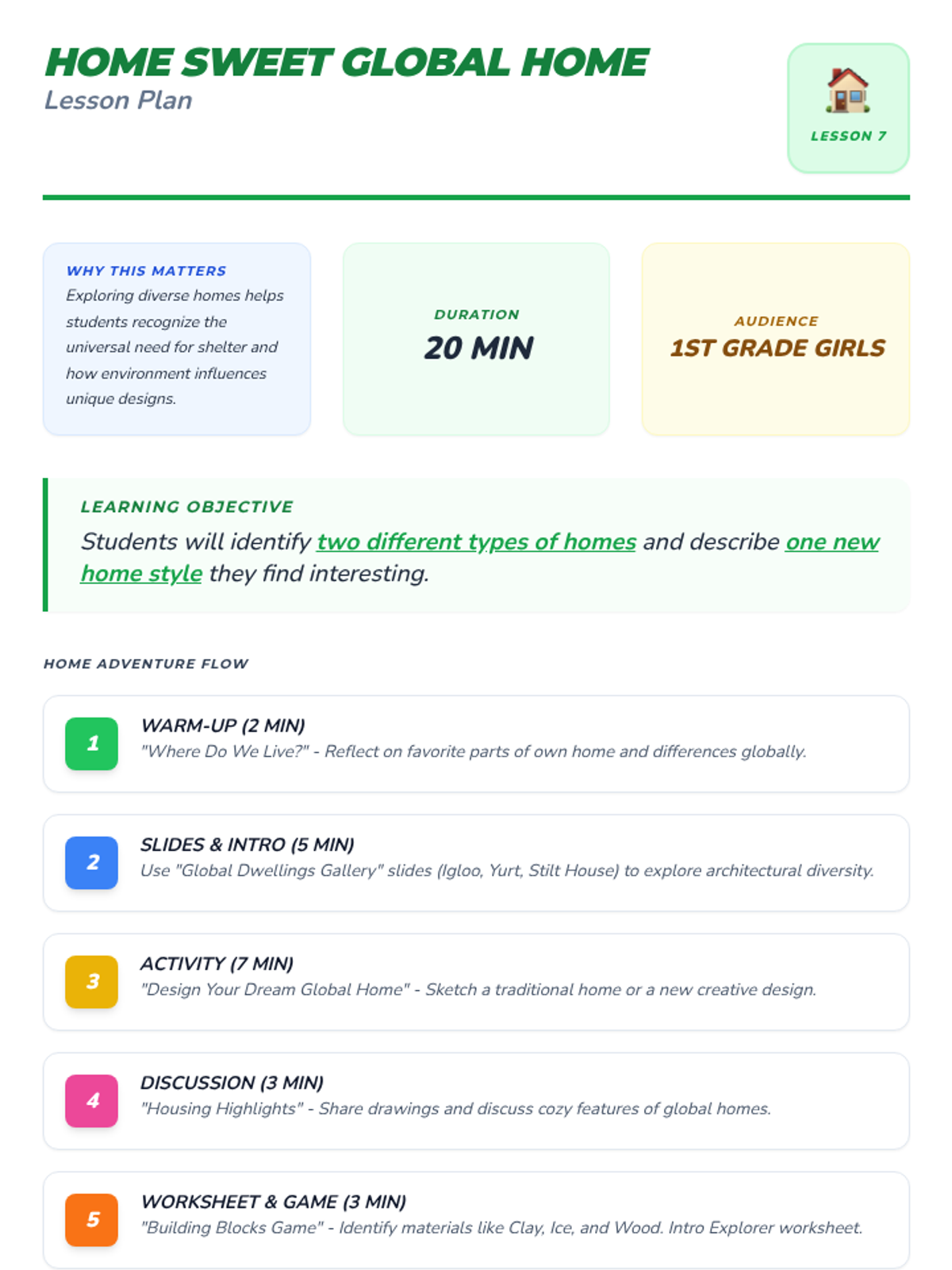 An 8-session cultural exploration sequence for 1st-grade girls, celebrating individual uniqueness, family traditions, and global diversity through food, language, fashion, and homes.