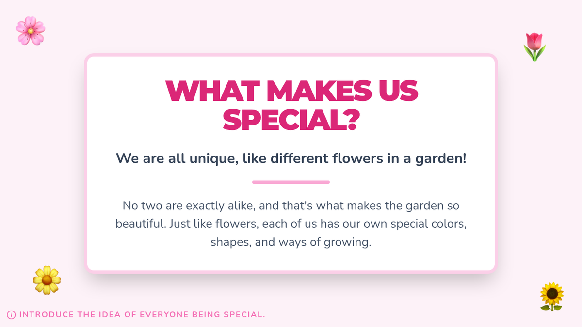 A journey through the diverse ways families and cultures shape our identities. Students explore family structures, traditions, roles, and cultural heritage to build a sense of belonging and respect for diversity.