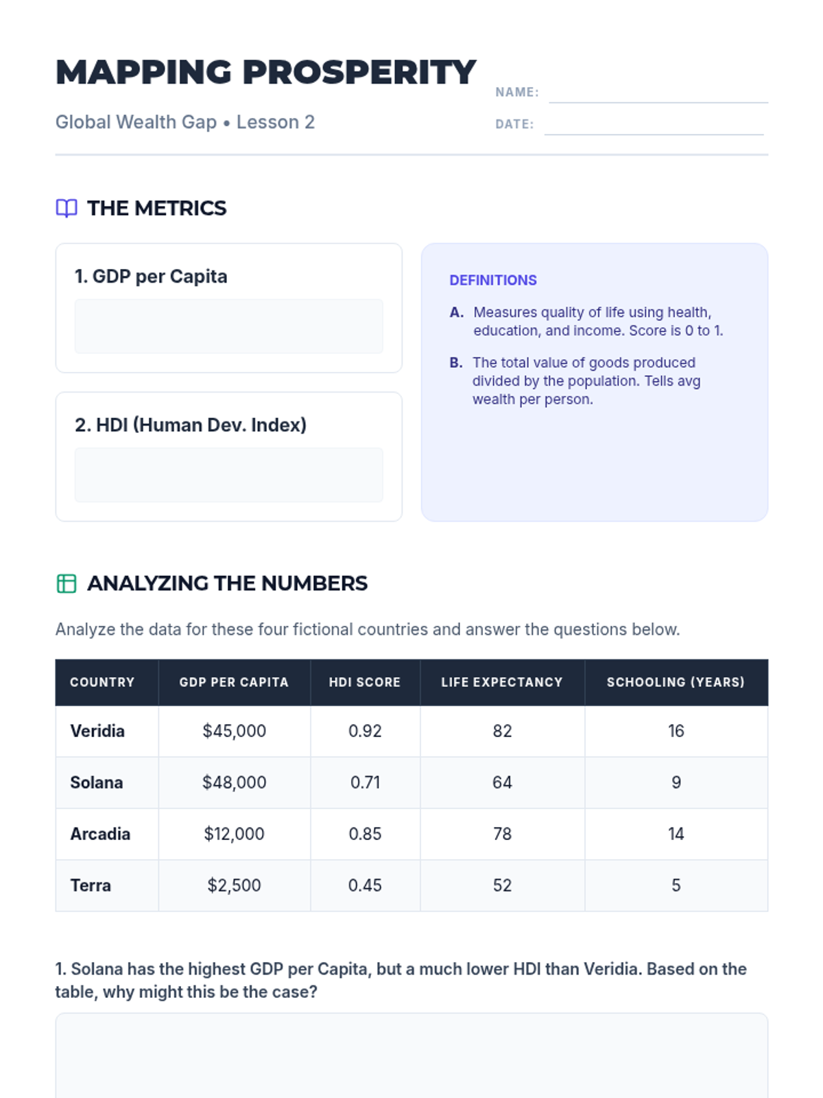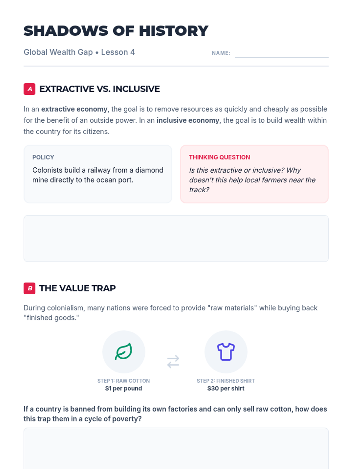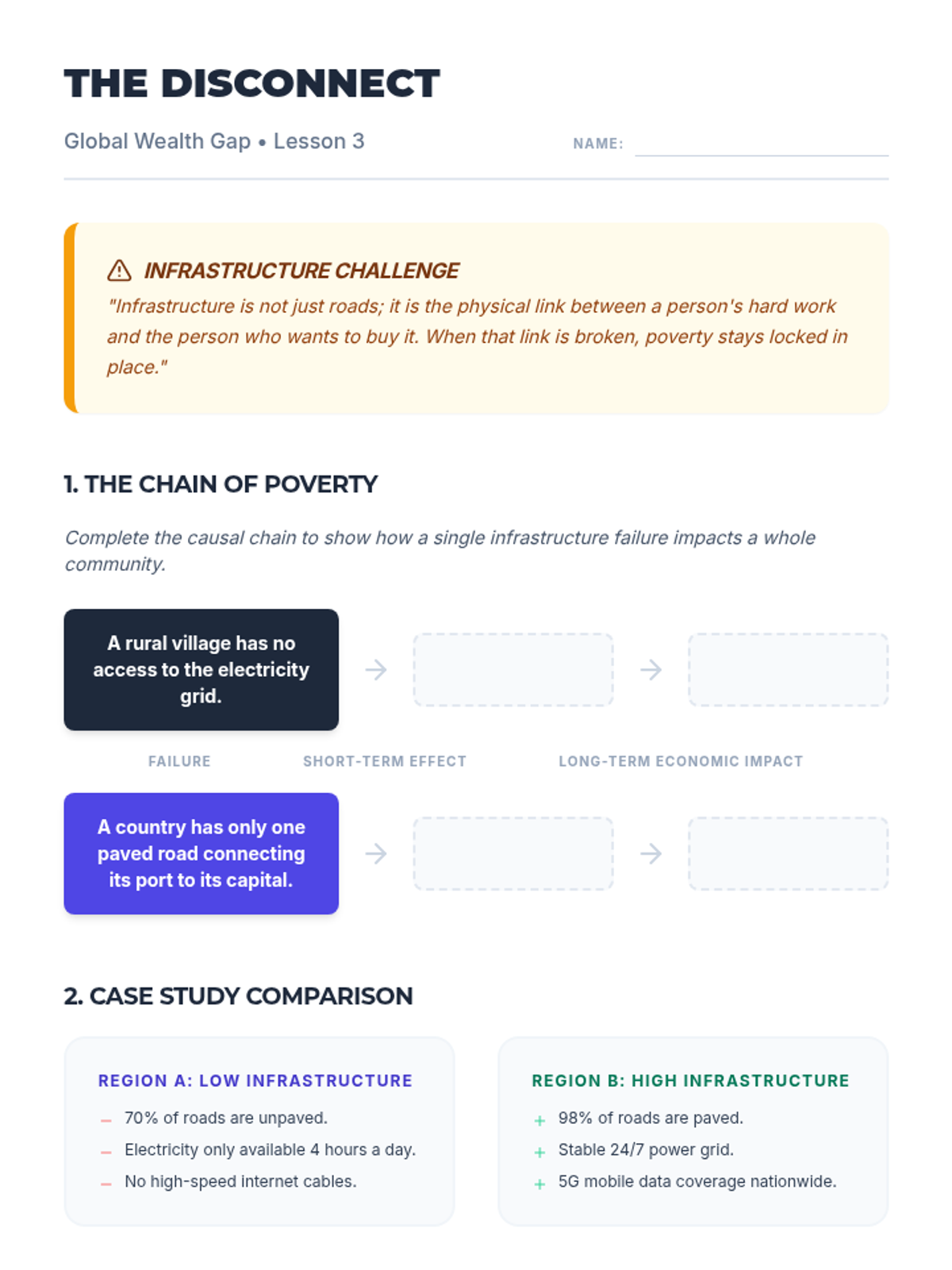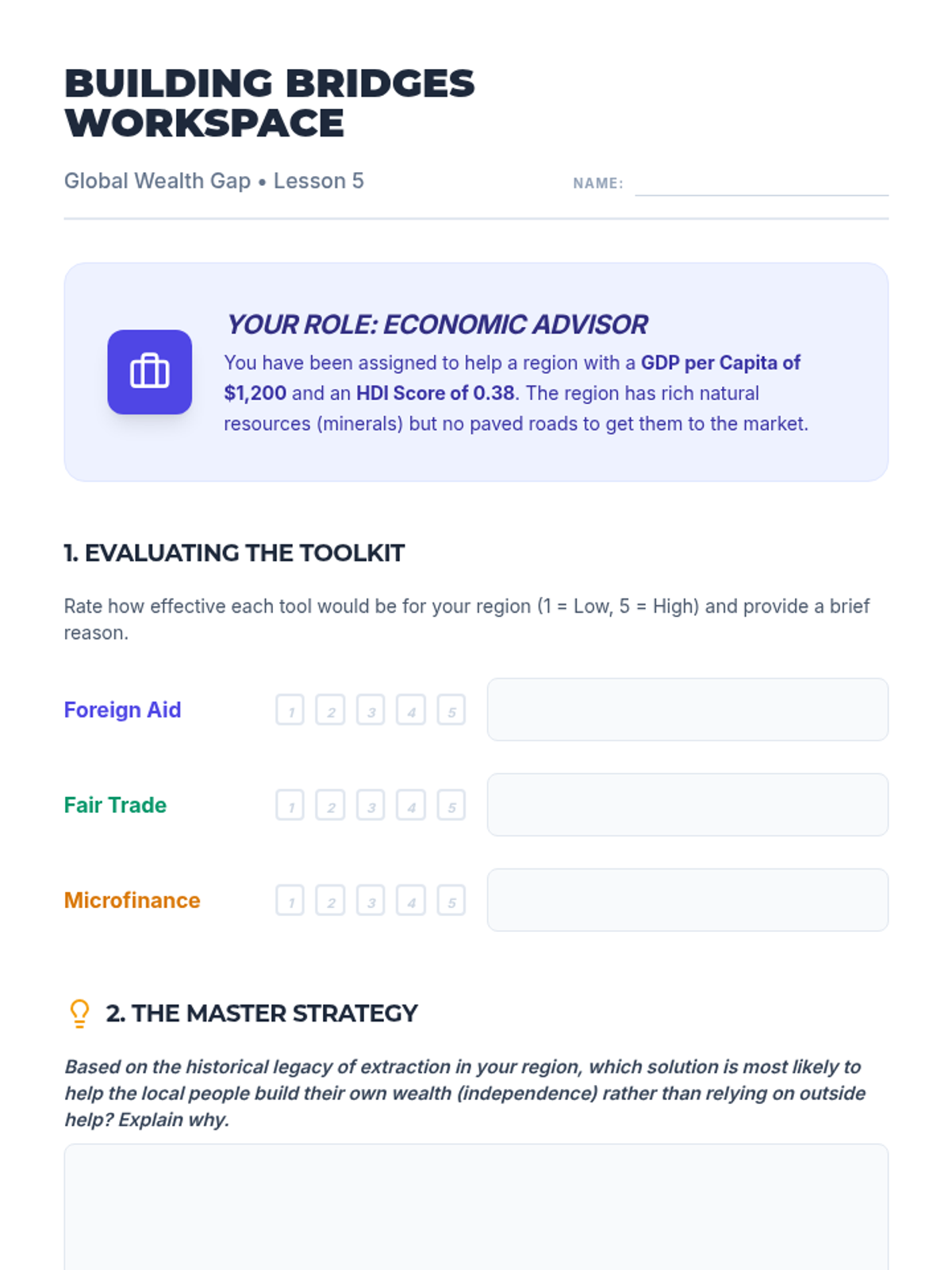 This sequence explores the multifaceted nature of global economic inequality through simulations, data analysis of GDP and HDI, investigation of infrastructure's role, historical analysis of colonial legacies, and evaluation of modern economic solutions. Students move from emotional engagement to technical mastery and critical problem-solving.