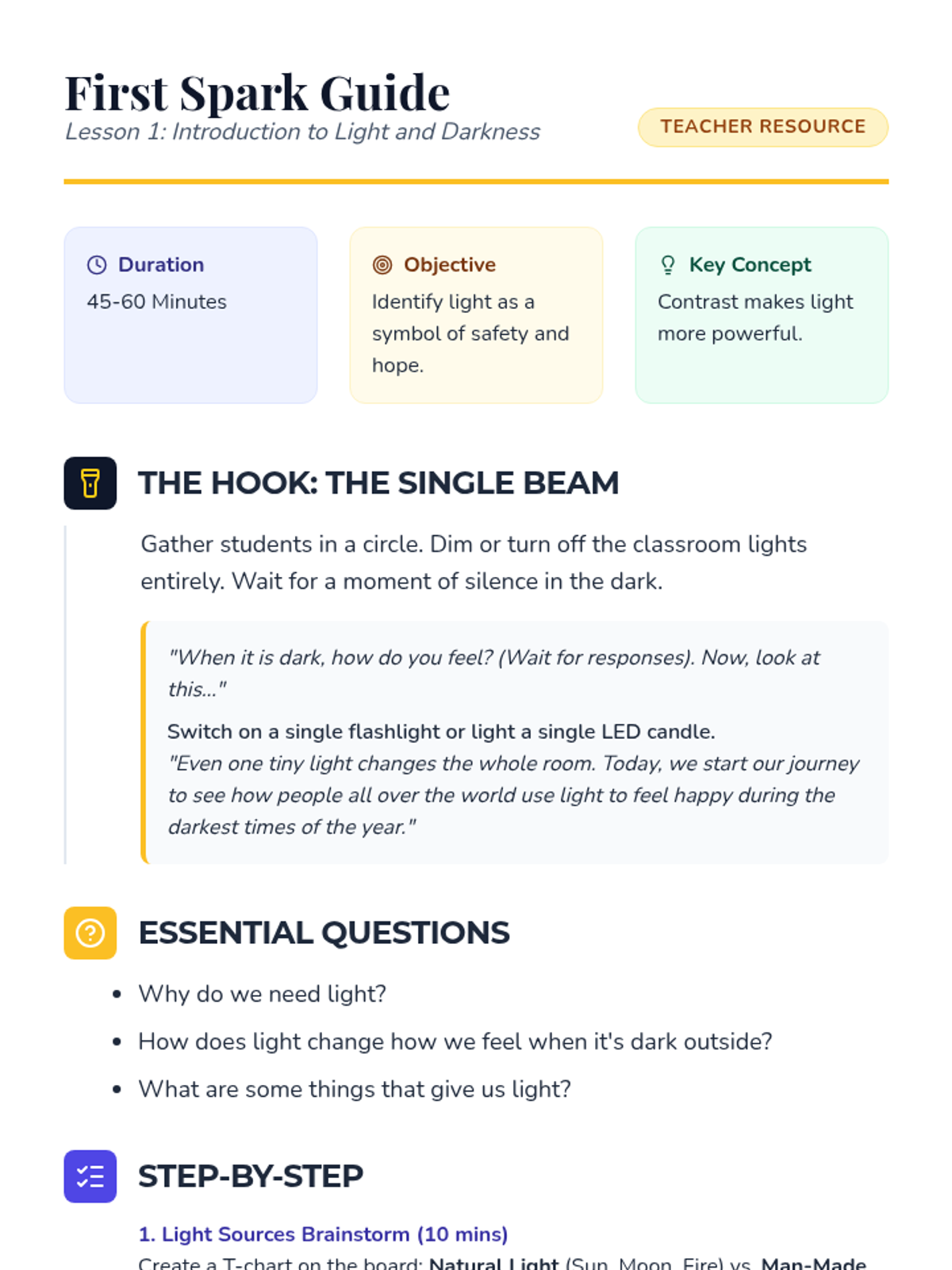 A comparative Social Studies sequence for Kindergarten exploring how diverse cultures use light (candles, lamps, lanterns) to celebrate hope and joy during the winter months. Students investigate Diwali, Hanukkah, Kwanzaa, and other traditions to find common themes of light in history.
