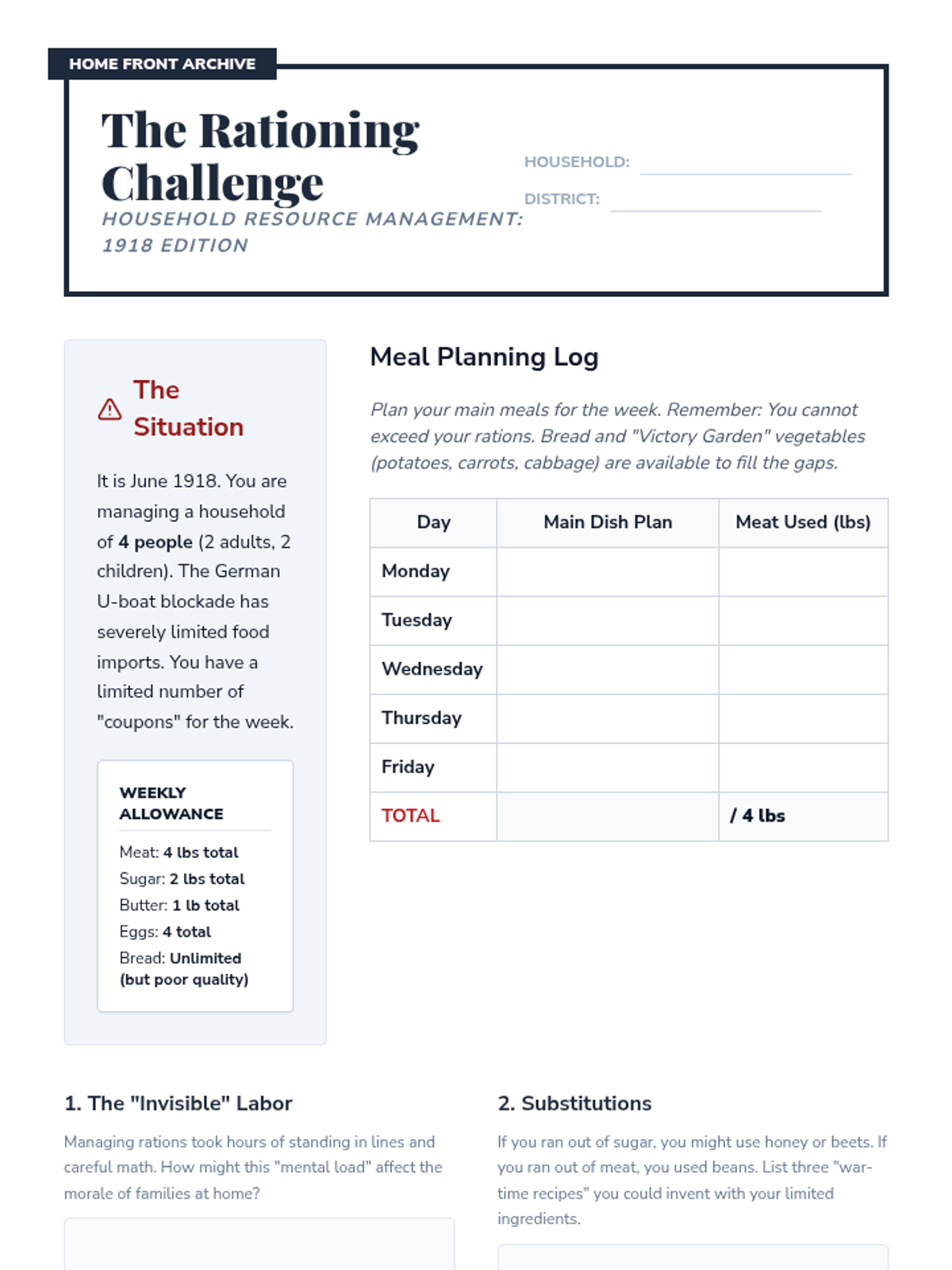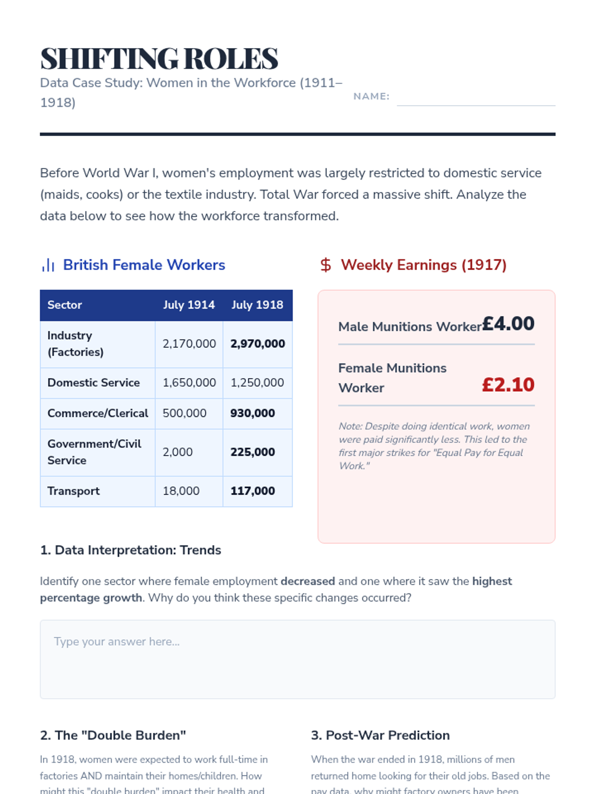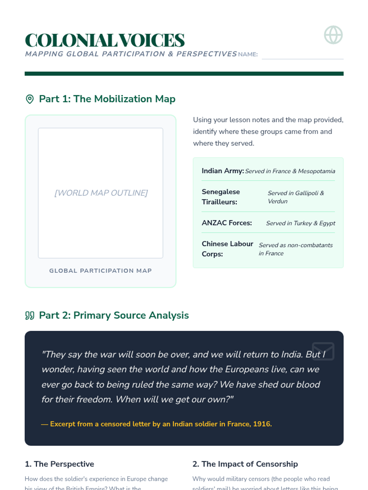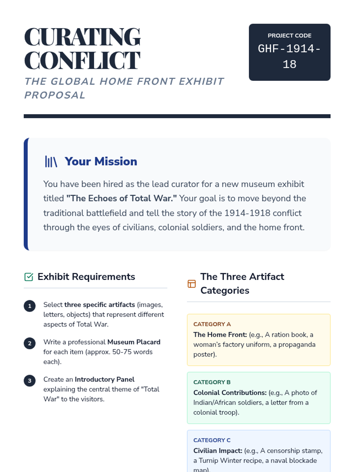 A comprehensive unit for 7th-grade students examining World War I through the lens of 'Total War.' Students explore how governments mobilized entire societies, the role of propaganda, the shifting roles of women, the contributions of colonial troops, and the impact of the war on civilian rights and daily life.