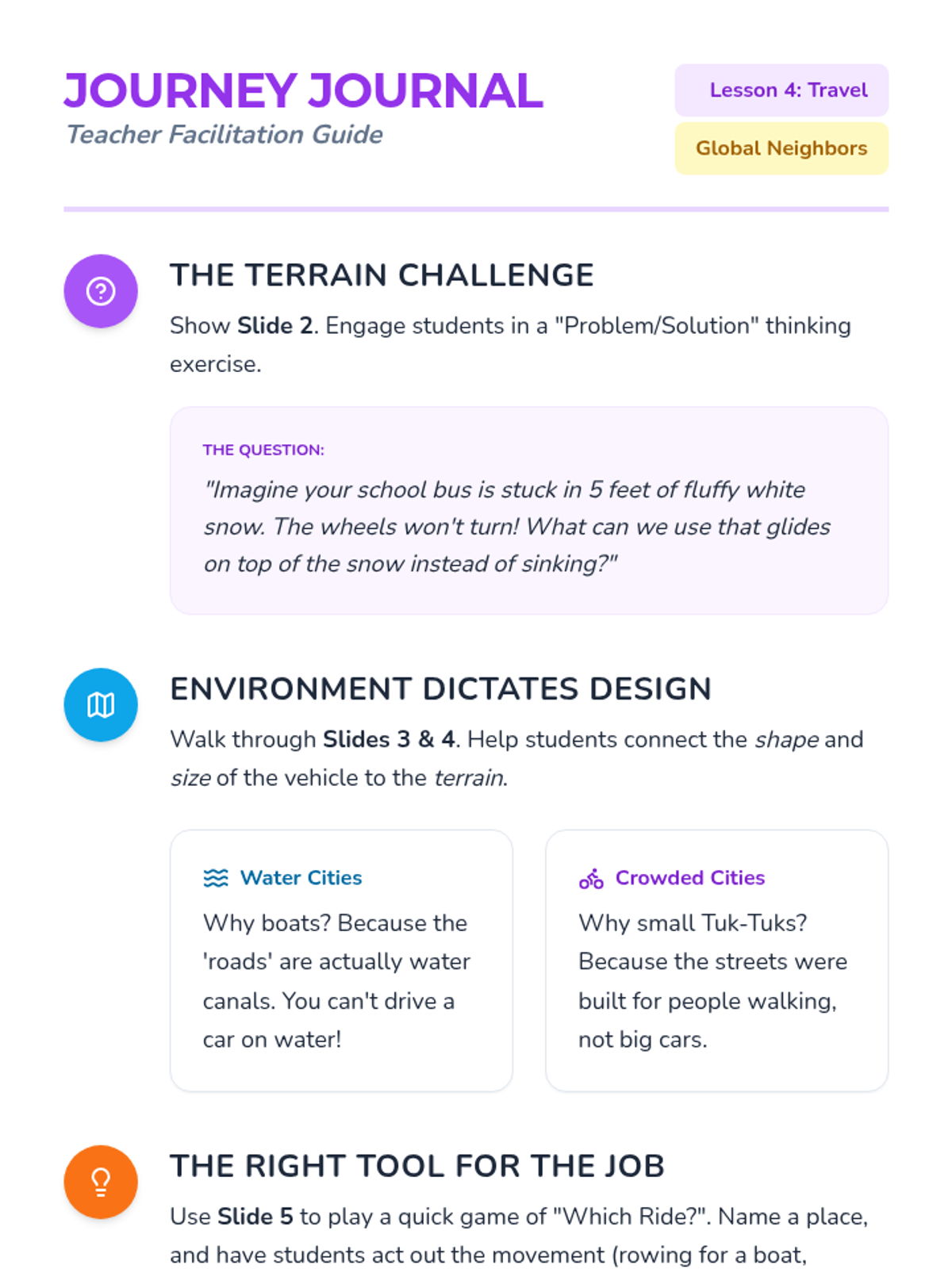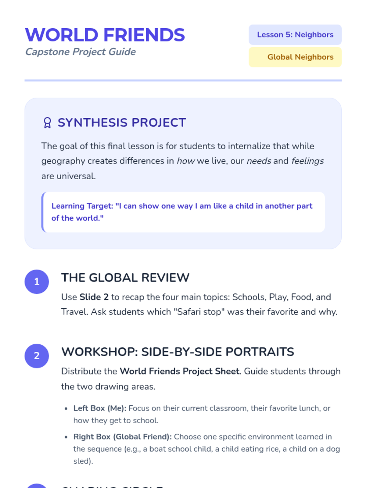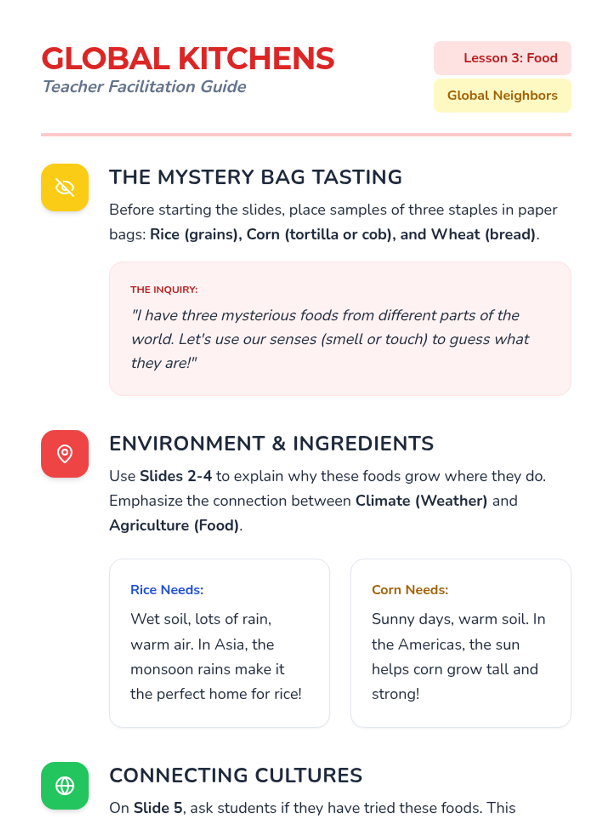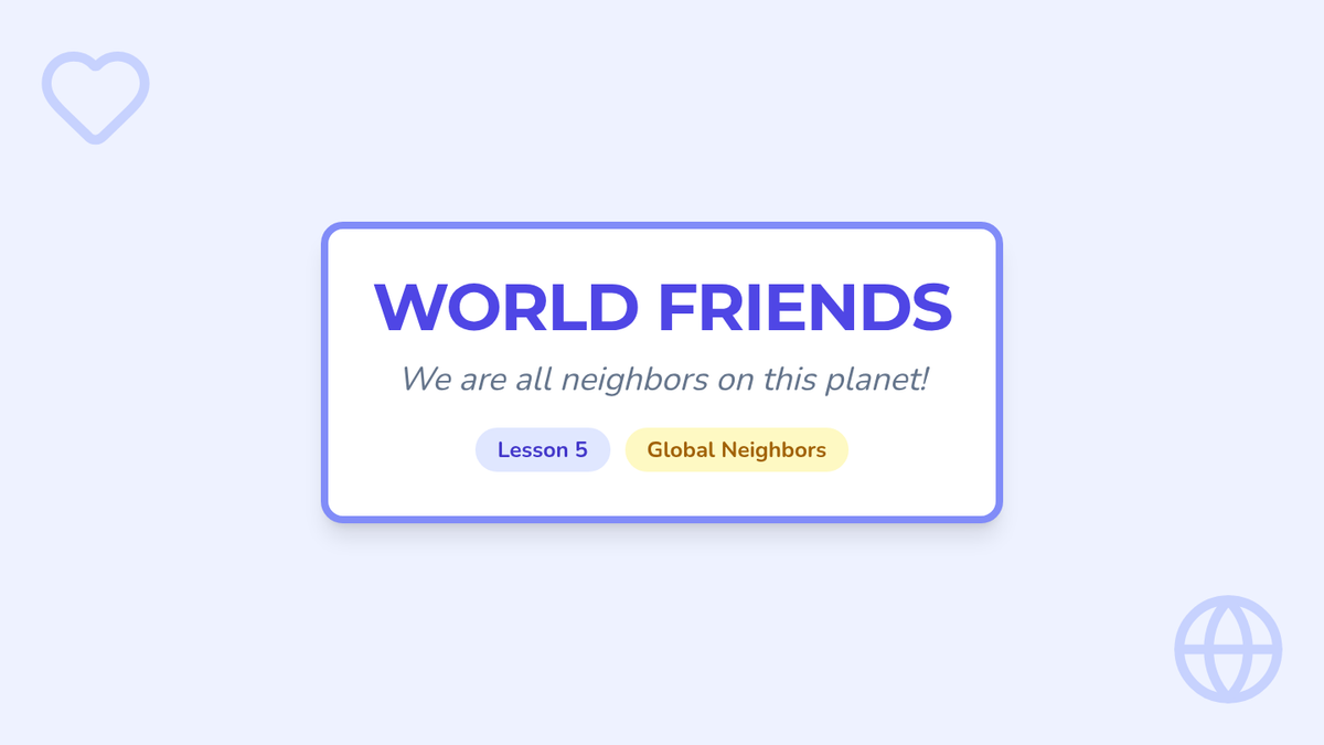 A Kindergarten sequence exploring the daily lives of children around the world. Students compare schools, games, food, and transportation to understand how geography shapes culture while celebrating universal human needs.