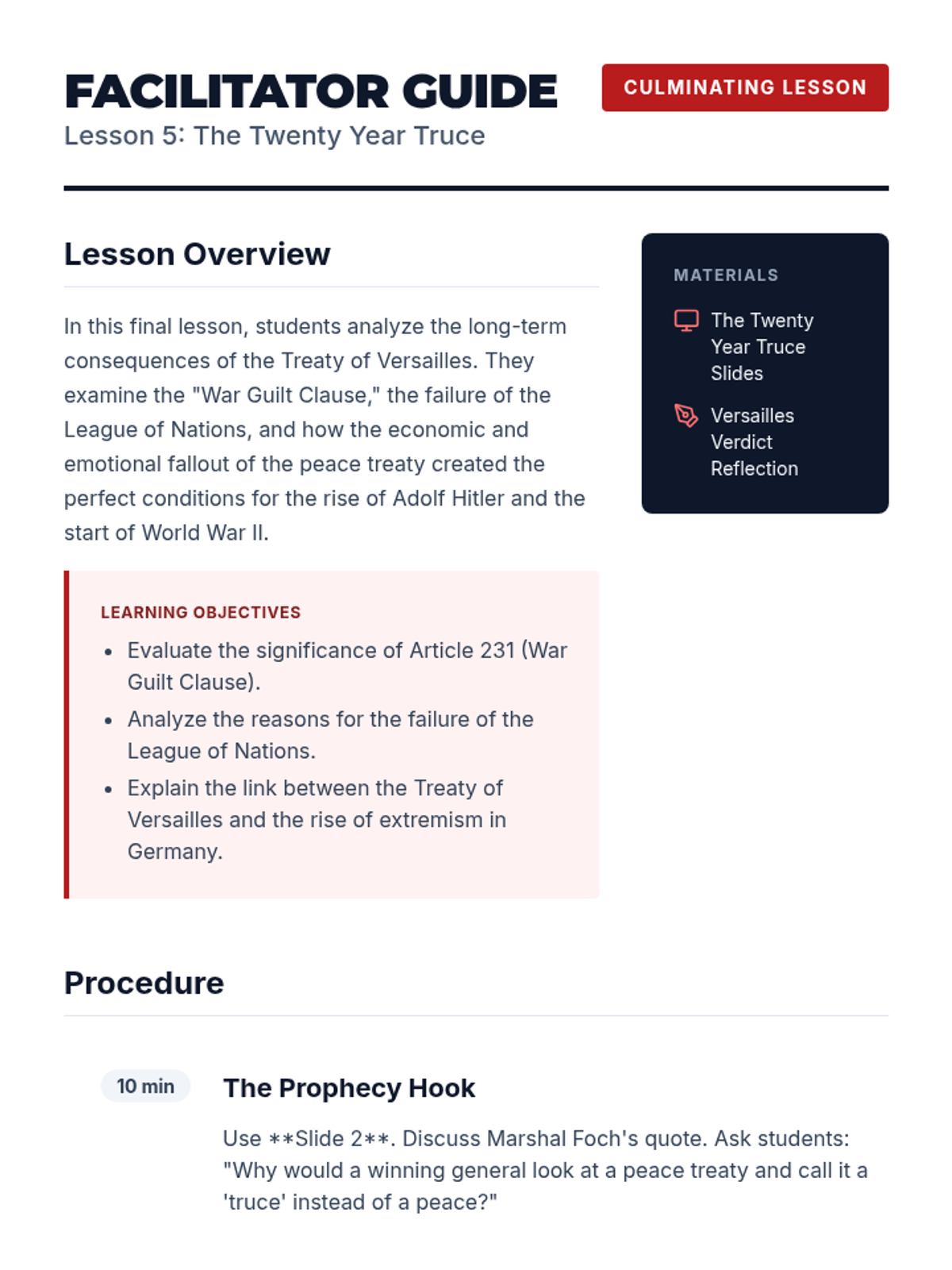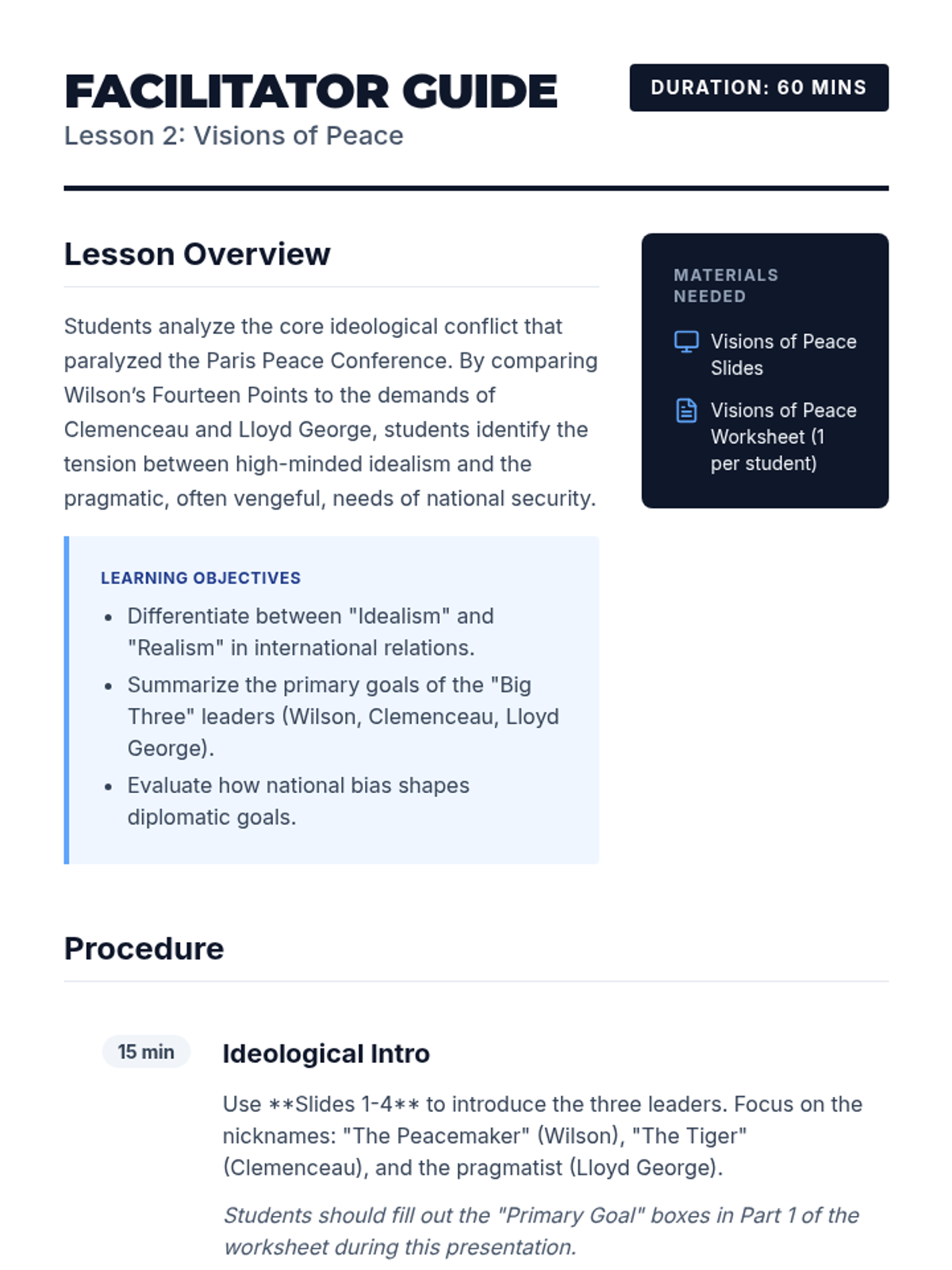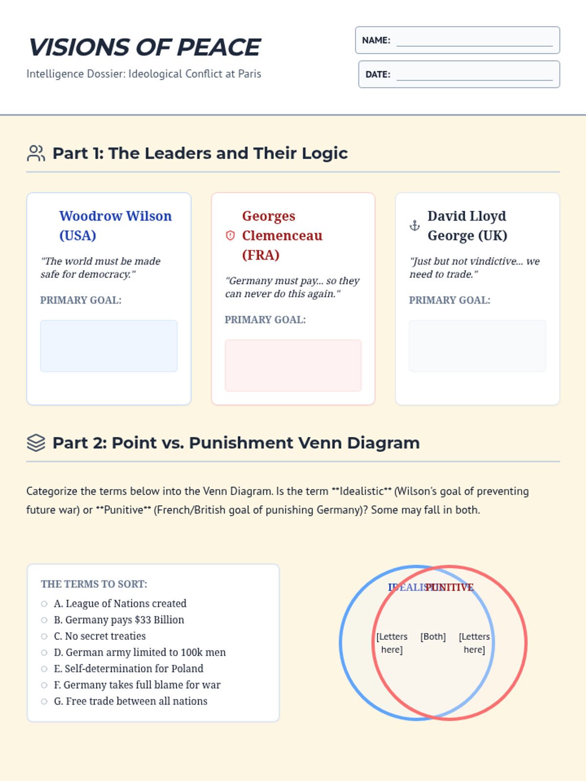 This sequence explores the end of WWI, the diplomatic tensions of the Paris Peace Conference, and the global restructuring that followed, focusing on whether the Treaty of Versailles successfully balanced peace and punishment.
