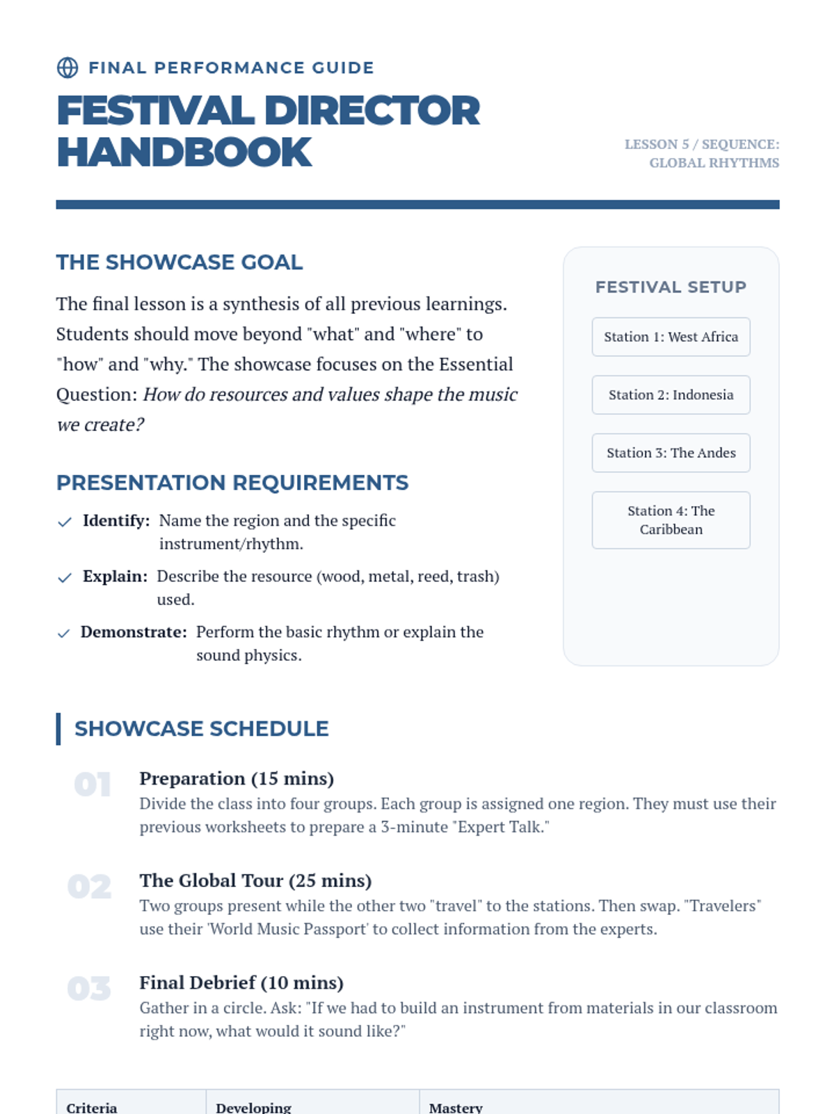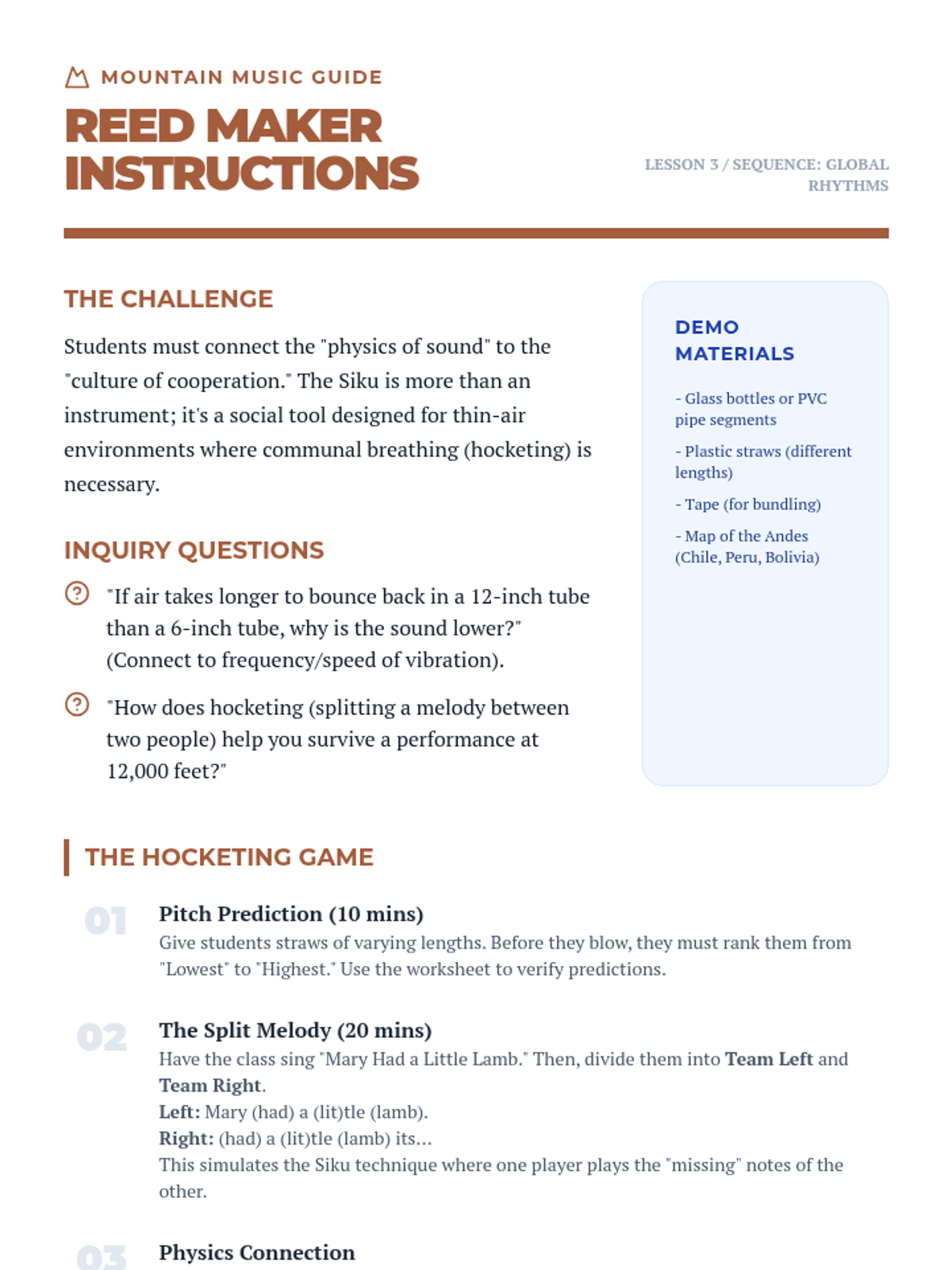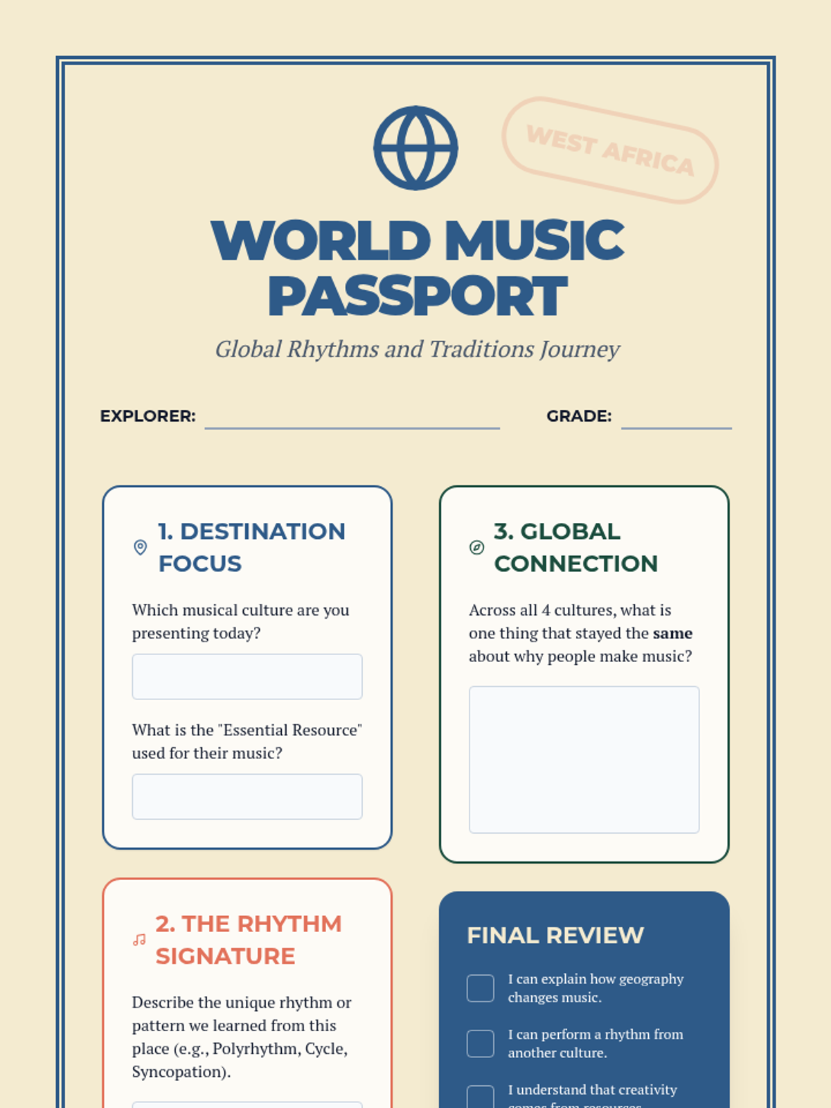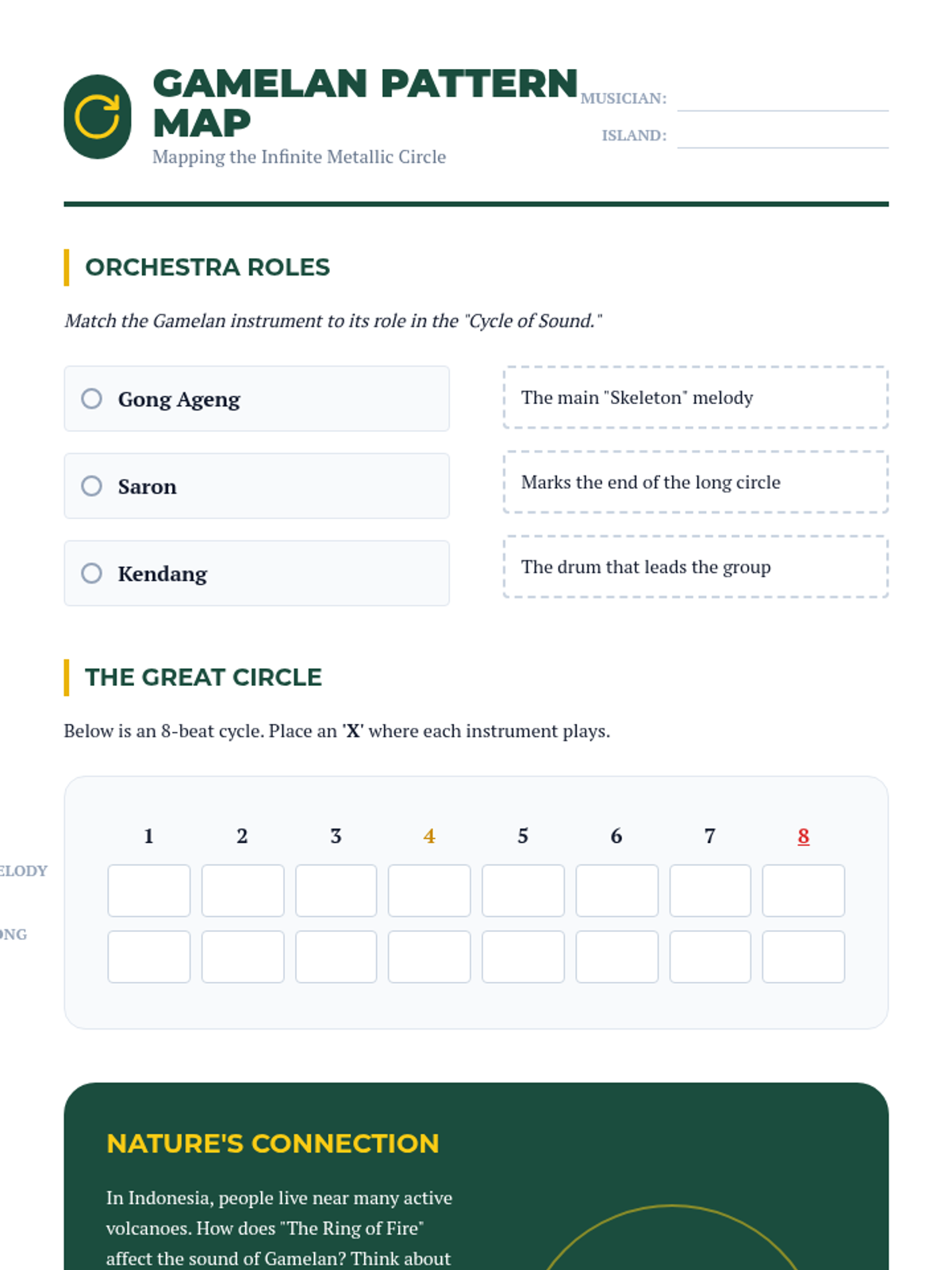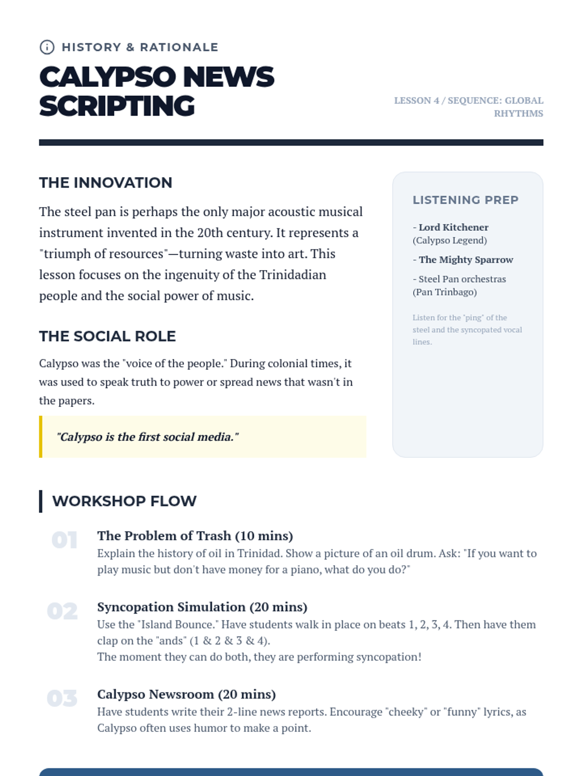 A 4th-grade music appreciation sequence exploring the connection between geography, natural resources, and musical traditions across West Africa, Indonesia, the Andes, and the Caribbean. Students develop rhythmic skills and cultural understanding through active workshops and comparative analysis.