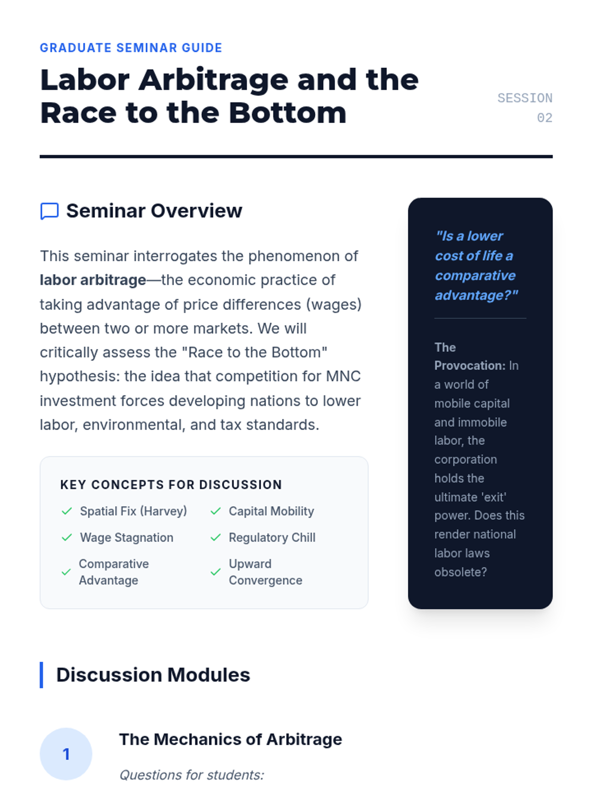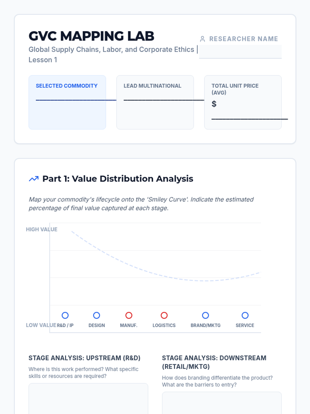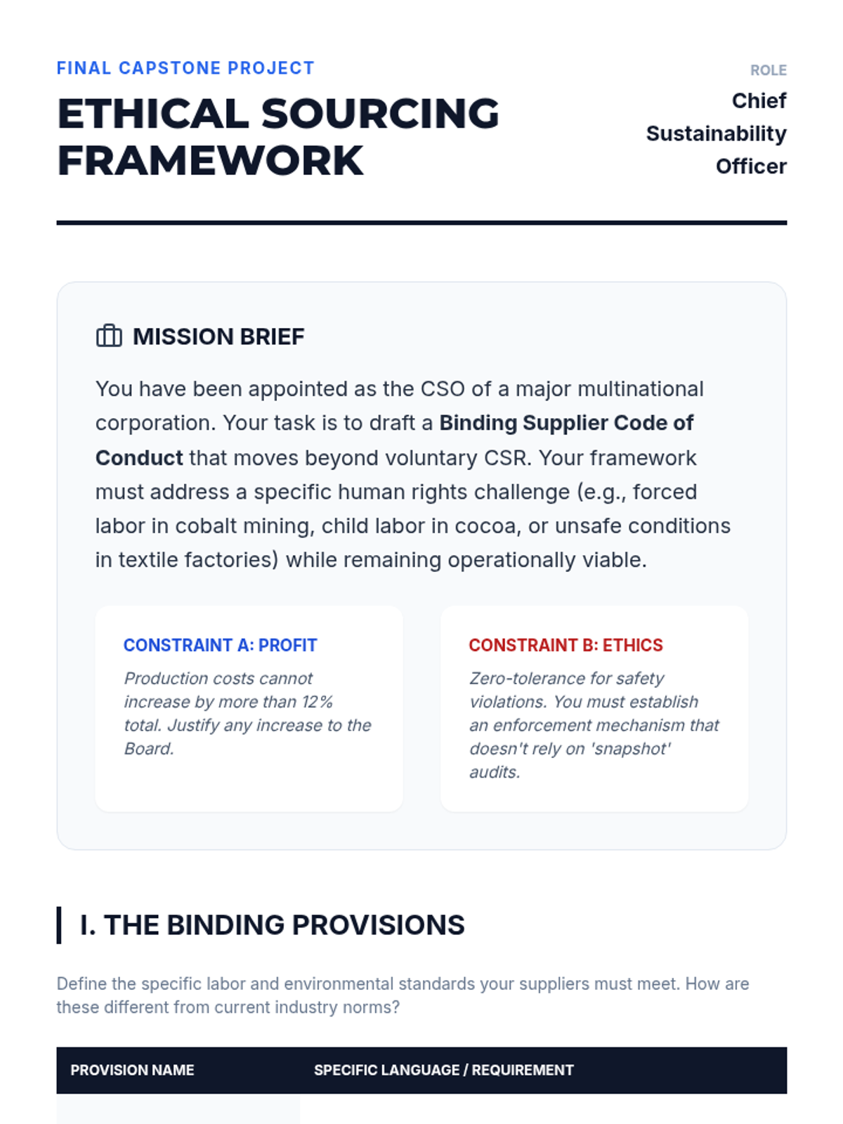 This graduate-level sequence explores the socioeconomic impacts of multinational corporations through global value chains, labor ethics, and legal accountability. Students analyze the tension between economic development and exploitation, culminating in the design of a binding ethical sourcing framework.