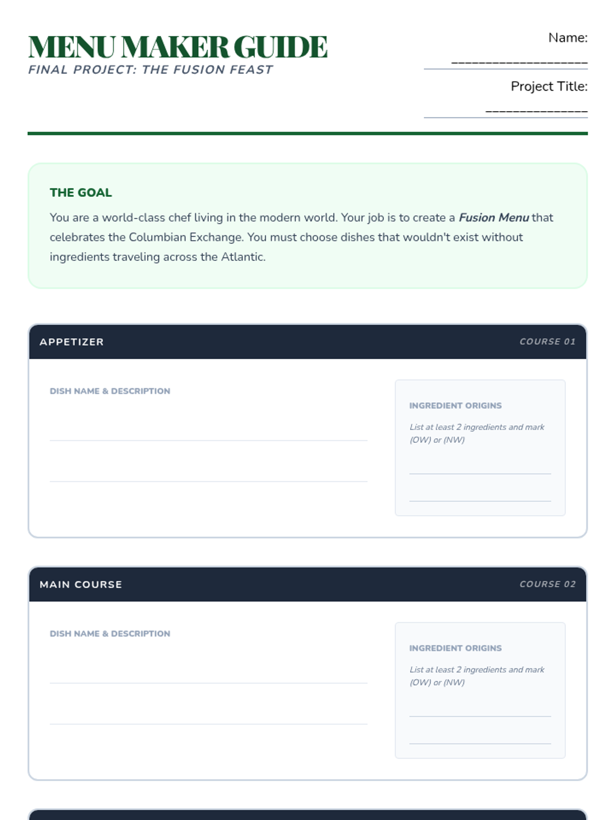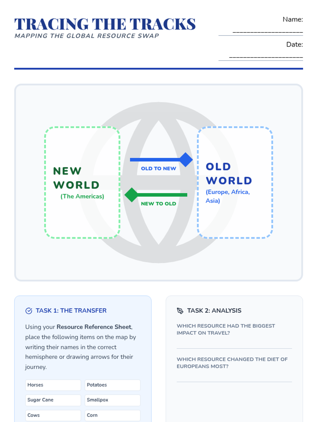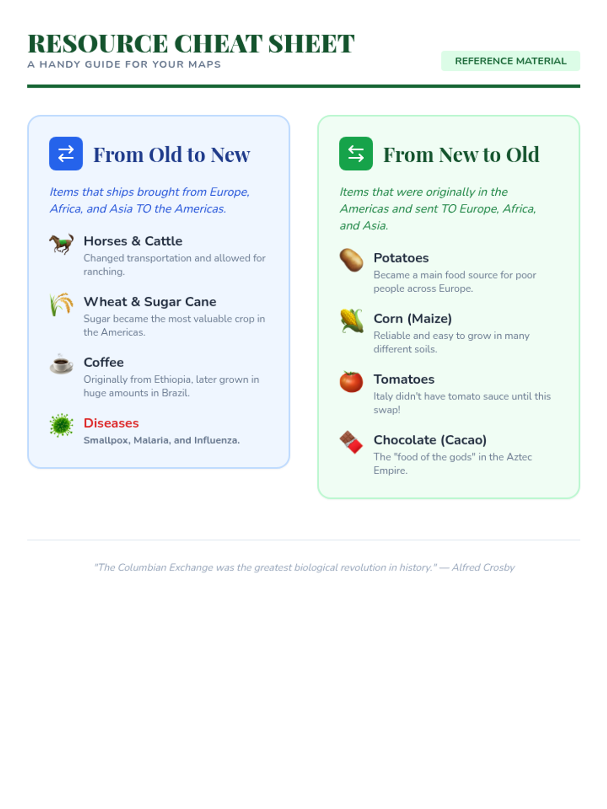 This 5th-grade history sequence explores the Columbian Exchange, focusing on the biological and economic transfers between the Eastern and Western Hemispheres. Students will analyze how the movement of plants, animals, and diseases reshaped global diets, economies, and demographics, culminating in a creative fusion menu project.