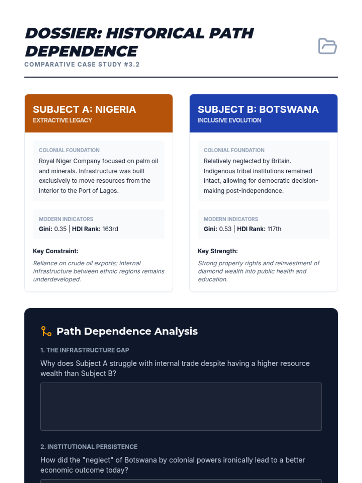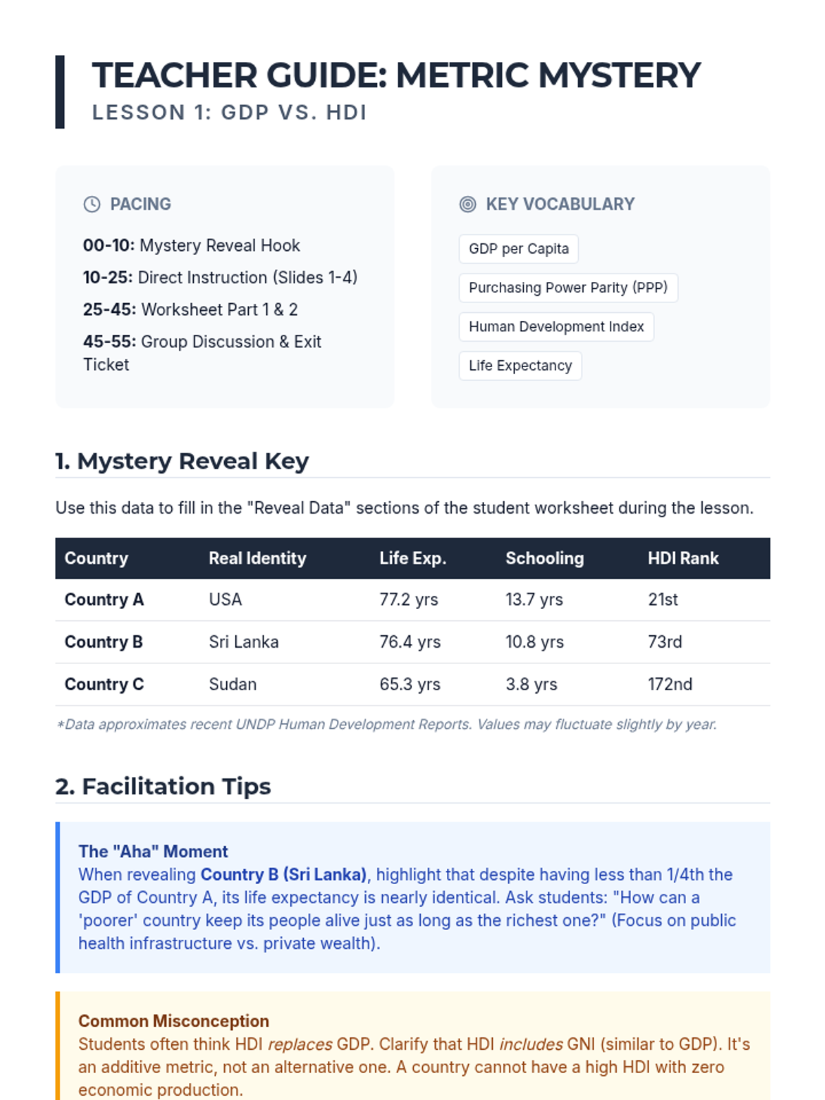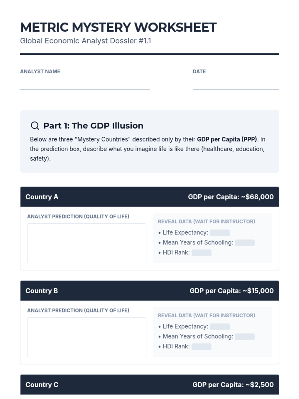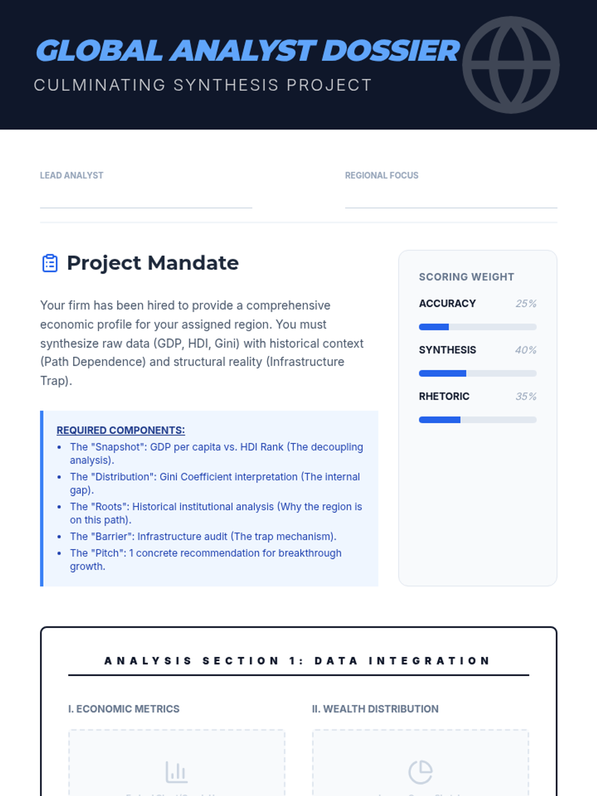 A comprehensive 12th-grade economics unit investigating how global inequality is measured, the historical roots of wealth disparity, and the structural barriers that maintain the poverty trap. Students progress from basic data interpretation (GDP/HDI) to complex synthesis of regional economic profiles.