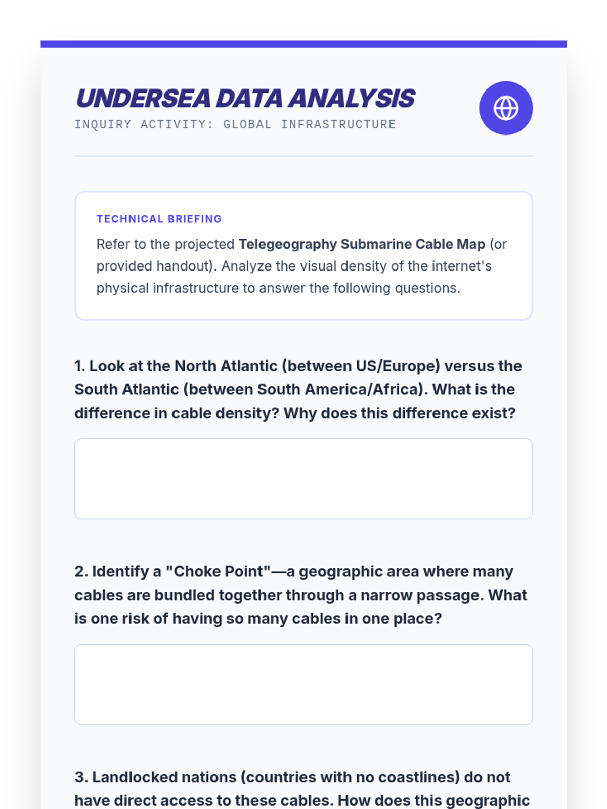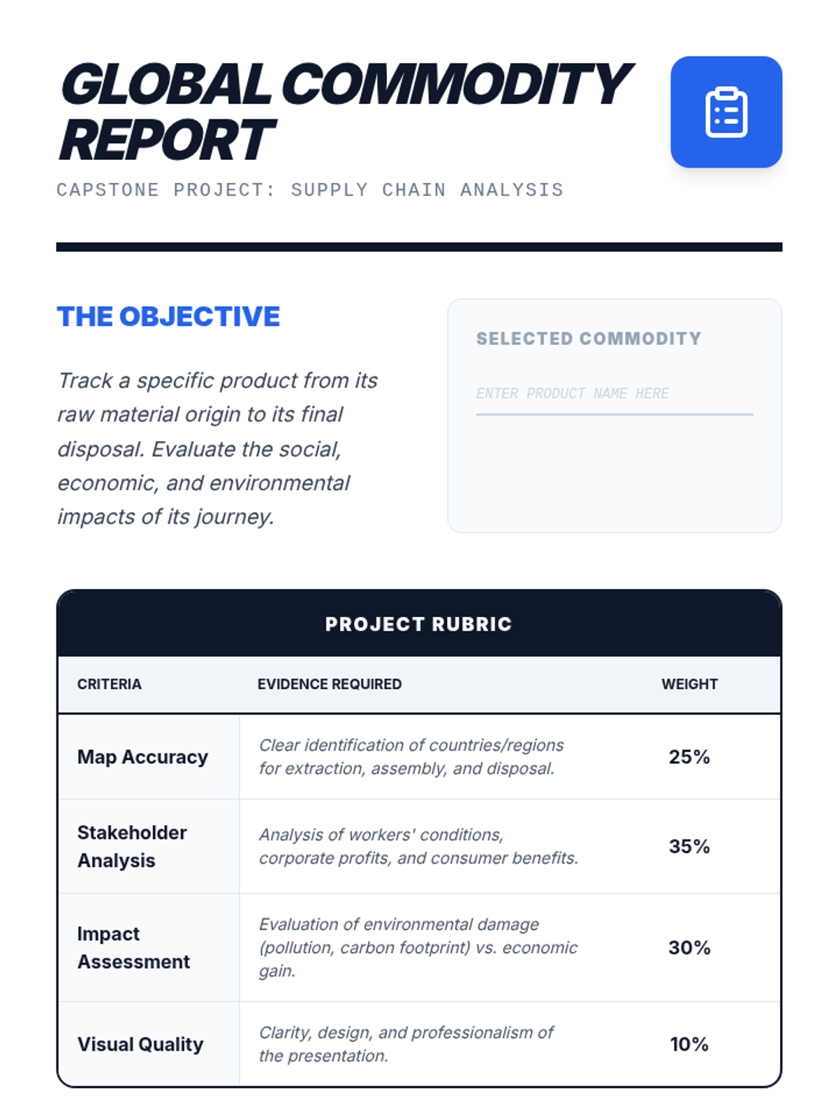 This project-based sequence analyzes the interconnected nature of the modern world through the lens of globalization. Students evaluate whether globalization is a force for opportunity or inequality by investigating economic interdependence, multinational corporations, cultural diffusion, and the digital revolution, culminating in a product lifecycle research project.