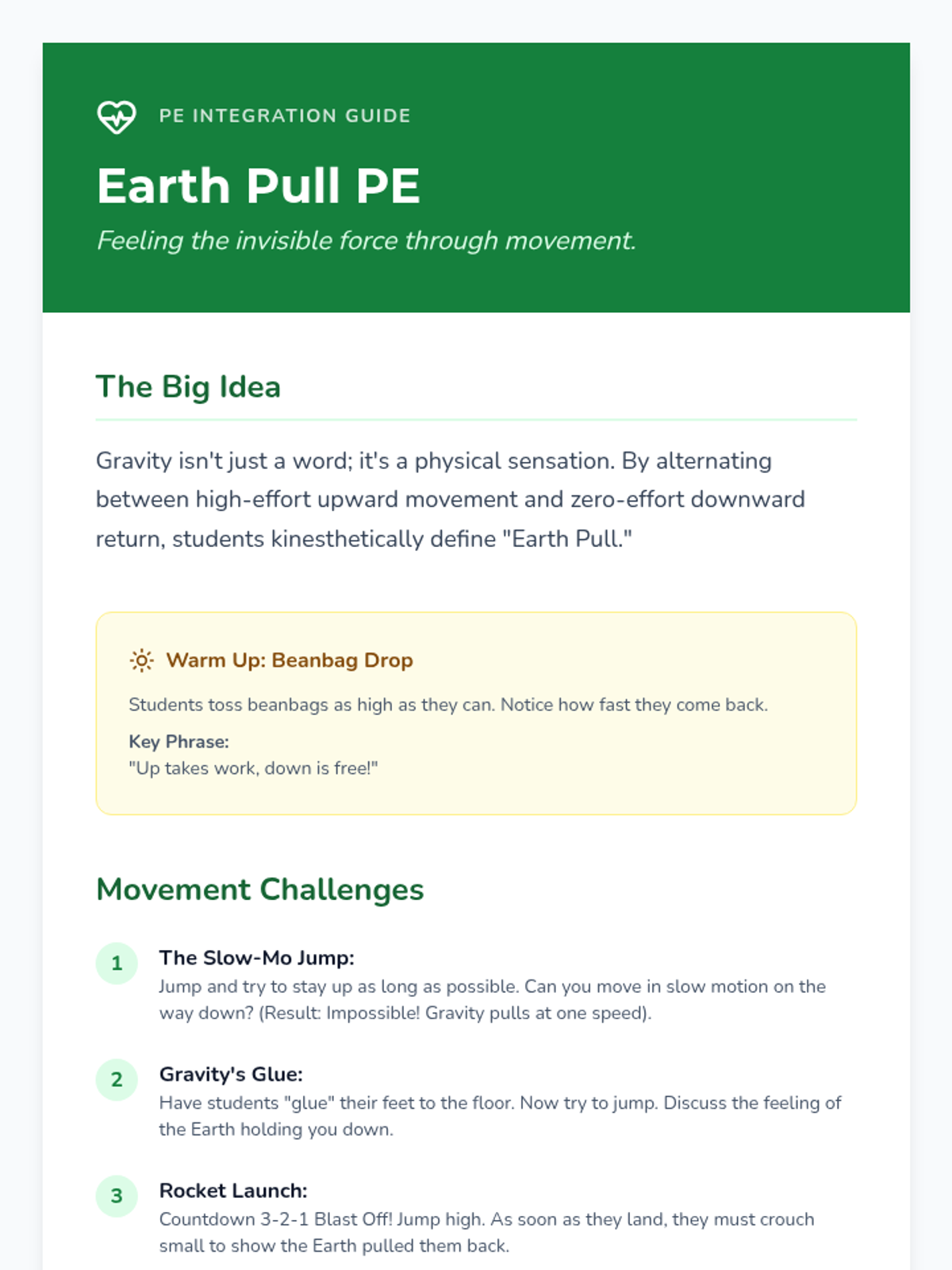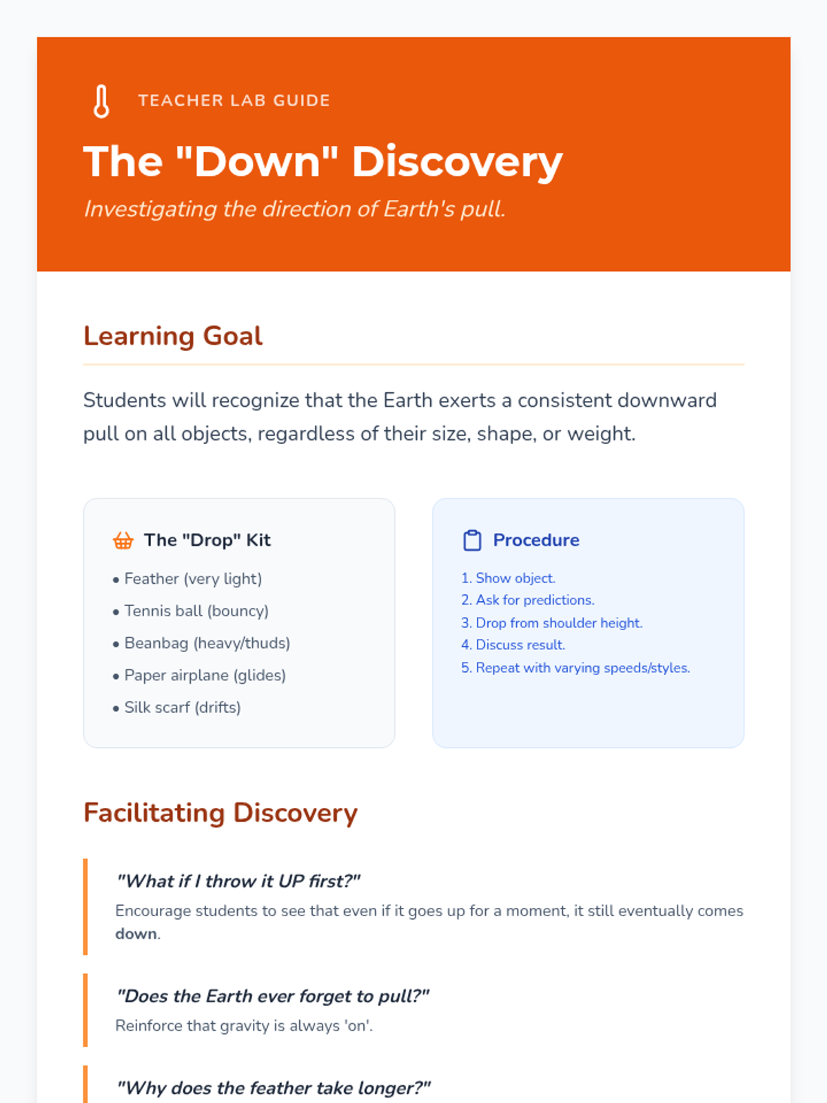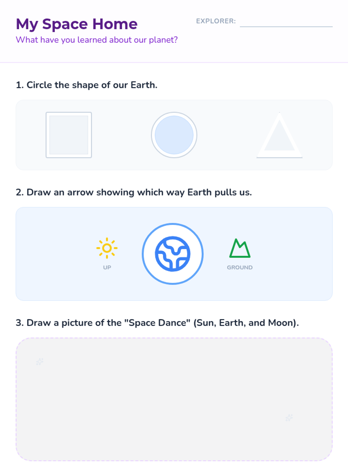 A Kindergarten sequence exploring Earth's spherical shape and the basic concept of gravity ('earth pull'). Students use models, physical play, and artistic representation to understand our planet's place in space.