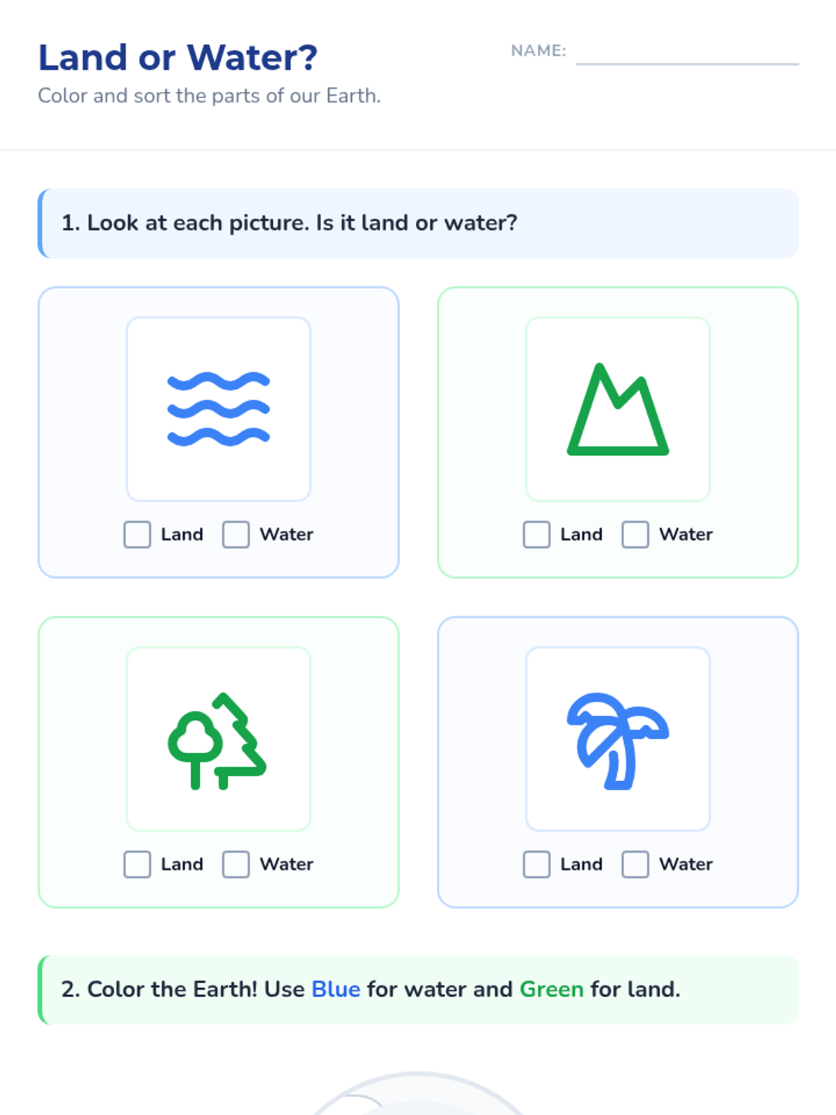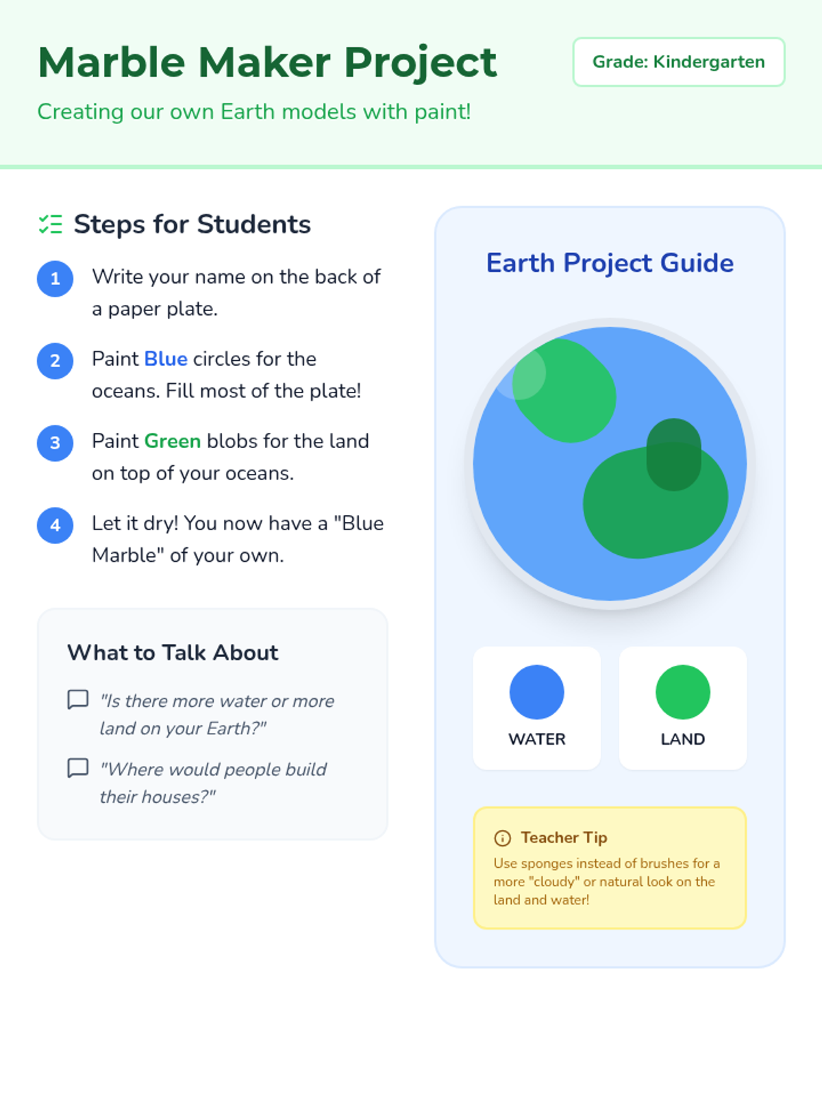 A Kindergarten and 1st Grade science unit exploring our neighbor planet, Mars. Students compare Earth and Mars using visual aids, a hands-on sorting activity, and creative drawing to understand planetary similarities and differences.