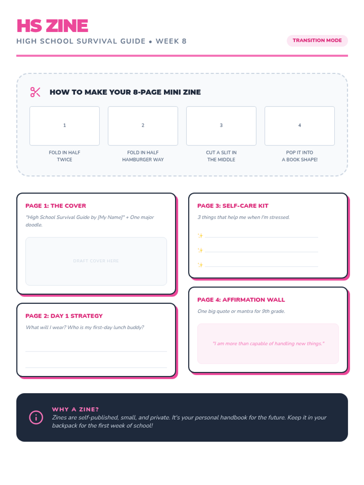 A 10-week empowerment and transition program for 8th-grade girls, focusing on self-esteem, identity, social media, and communication through art and discussion.