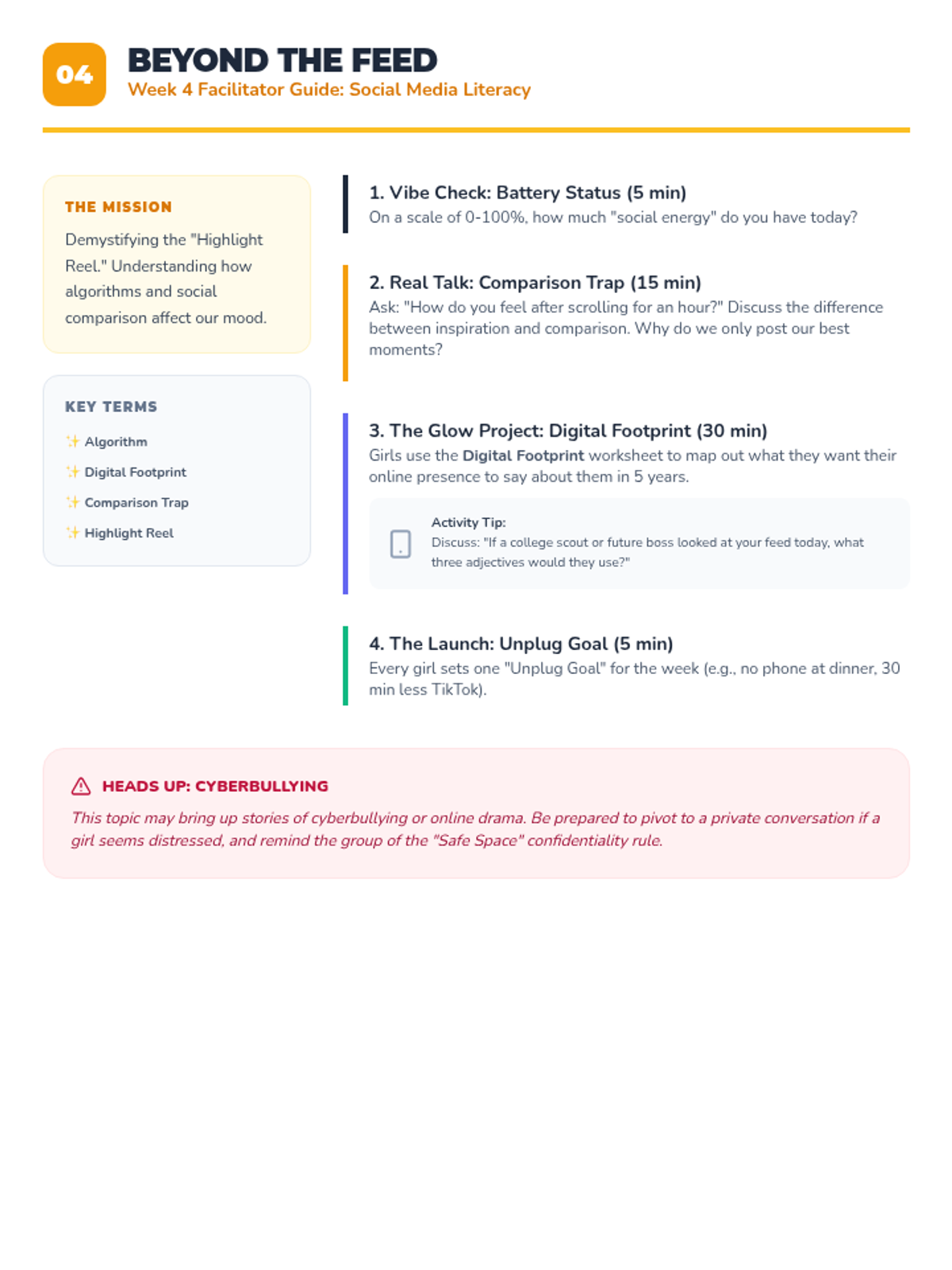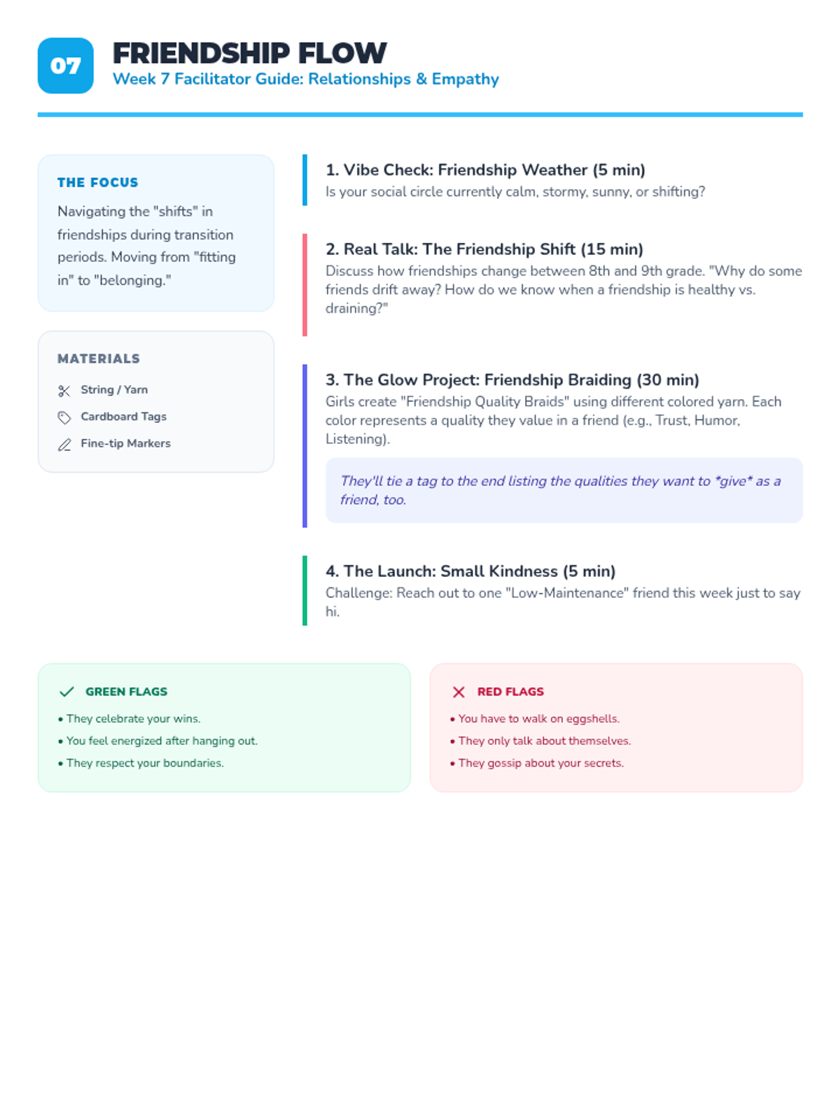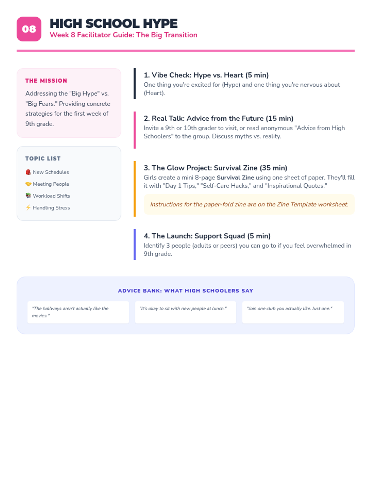 A 4-session small group counseling program for high school girls focused on identifying anxiety triggers, practicing mindfulness, and developing a personalized toolkit of coping strategies. The sequence emphasizes peer support, empowerment, and practical application within the school environment.