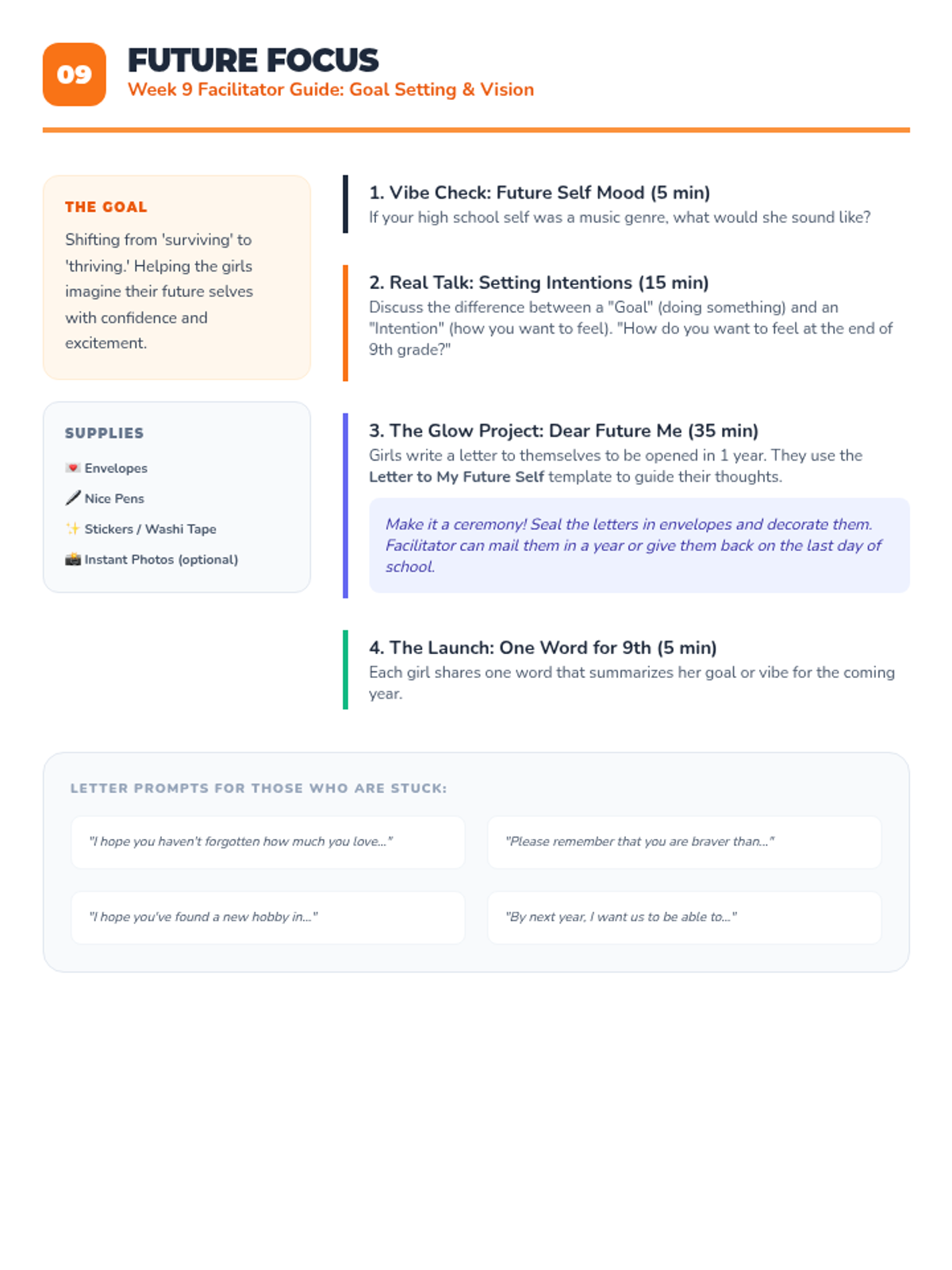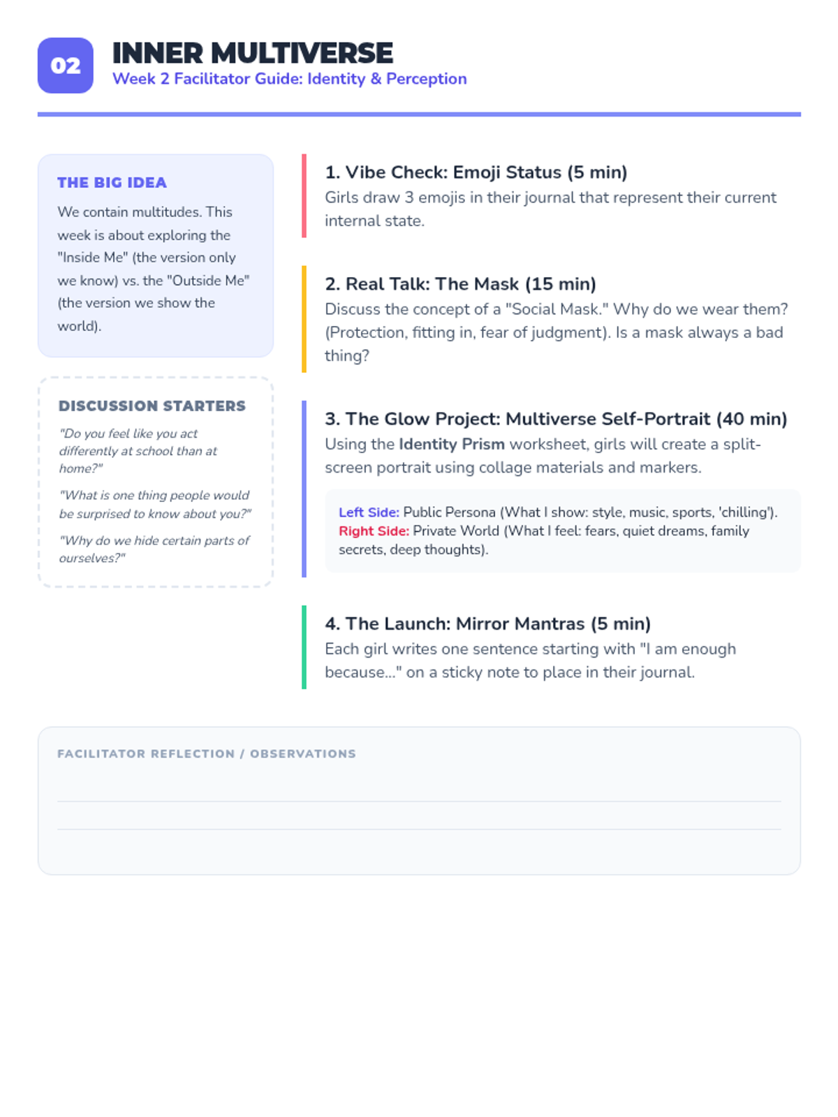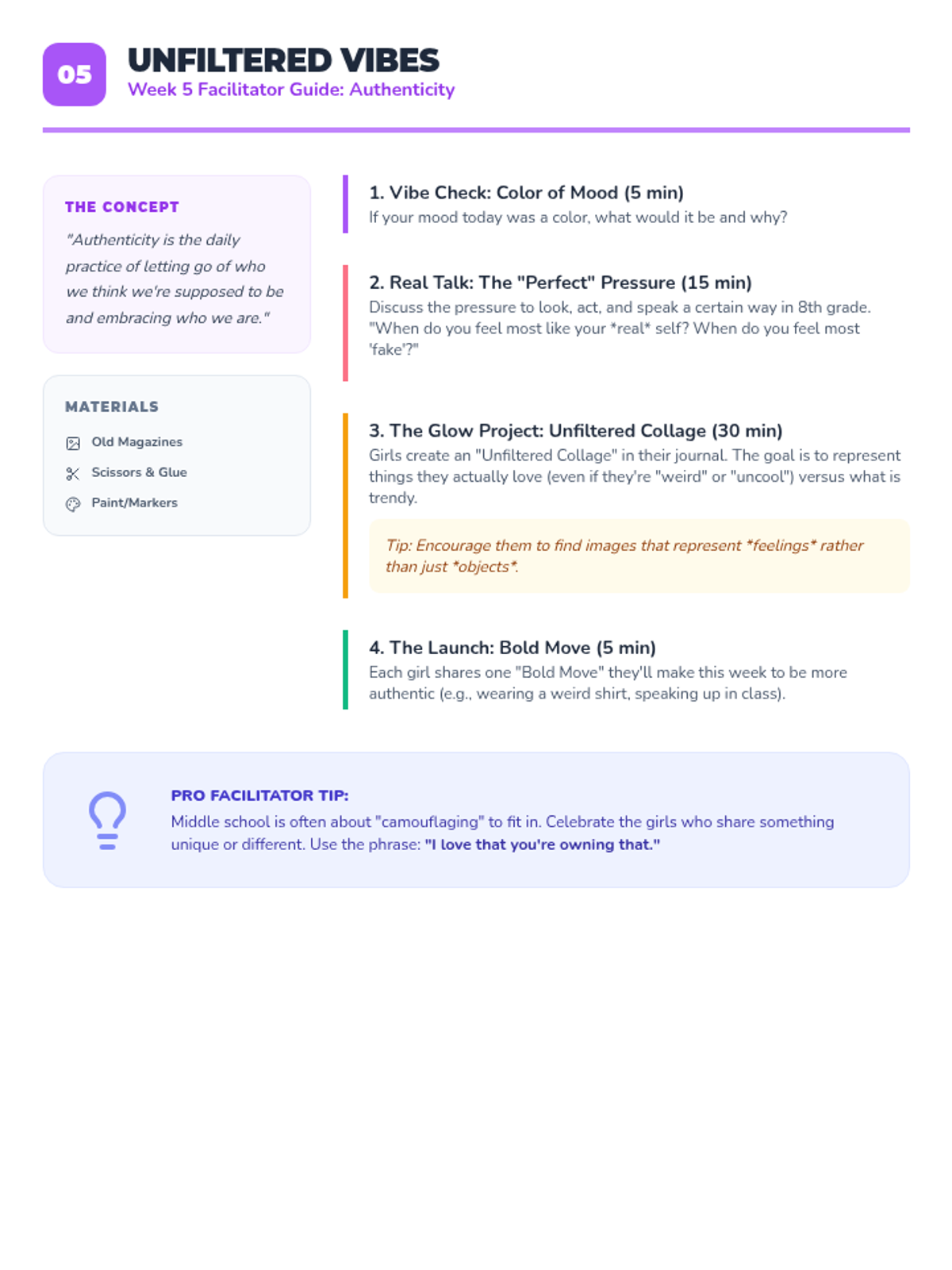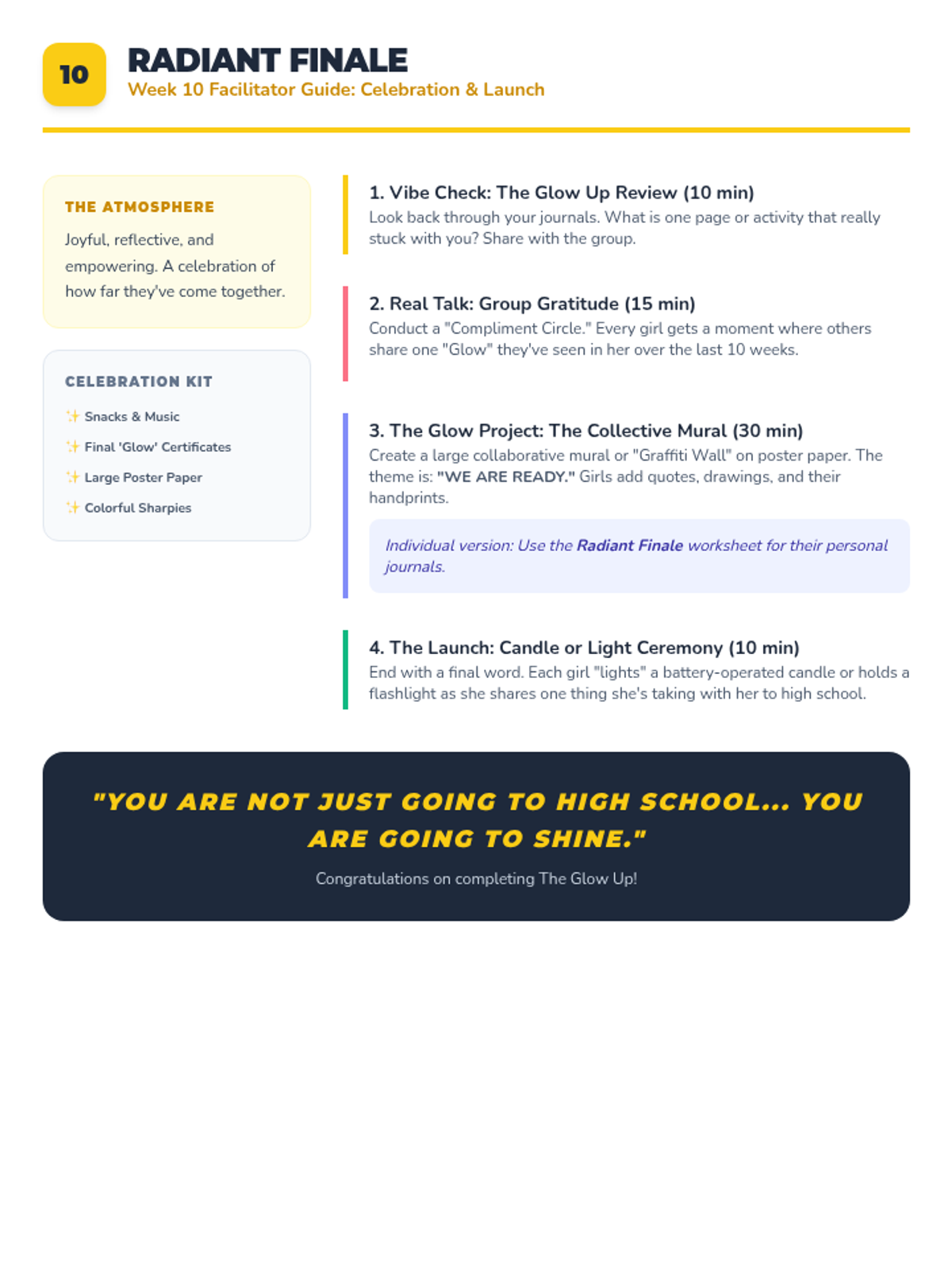 A 4-session small group counseling program for high school girls focused on identifying anxiety triggers, practicing mindfulness, and developing a personalized toolkit of coping strategies. The sequence emphasizes peer support, empowerment, and practical application within the school environment.