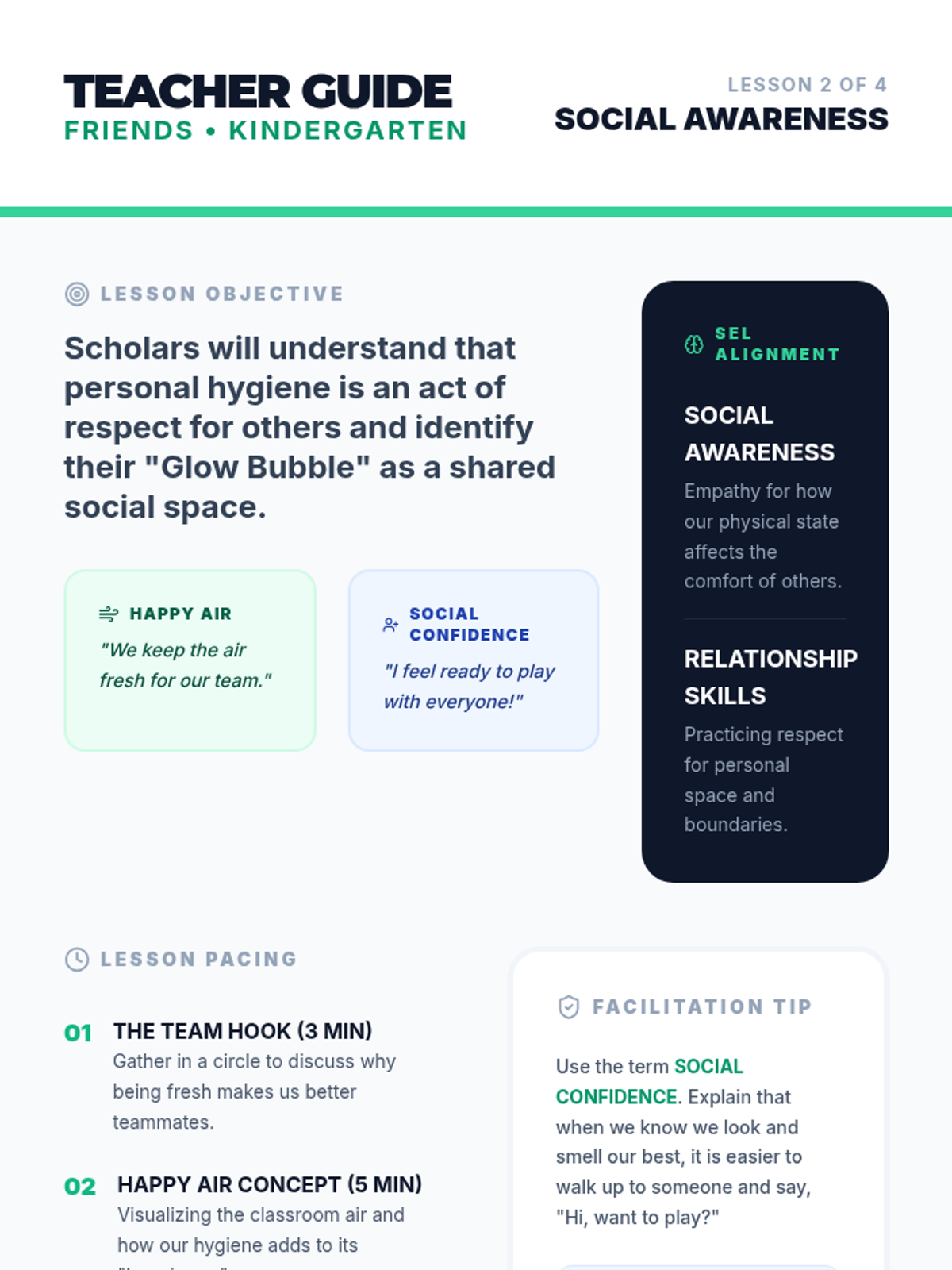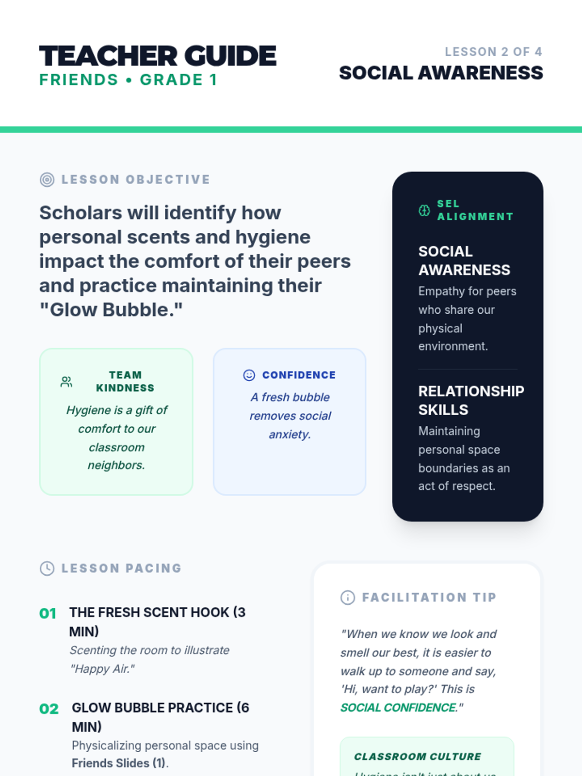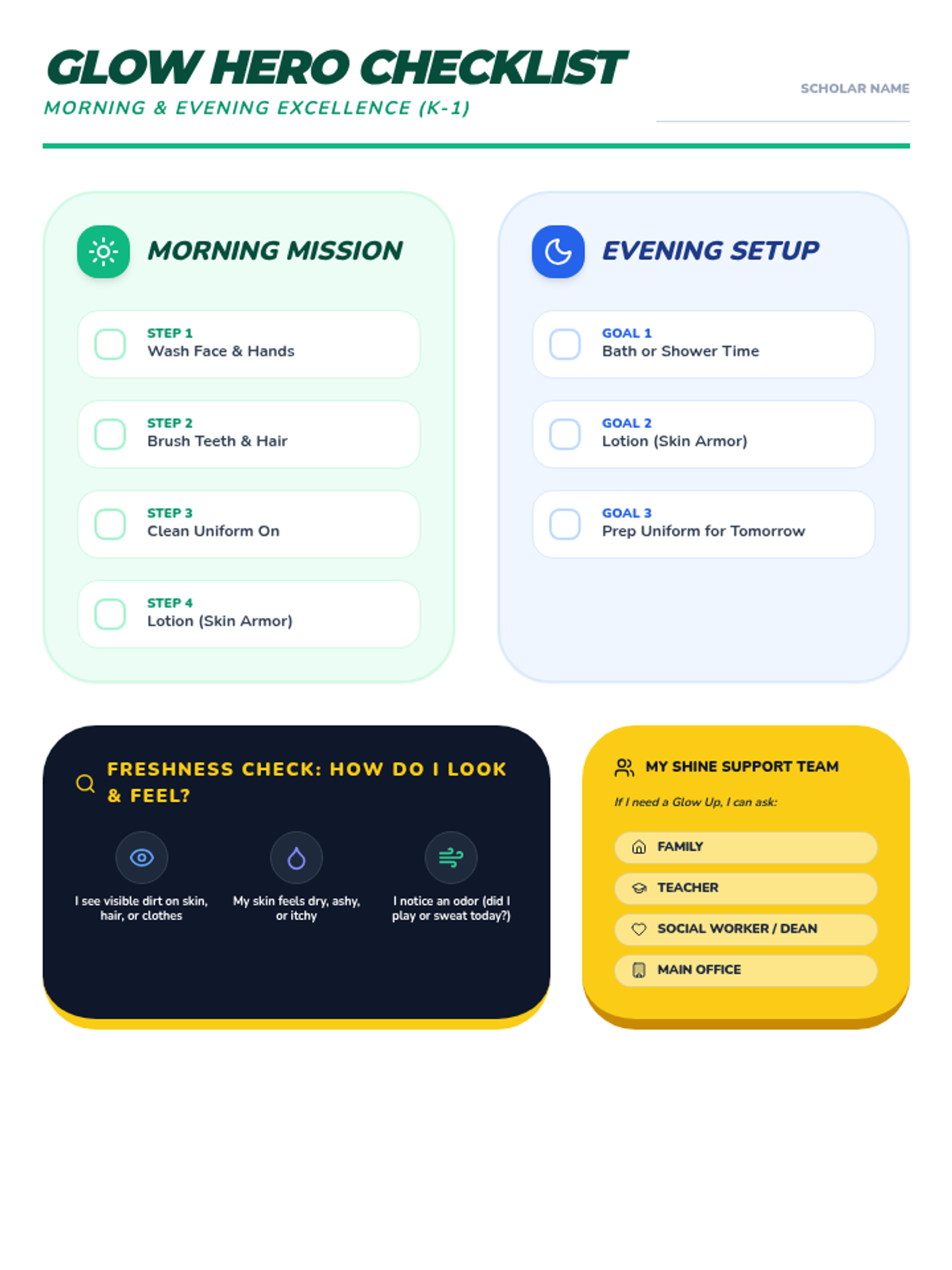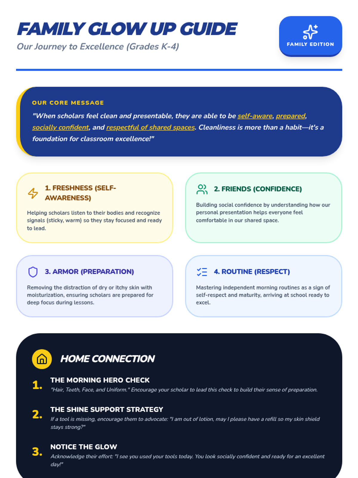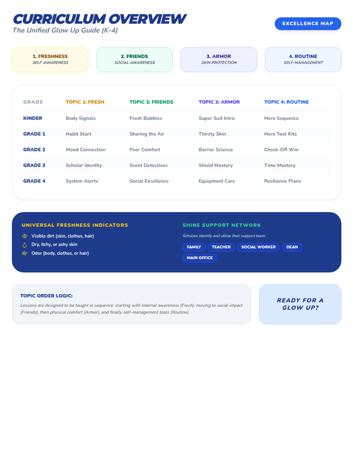 A comprehensive SEL-integrated hygiene curriculum for elementary scholars (K-4), focusing on self-awareness, social impact, and personal responsibility through the lens of a 'Glow Up'.